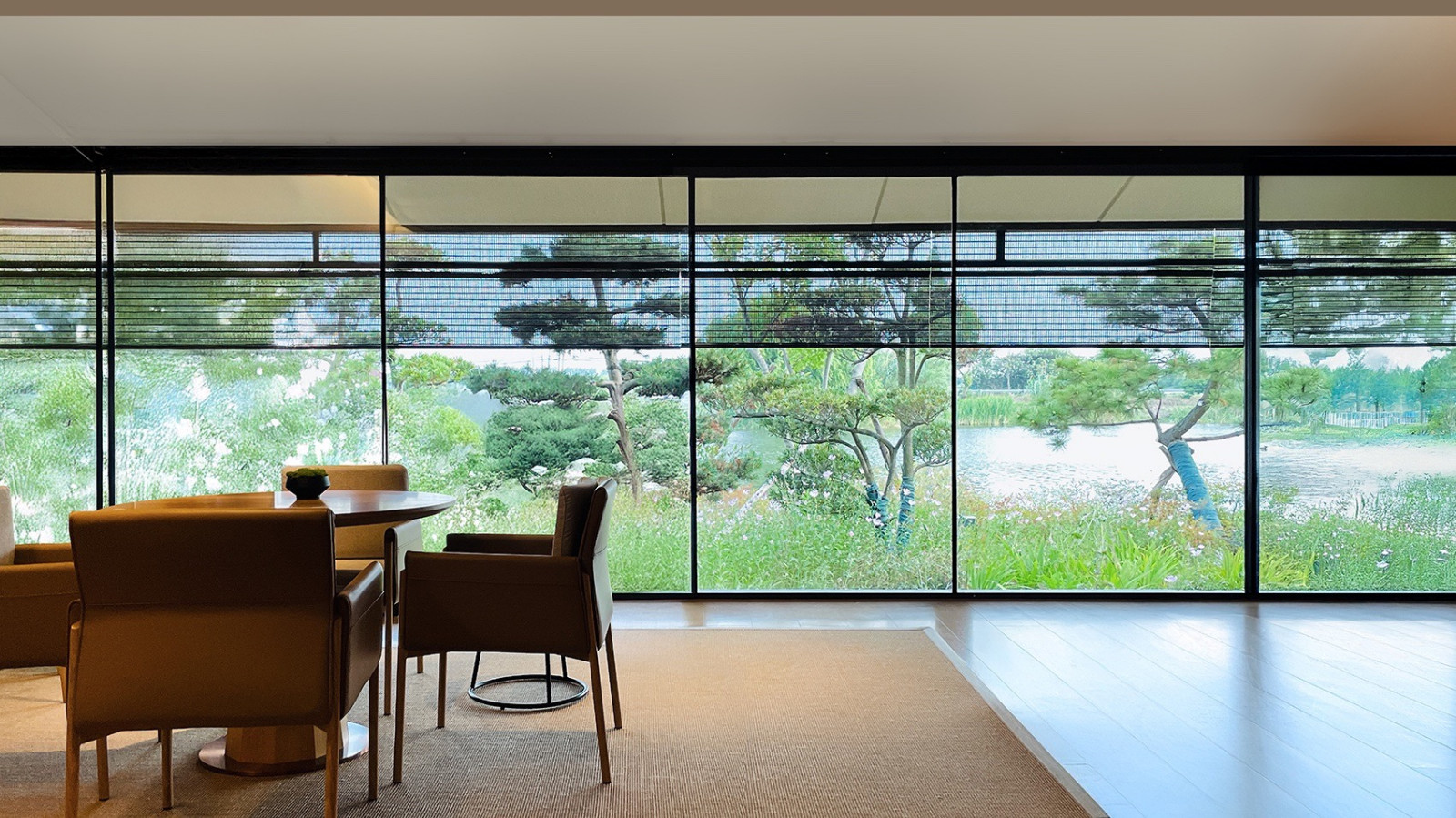 建筑高度控制在周边树木平均线以下,层高虽紧,却通过低坐起居、雪见障子上下分窗,让视线贴近地面,望见低处的远景。