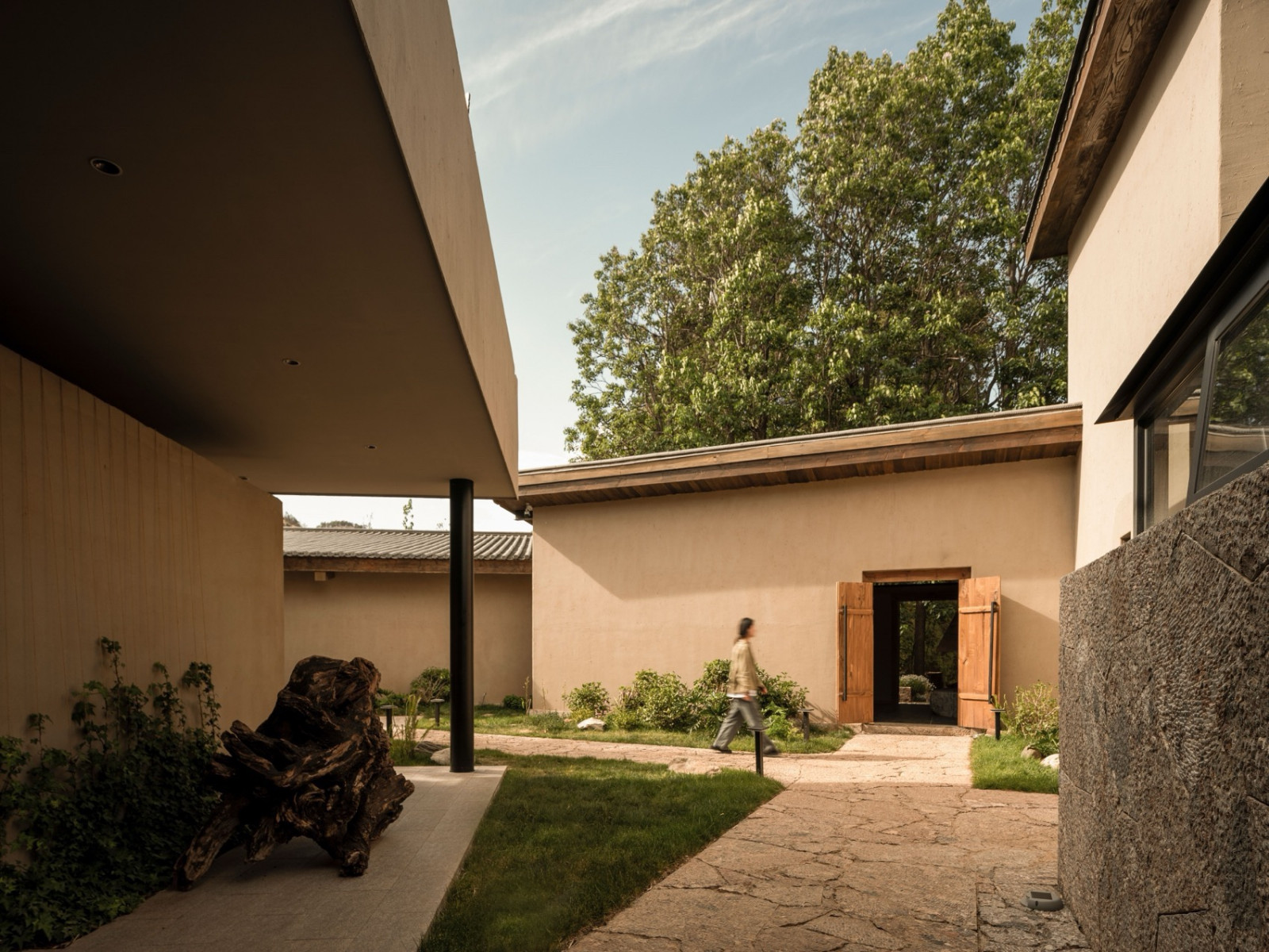 丽江束河古镇,一片楸树林环抱着由纳西族民居改建的深绿民宿。当地五花石手工垒砌的墙面温润亲和,错落的建筑由石板路相连,隐于绿荫。