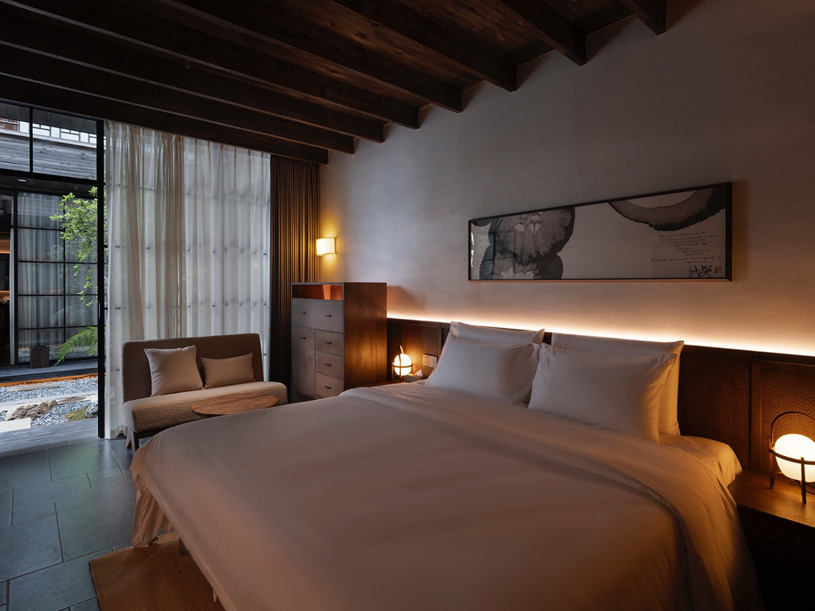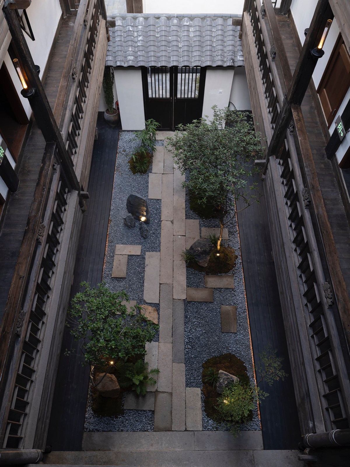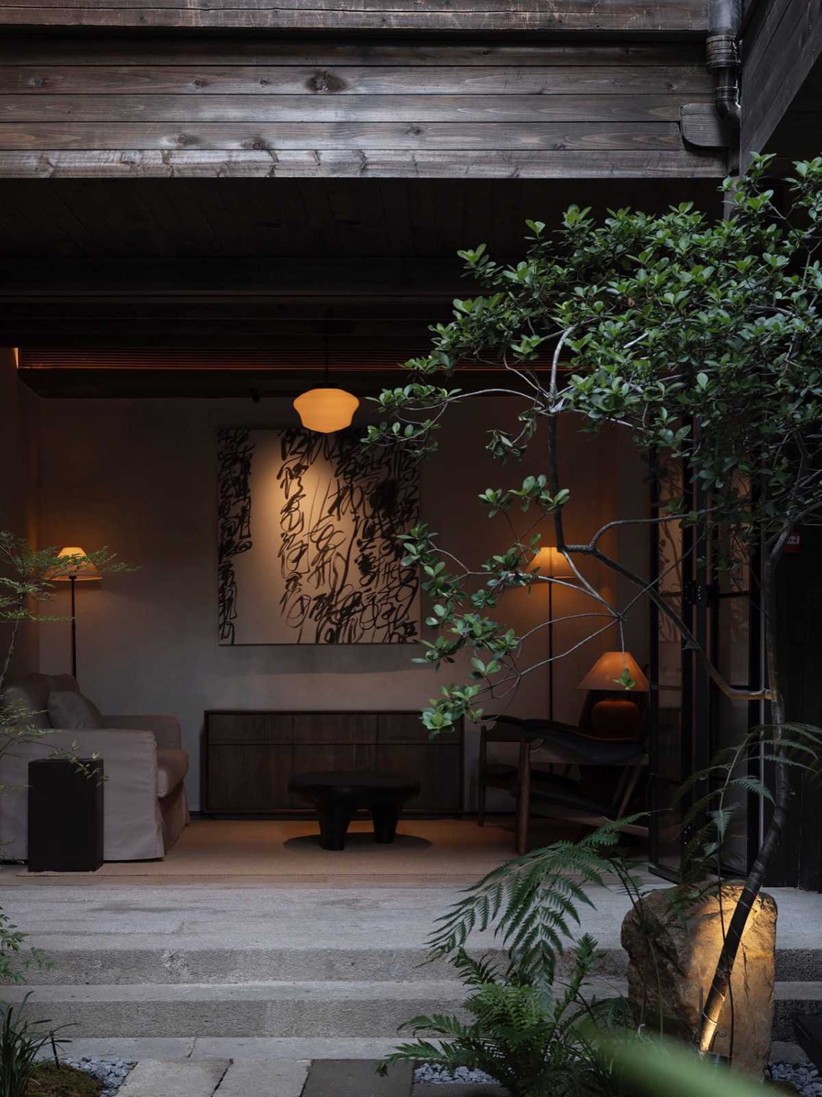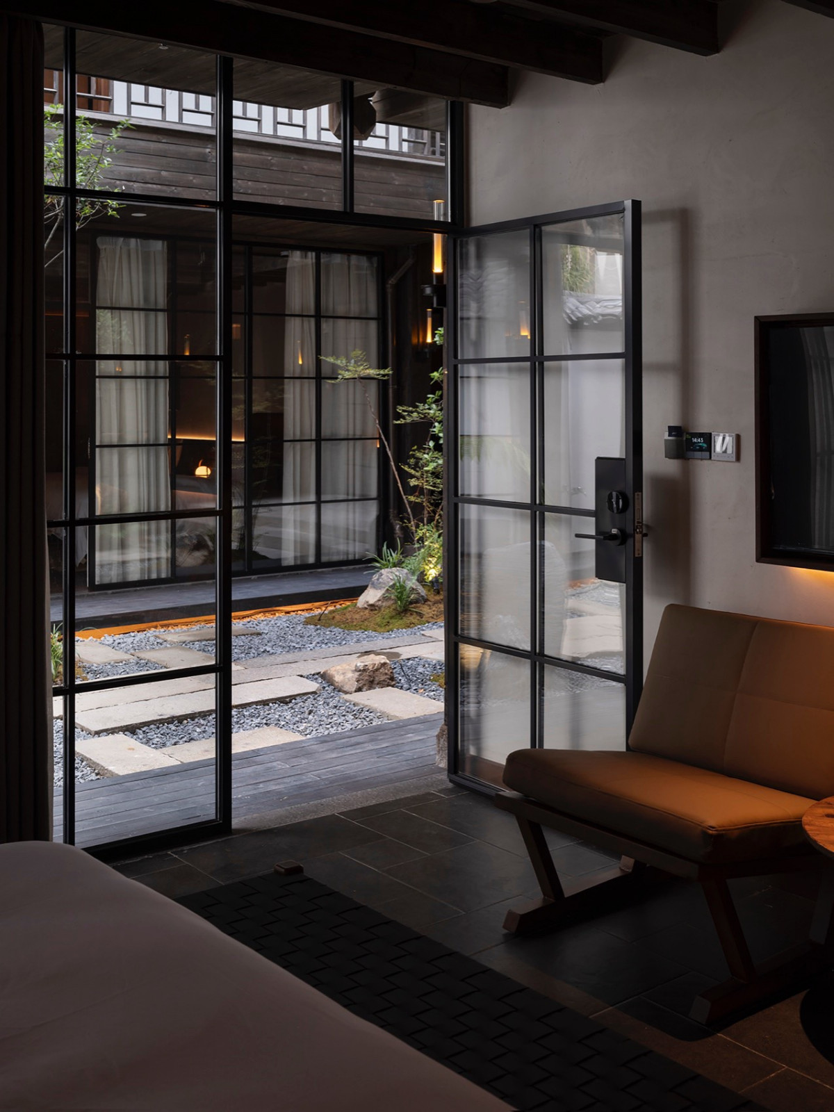 跨入酒店,喧嚣悄然褪去。登记前台空间安静,木质气息萦绕,视线从纷杂归于聚焦,脚步不自觉放缓。穿过斑驳钢板移门,外界彻底隔绝——客房围绕庭院铺展,静谧扑面而来。