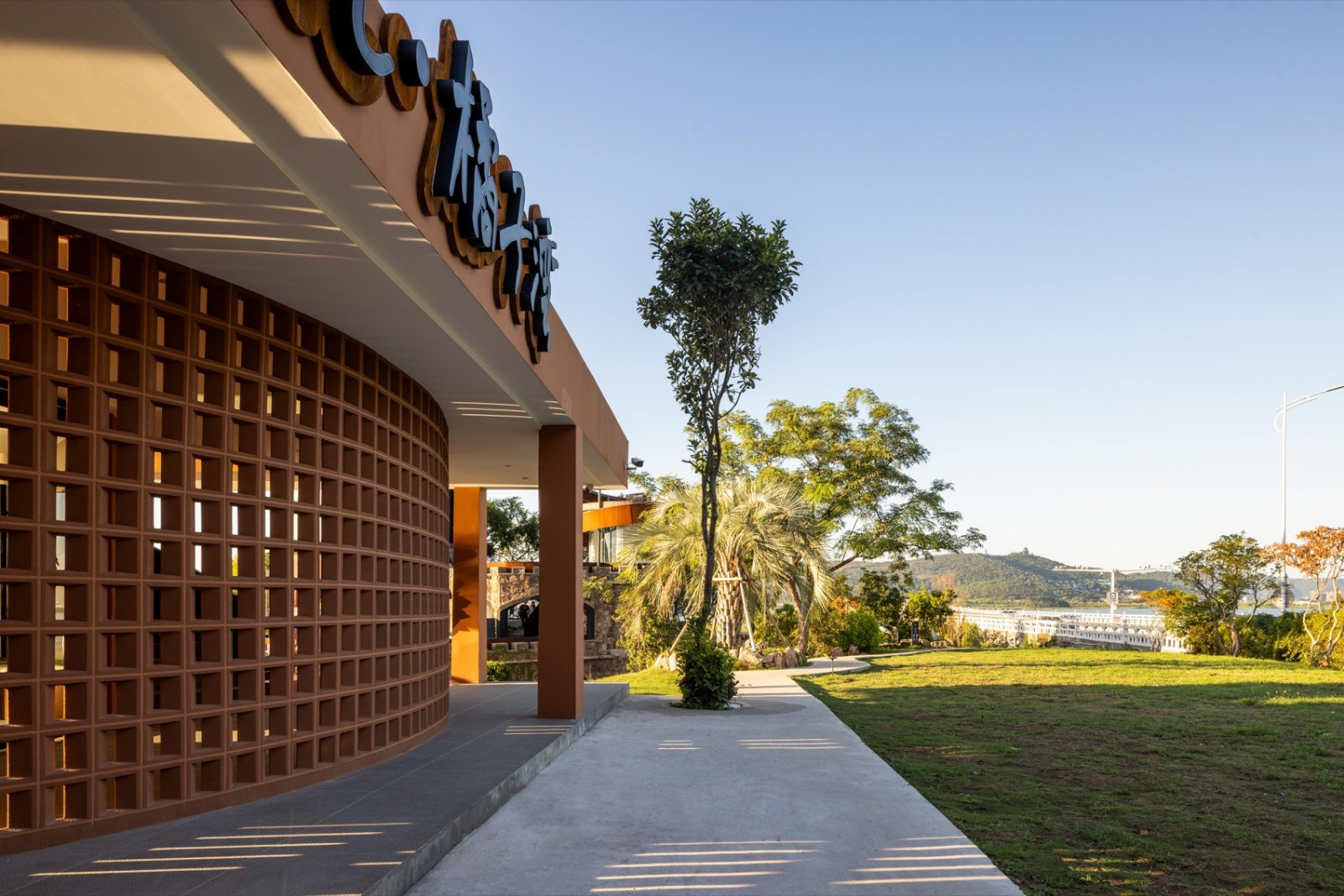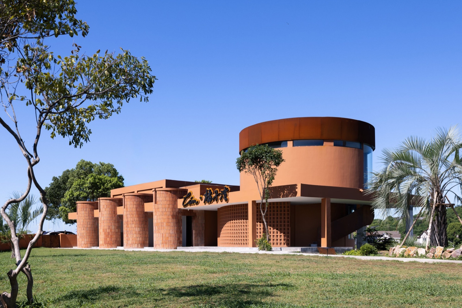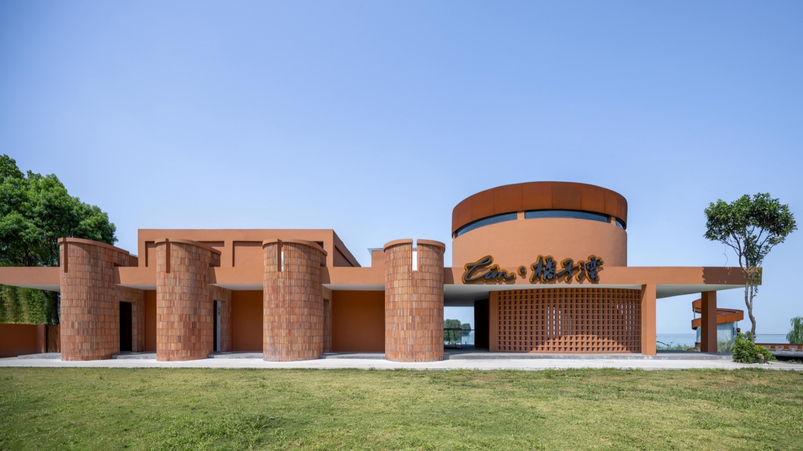 太湖大桥脚下,一座由存量改造与新建构成的民宿隐于山水之间。需驶过整座桥,方可窥见全貌——一个长方体与一个圆筒,通过大平台相连,以最简单的方圆,在湖光山色中构成几何的美感。