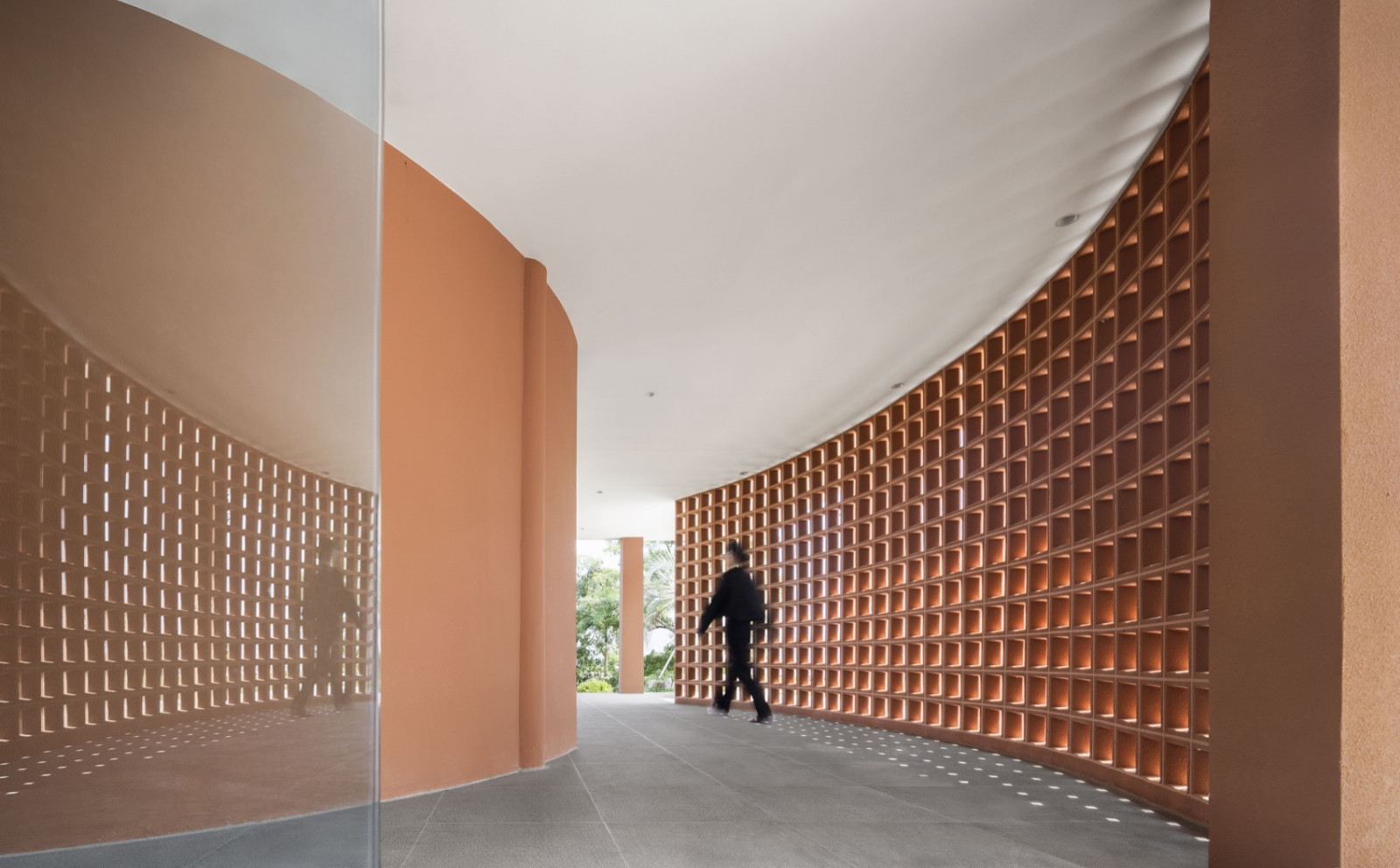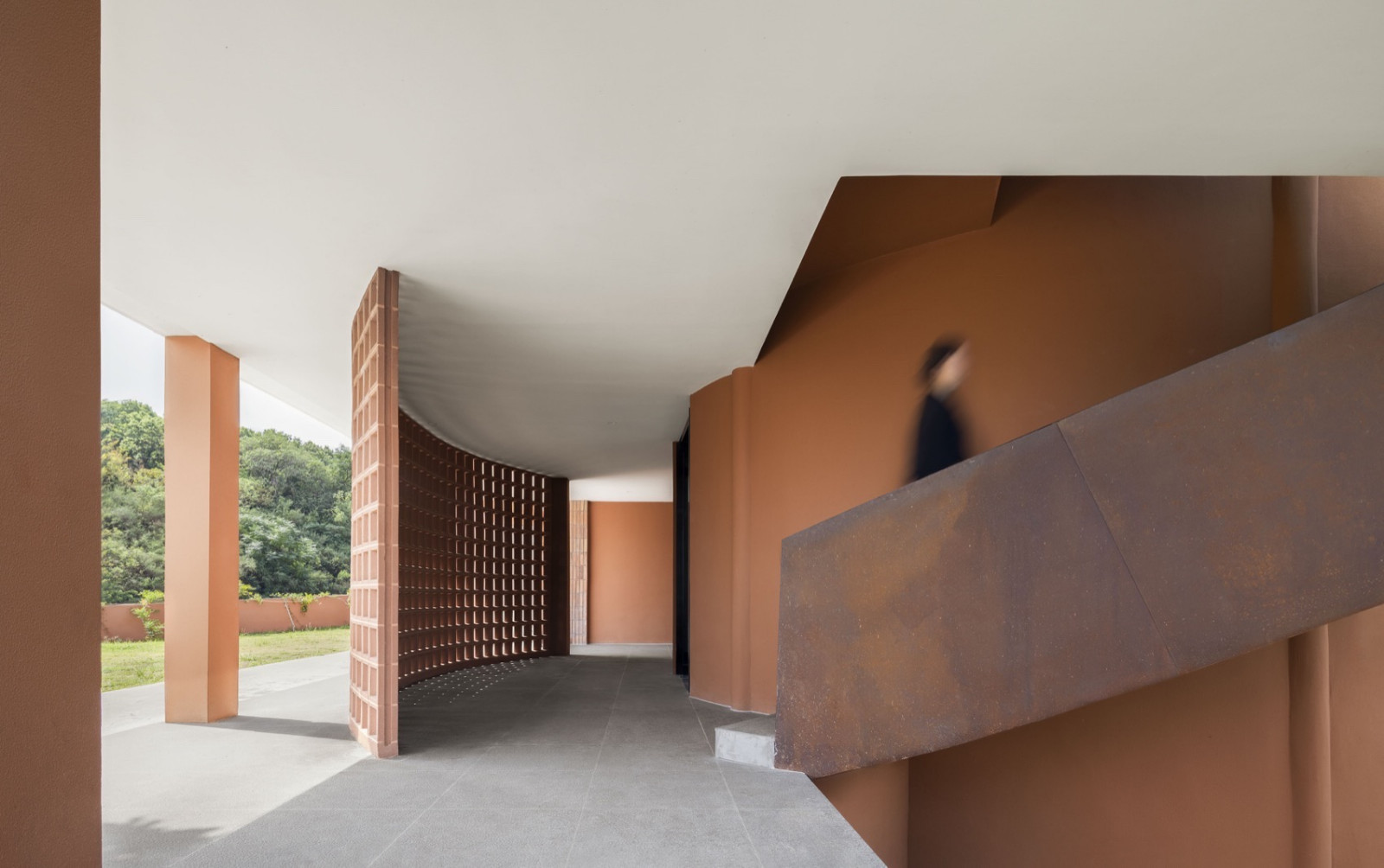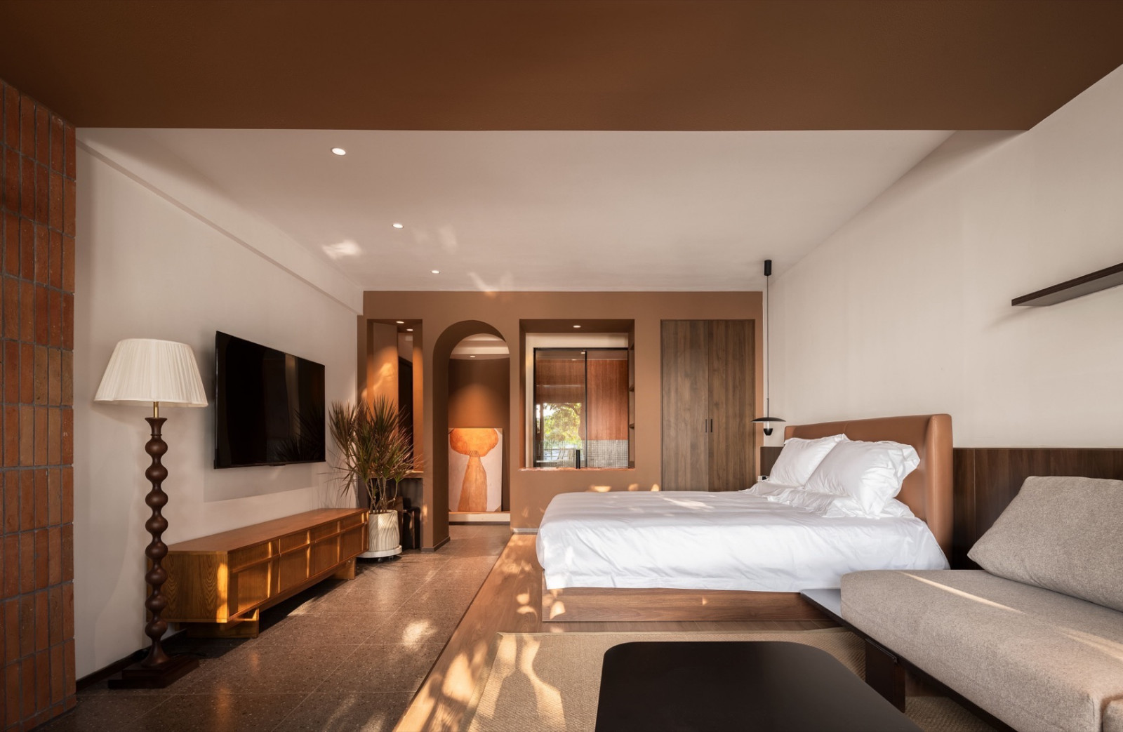 空间整体以陶土砖红为底色,灵感来自望向太湖的落日。粗糙质感涂料与陶砖贴面相互衬托,同色系不同材质让立面丰富而克制。夕阳西下时,建筑既是框景的画框,也是被晚霞浸染的视觉主体。