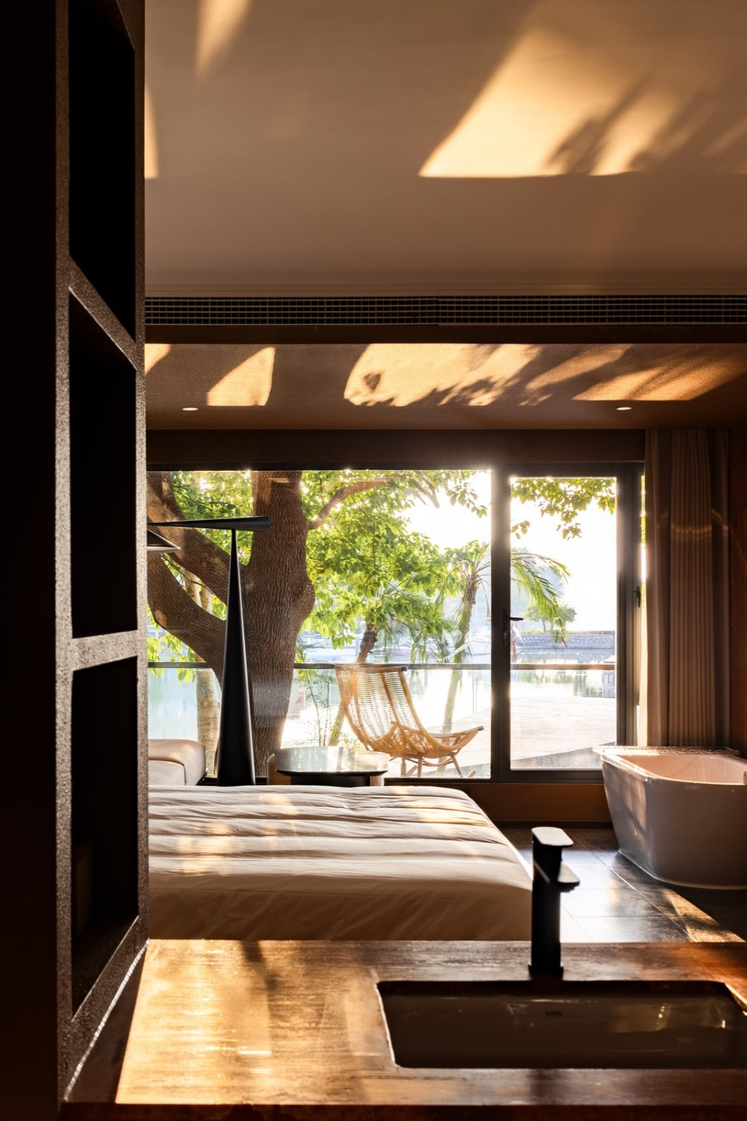 圆筒改造后,一层为接待空间,落地窗面向湖面敞开。长方体主体均匀分布八间客房,LOFT与天窗房型穿插其间。顶部开敞的入户圆柱呼应着存量圆筒,随天气变化漏下不同的光影雨雪——踏入此处,外界的喧嚣便悄然隔绝。