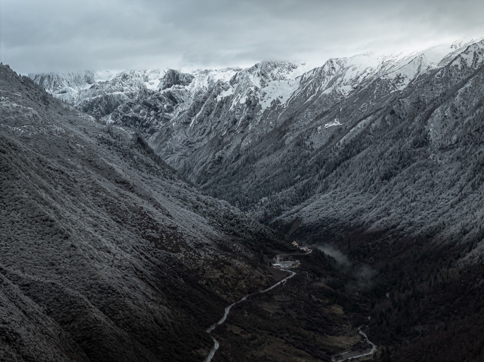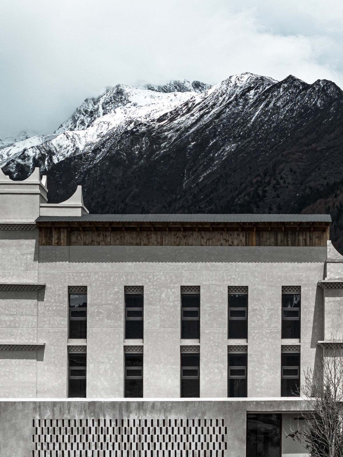 四姑娘山脚下,星山月影静卧于斯古拉神山的褶皱里。入口透光片墙引导着步伐,高原阳光洒落,在墙面投下富有节奏的阴影。行至尽头,半阙山水以“请”的姿态安置——那是精神的缩影。