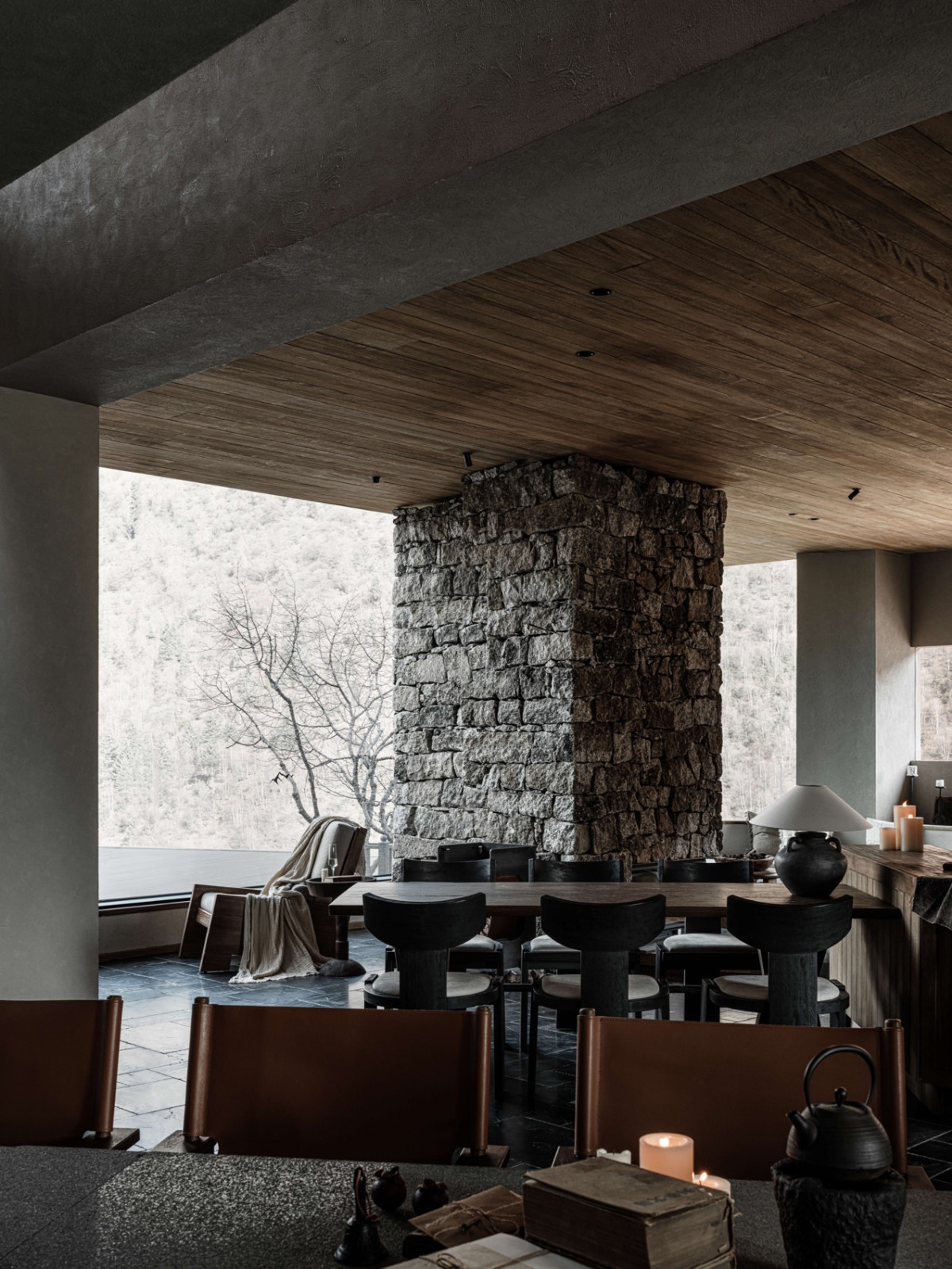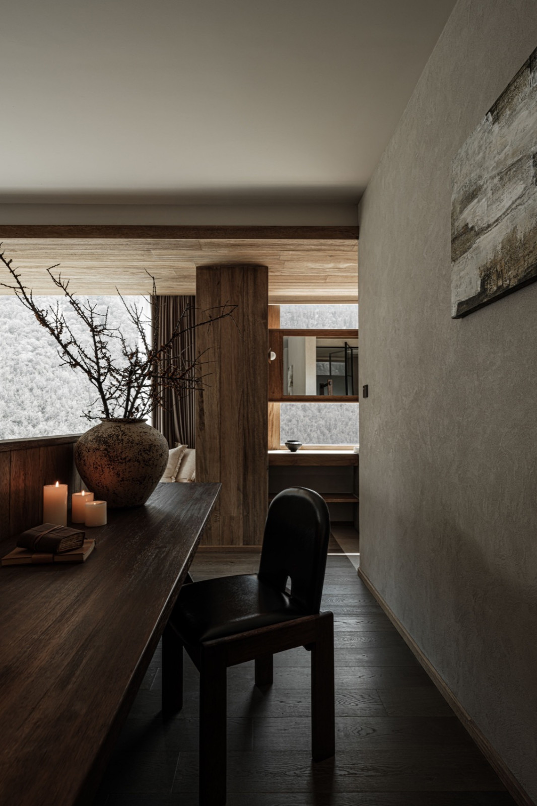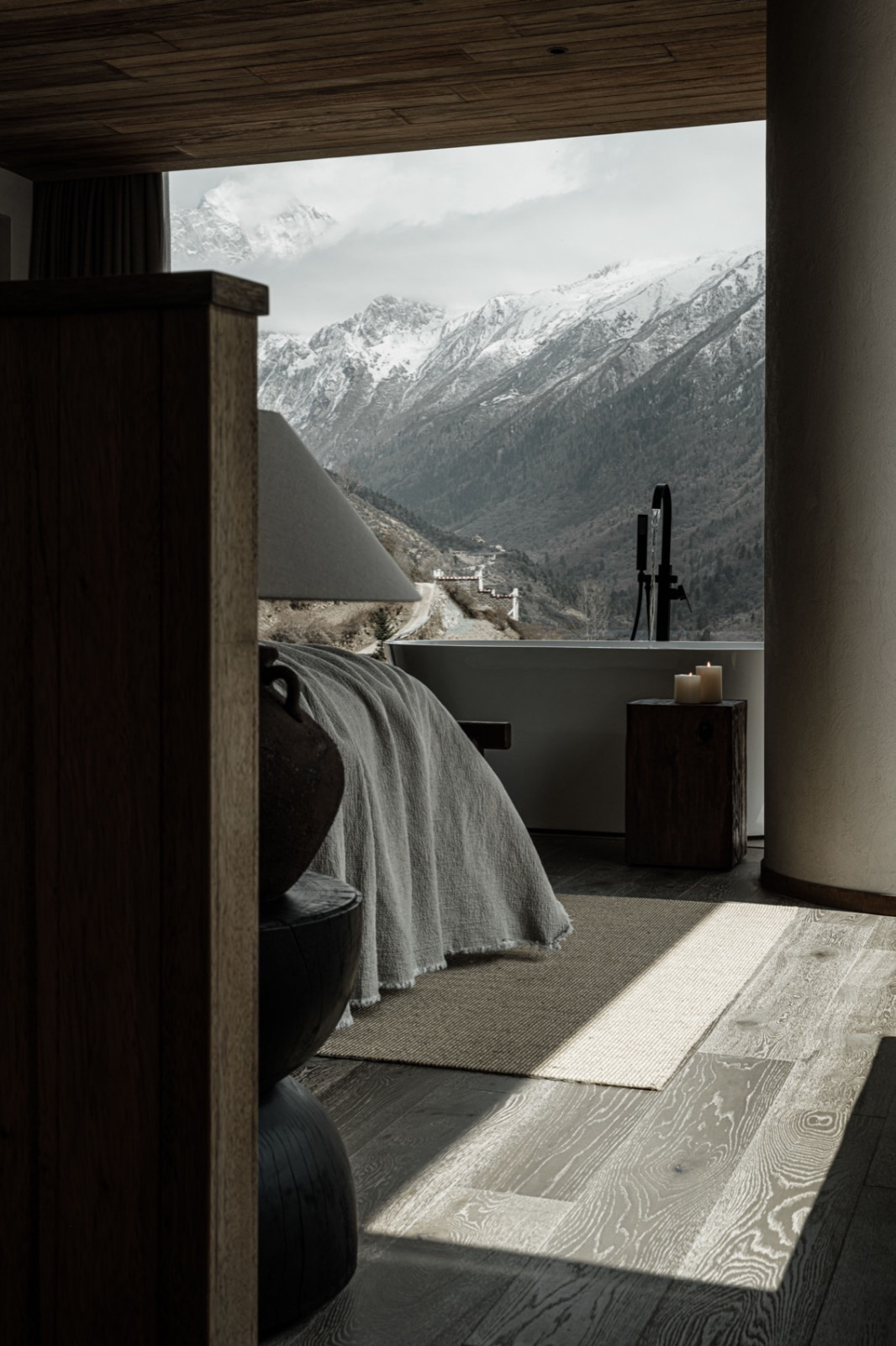 火塘边落地窗外,四季更迭的落叶林一直延伸到积雪的幺妹峰。楼梯折线般雕塑感向上,走廊光影再次浮现。客房内实木温润,光影柔和,时间的流逝有迹可循。