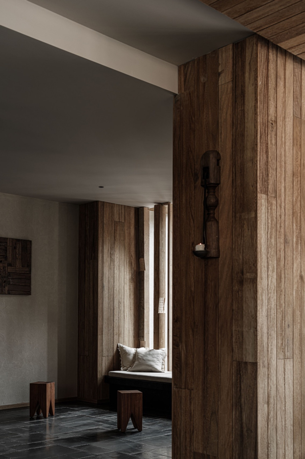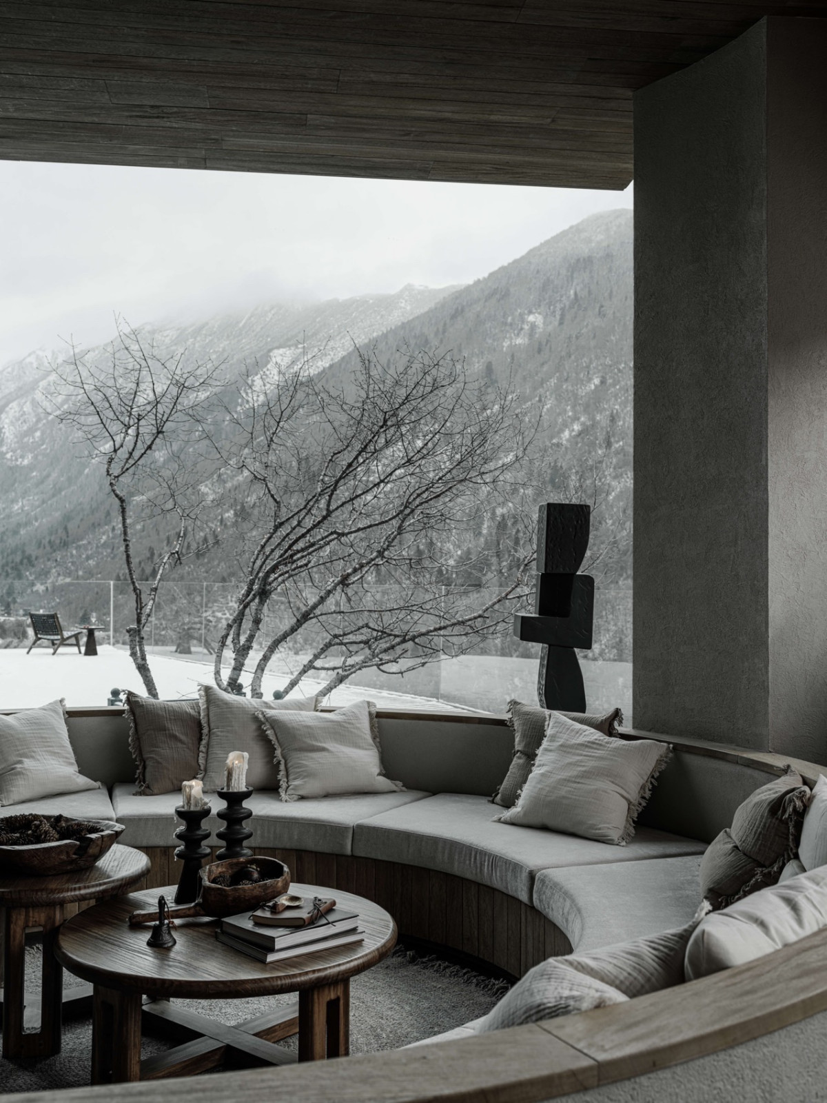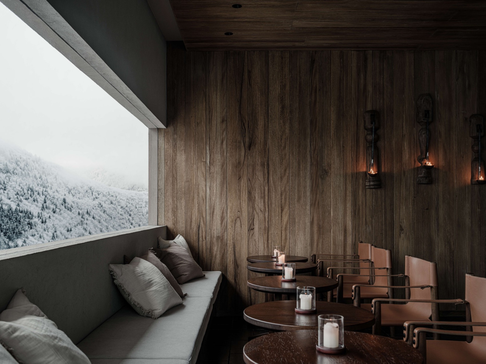 火塘边落地窗外,四季更迭的落叶林一直延伸到积雪的幺妹峰。楼梯折线般雕塑感向上,走廊光影再次浮现。客房内实木温润,光影柔和,时间的流逝有迹可循。