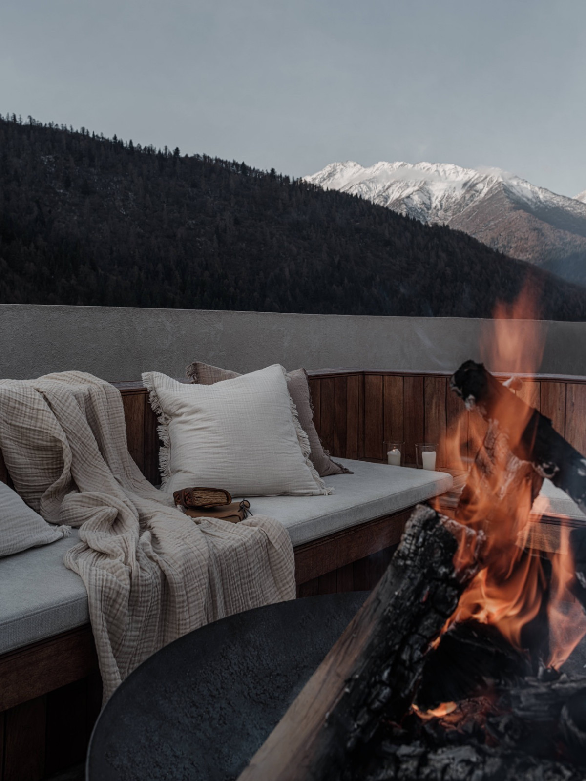 顶楼露台彻底敞开,毕剥作响的火塘与露天浴场,看日照金山,观隆冬飘雪。人置身其中,被催化、被感知——最终成为眼前美好景象的一部分。