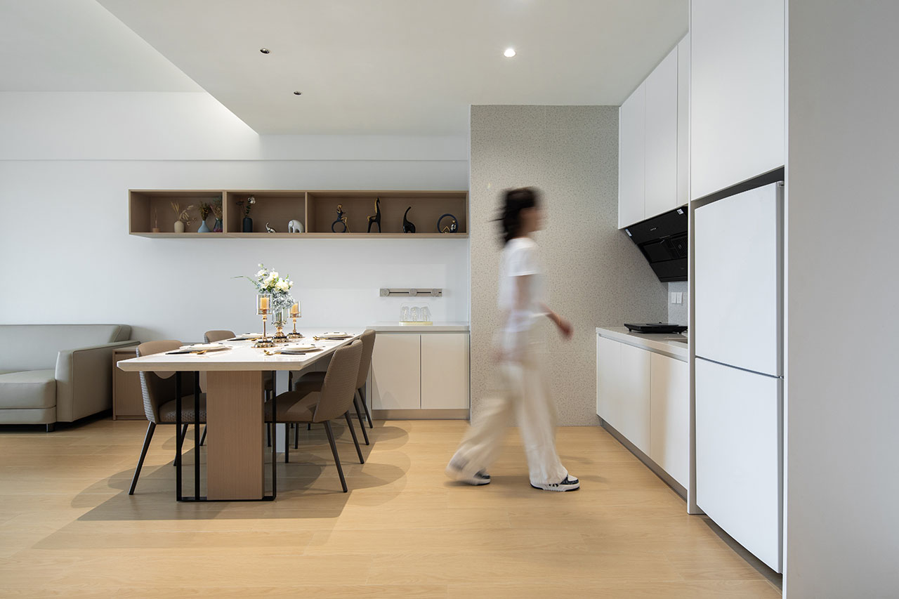 由大美整木定制的木饰面,沉稳低调,散发着温暖自然的质感;仿白橡木木地板砖的运用,融合现代简约与轻奢风格,提升了空间的温馨格调。