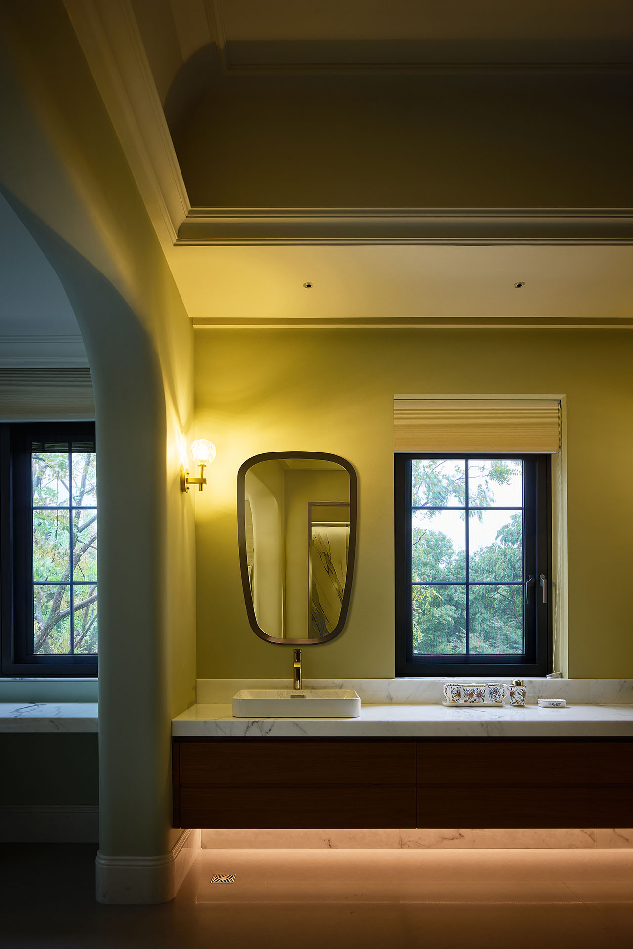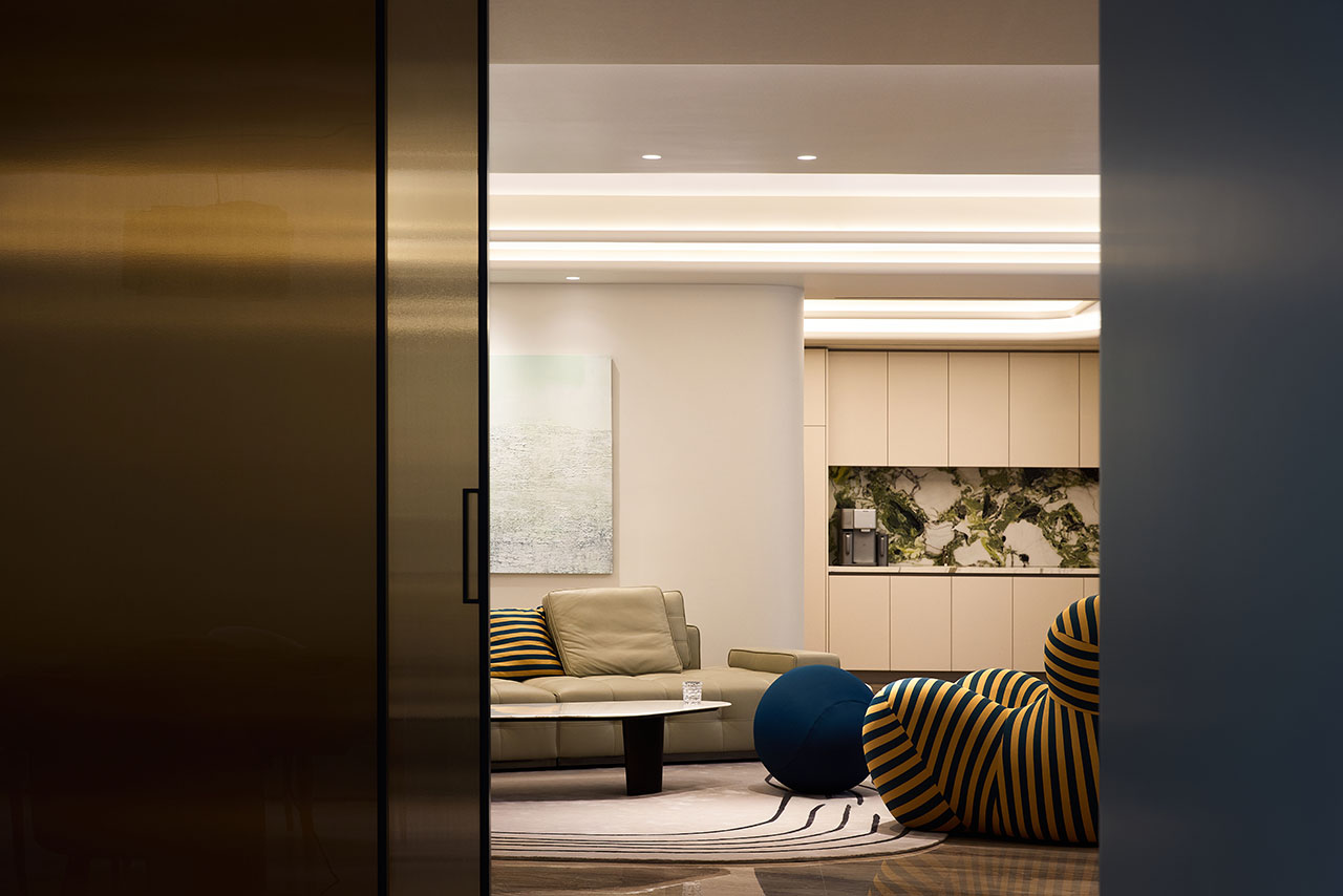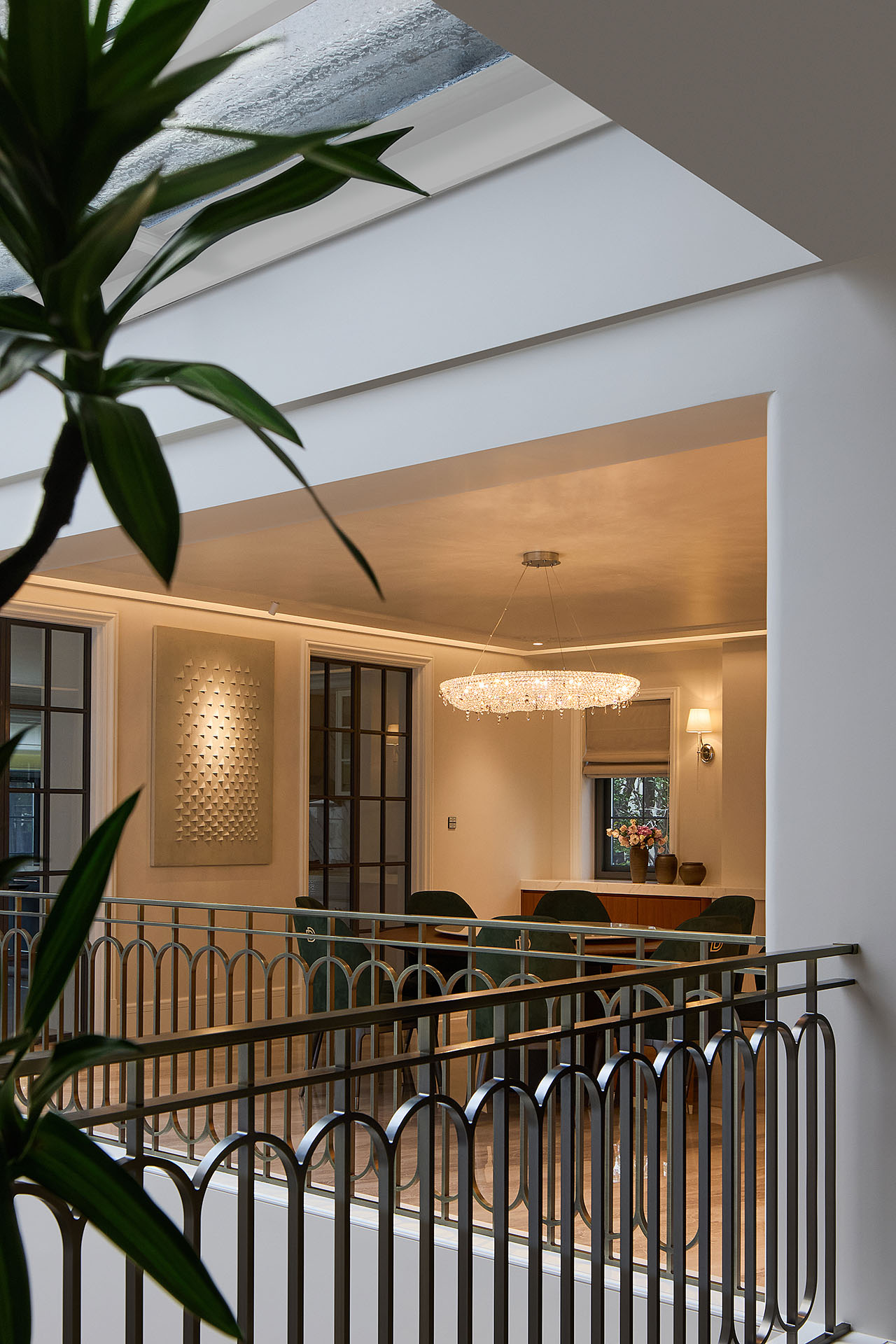 在改造前,地下室昏暗而不合理的布局让空间显得压抑。设计师通过梳理建筑空间,调整结构,巧妙地解决了地下室的采光与通风问题。别墅的设计中最引人注目的部分是中央的中庭。它不仅是光线与空间的交汇点,更是整个居住体验的灵魂所在。中庭的开放设计让阳光从上方洒下,形成一片片温暖的光斑,穿透到地下室和一层。这些光斑随着时间的推移而变化,犹如一幅动态的画卷,时刻在提醒着我们时间的流逝与生活的美好。