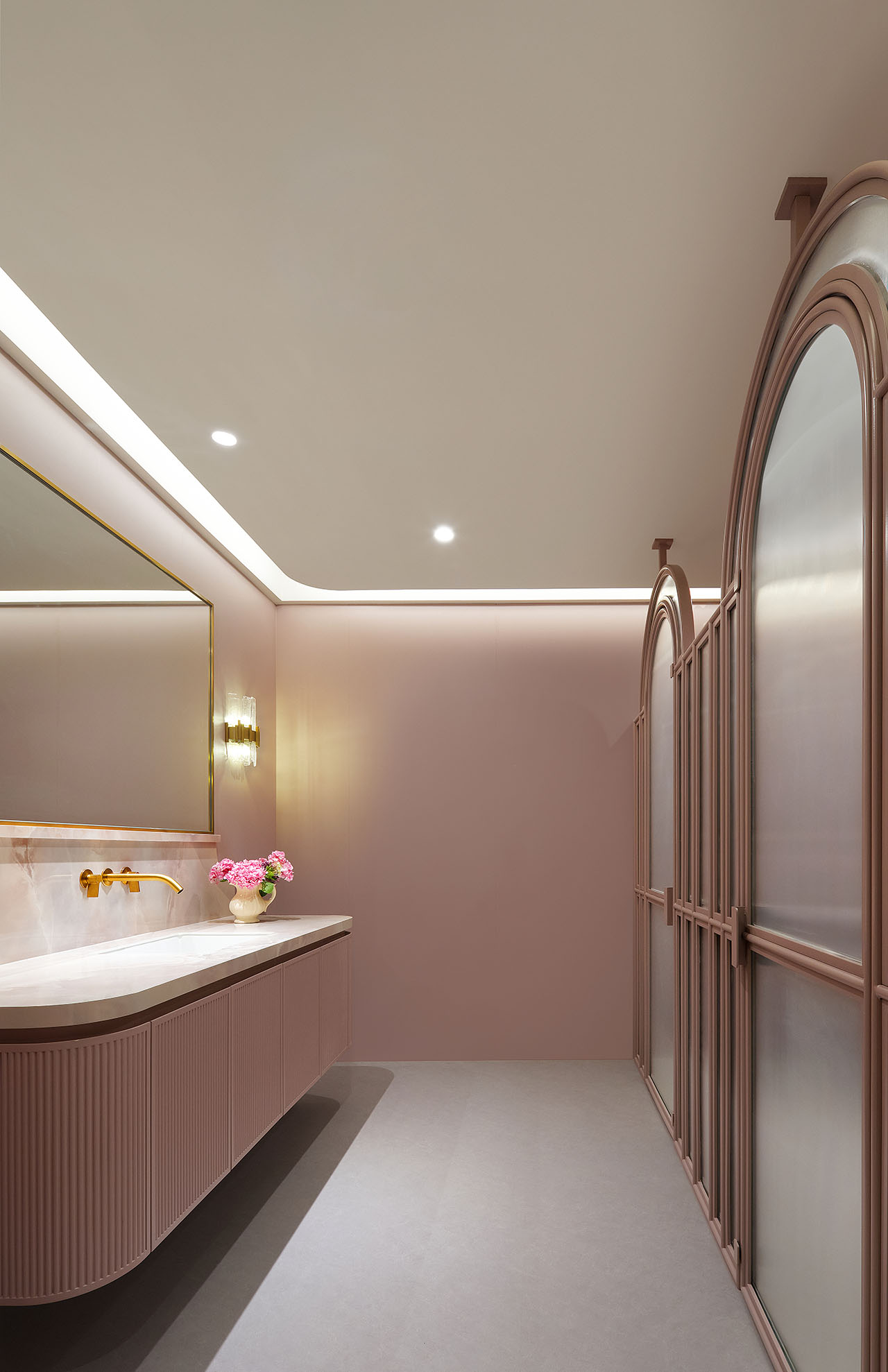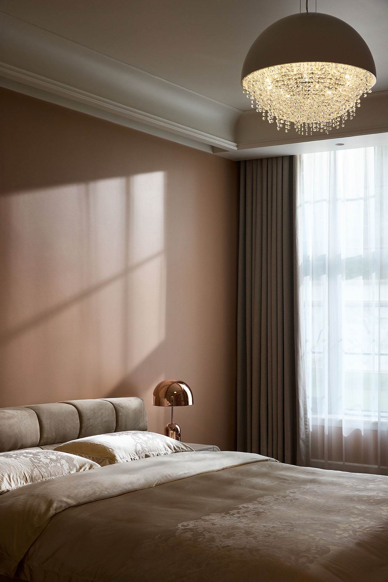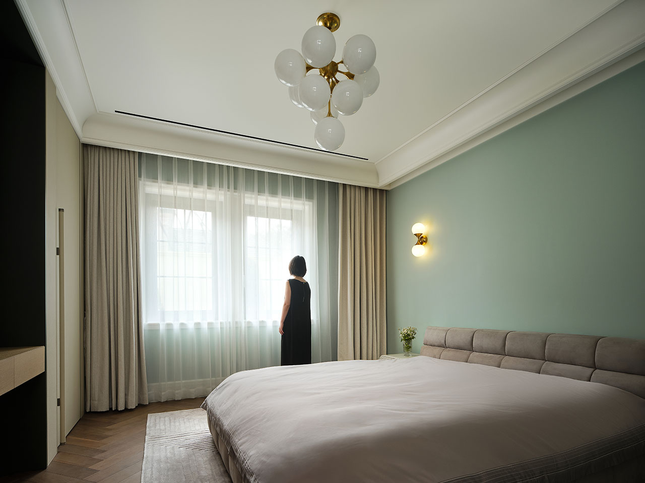 设计师以简约为设计思路,整体色彩以灰、米、咖为主,搭配绿色、藕粉色,线条利落流畅,存粹干净,无需复杂装饰,一眼感高级的质感,奠定品质家居生活的基调。