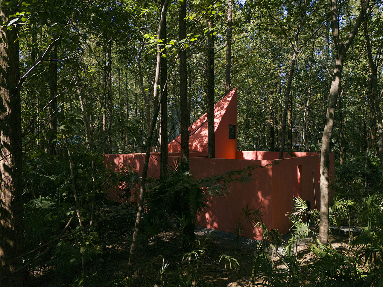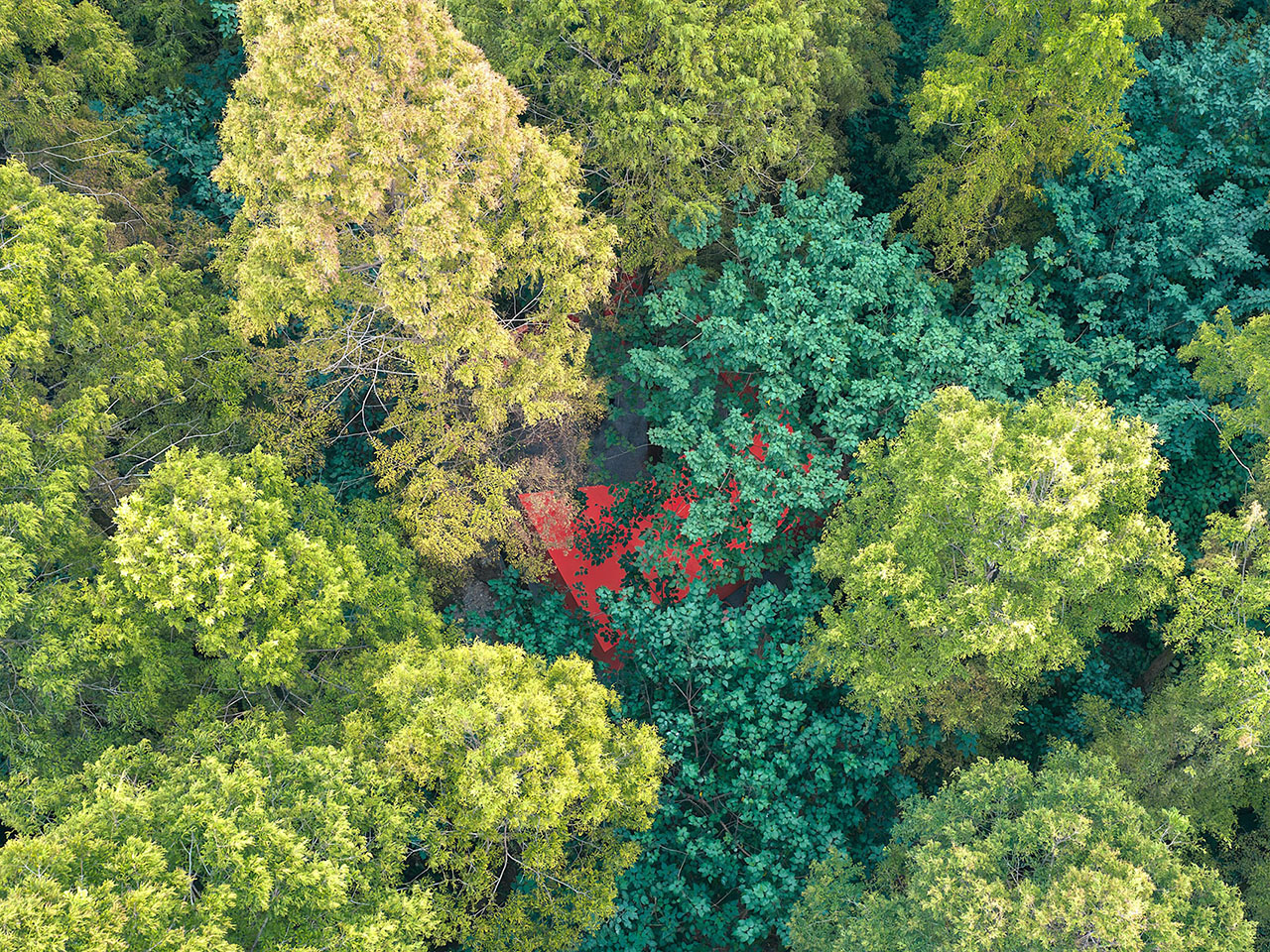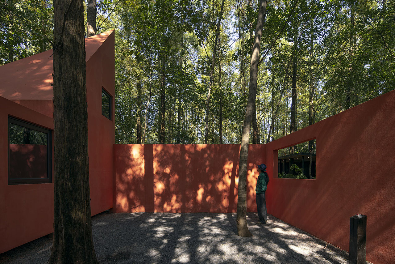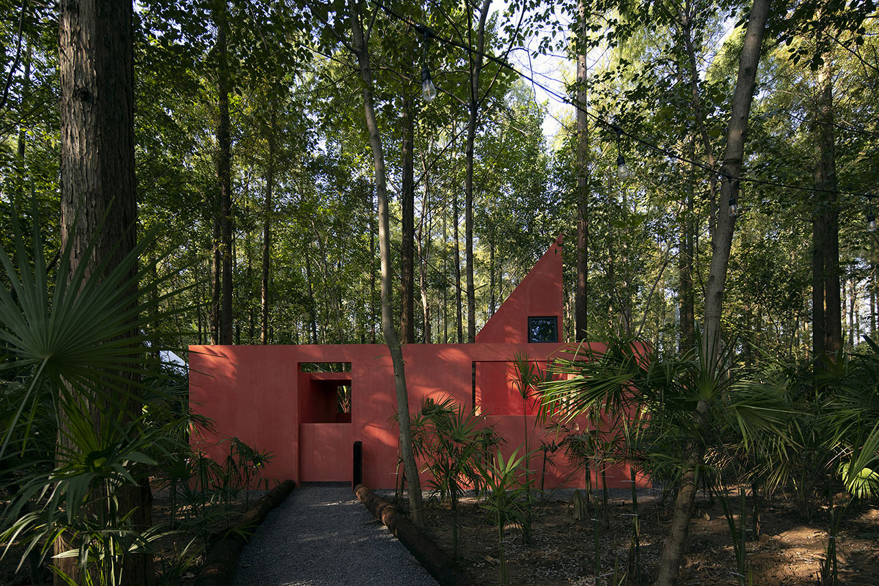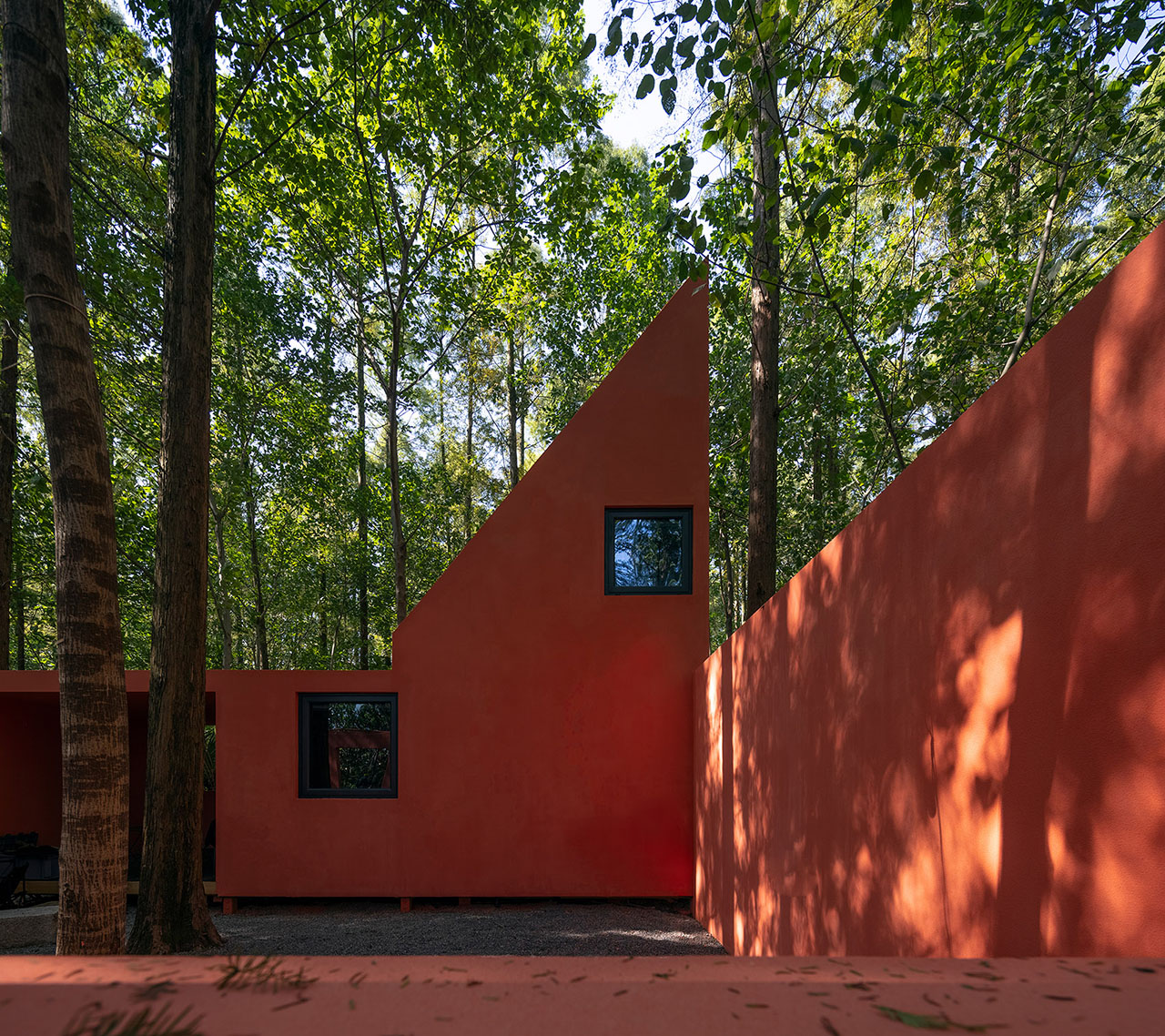 木屋的灵感源自林间候鸟,其醒目的红色外观犹如一只栖息于林中的飞鸟,成为自然中的独特舞台。设计根据现有树木定位,采用全架空装配式木结构,不破坏地表与植被,维系了水杉林的原生状态。围合的院落空间与林木相互渗透,营造出“林中有屋,屋中有林”的静谧度假场景。