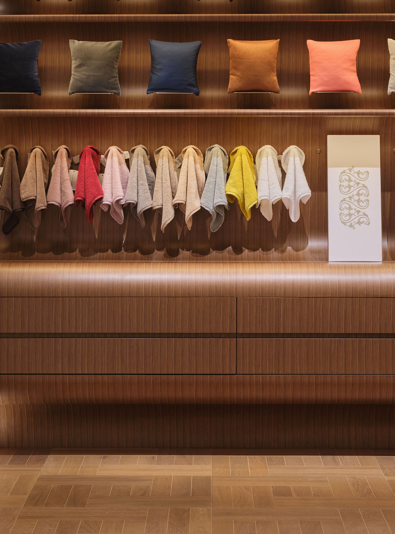 Bespoke定制区承载了品牌的核心。面料图书馆如同织物的档案馆,陈列着各种布料、刺绣样本与色卡,突出品牌在面料工艺上的精致表达。胡桃木展架与矮柜以流畅曲线勾勒轮廓,呈现温润的质感。分层陈列的面料样本如一幅立体的织物色谱,直观展示面料的肌理差异。顾客可自由取样、触摸、搭配,设计打造属于自己的家居方案。
