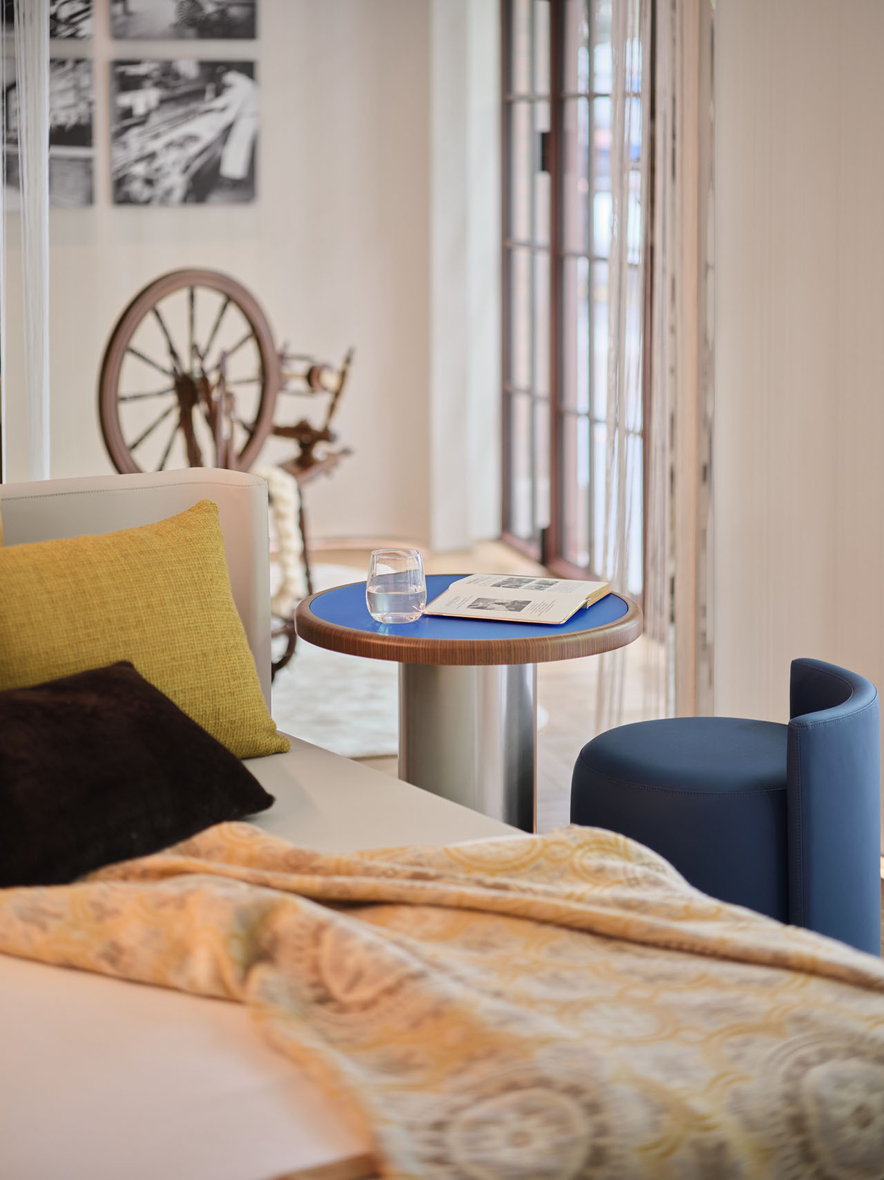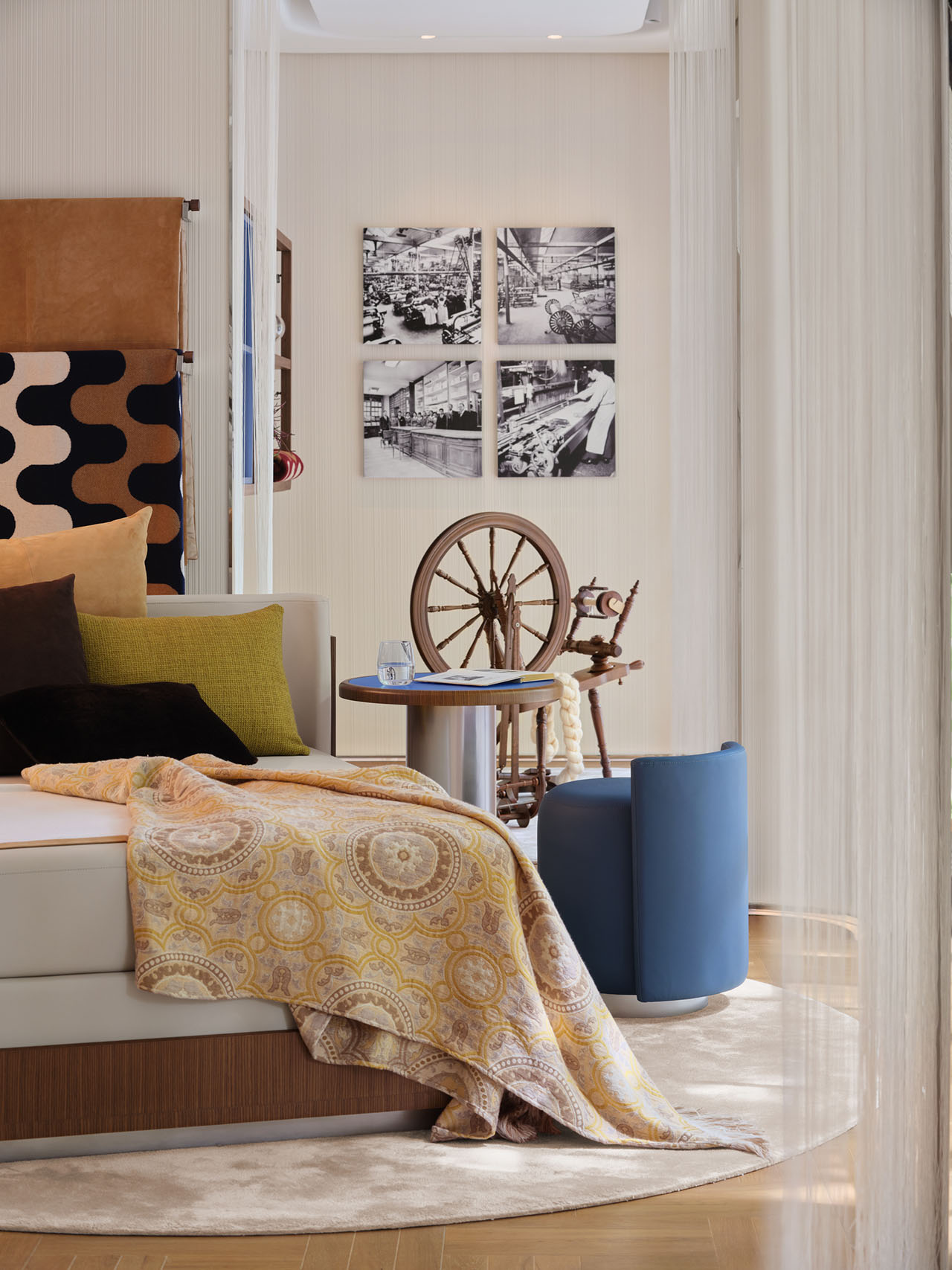 行至动线的终点,展览区将百年织艺的时空对话凝练成一处可触摸的工艺剧场,品牌脉络在此具象化。中古织机装置与日间小憩沙发并置,构建停留、洽谈的场景。墙面黑白历史照片记录蒙扎工坊织机运转、工匠手作的影像,展示品牌从手工织艺到奢华家居的传承。