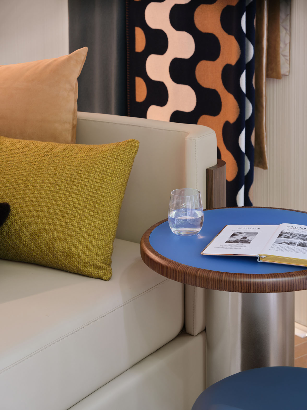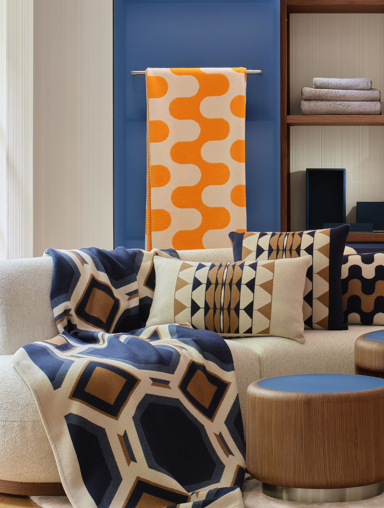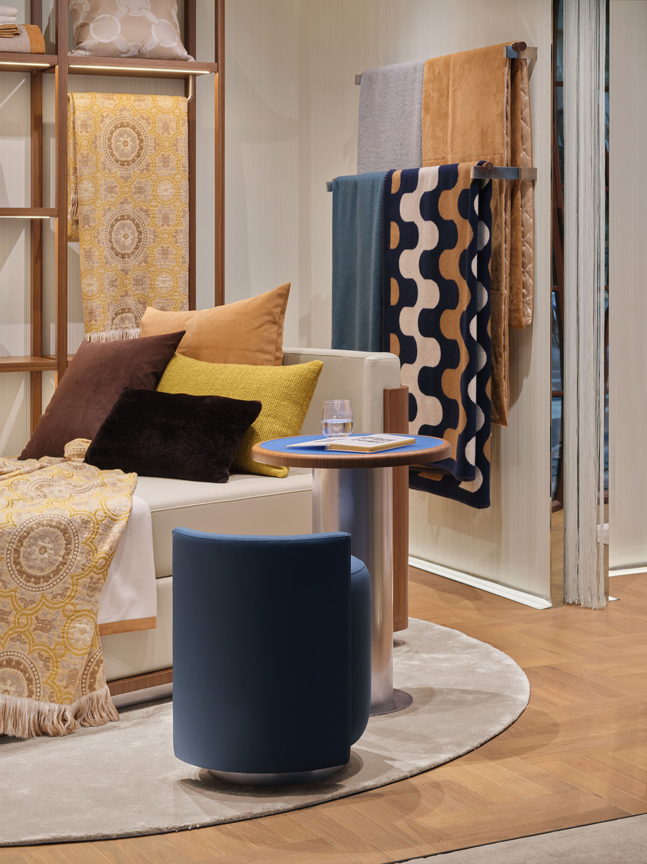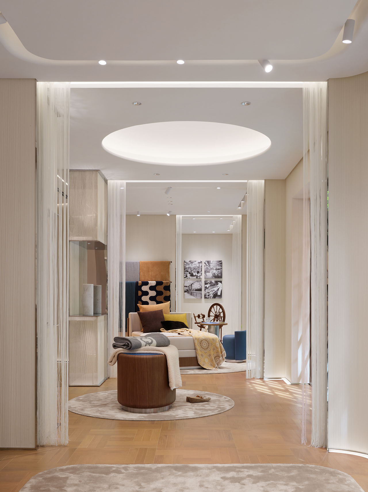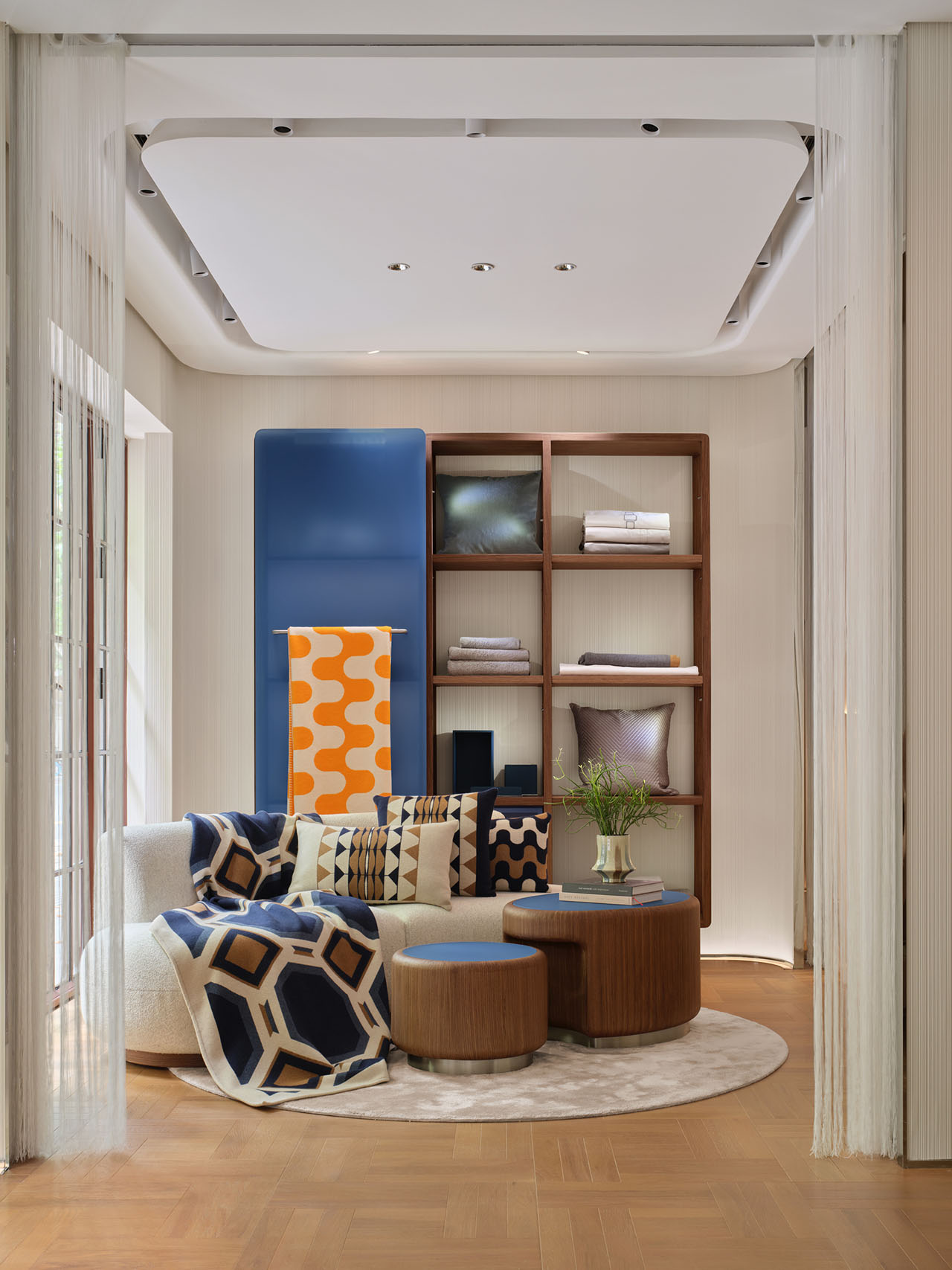 陈列架将织物与配饰自然融入空间语境,圆弧沙发与地毯形成柔和的视觉引导,访客在自然的围合感中体会品牌的温度与亲和力。半透丝线帘界定出私密场域,又让光线如经纬般穿梭其间,营造出宅邸客厅的慵懒氛围。空间以几何图案织物为主导,辅以蓝色点缀,回应品牌的视觉基因。