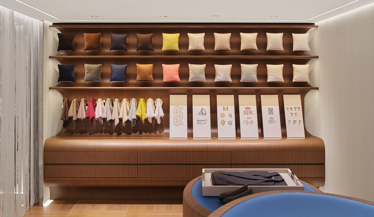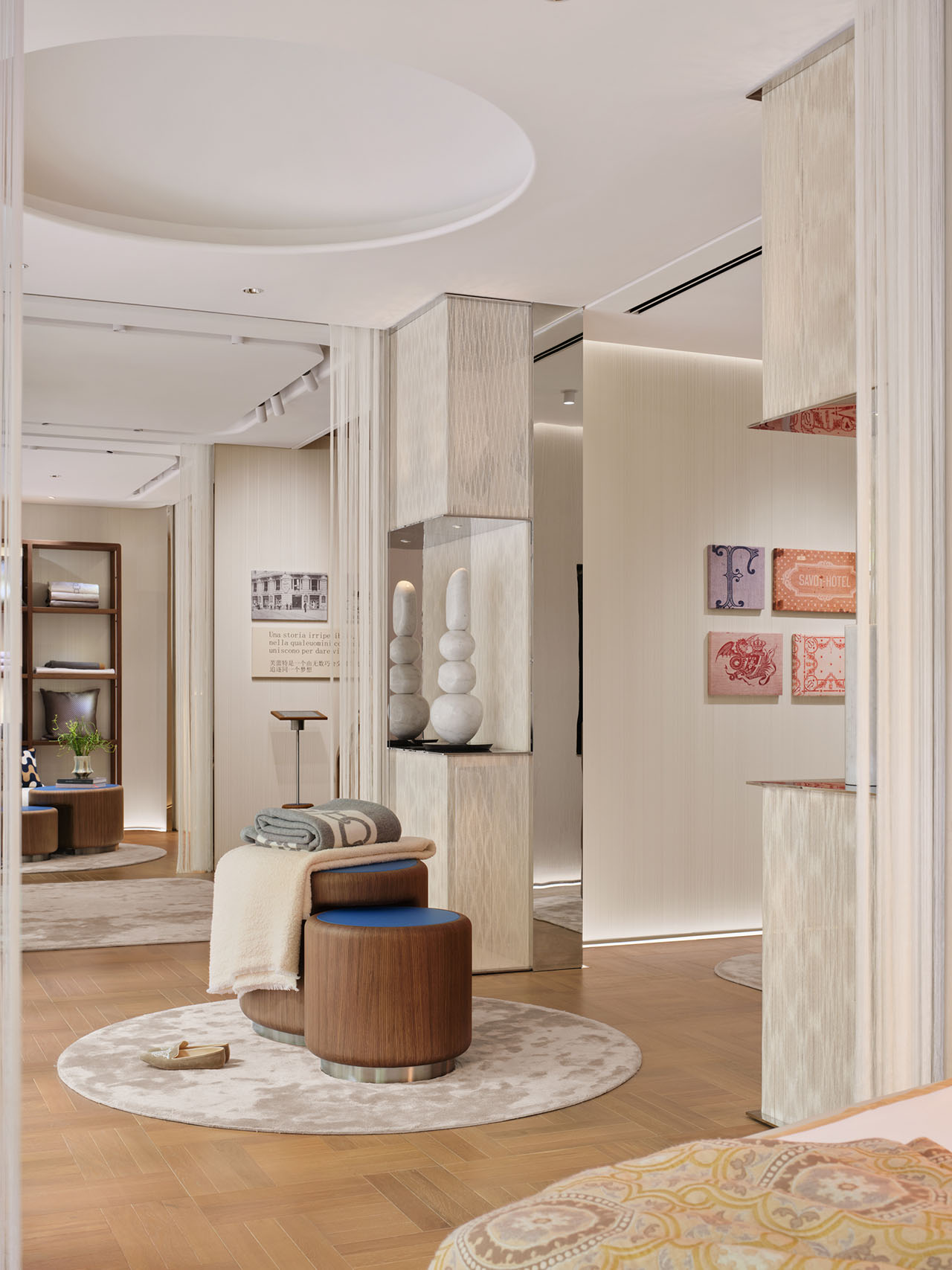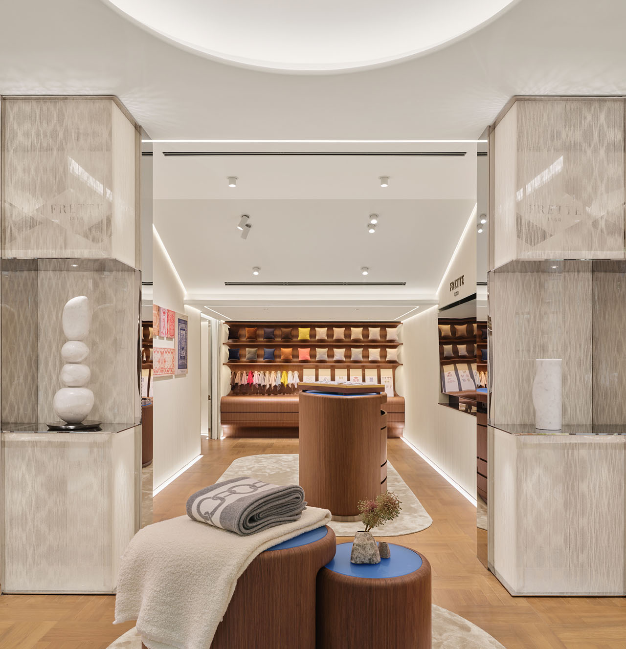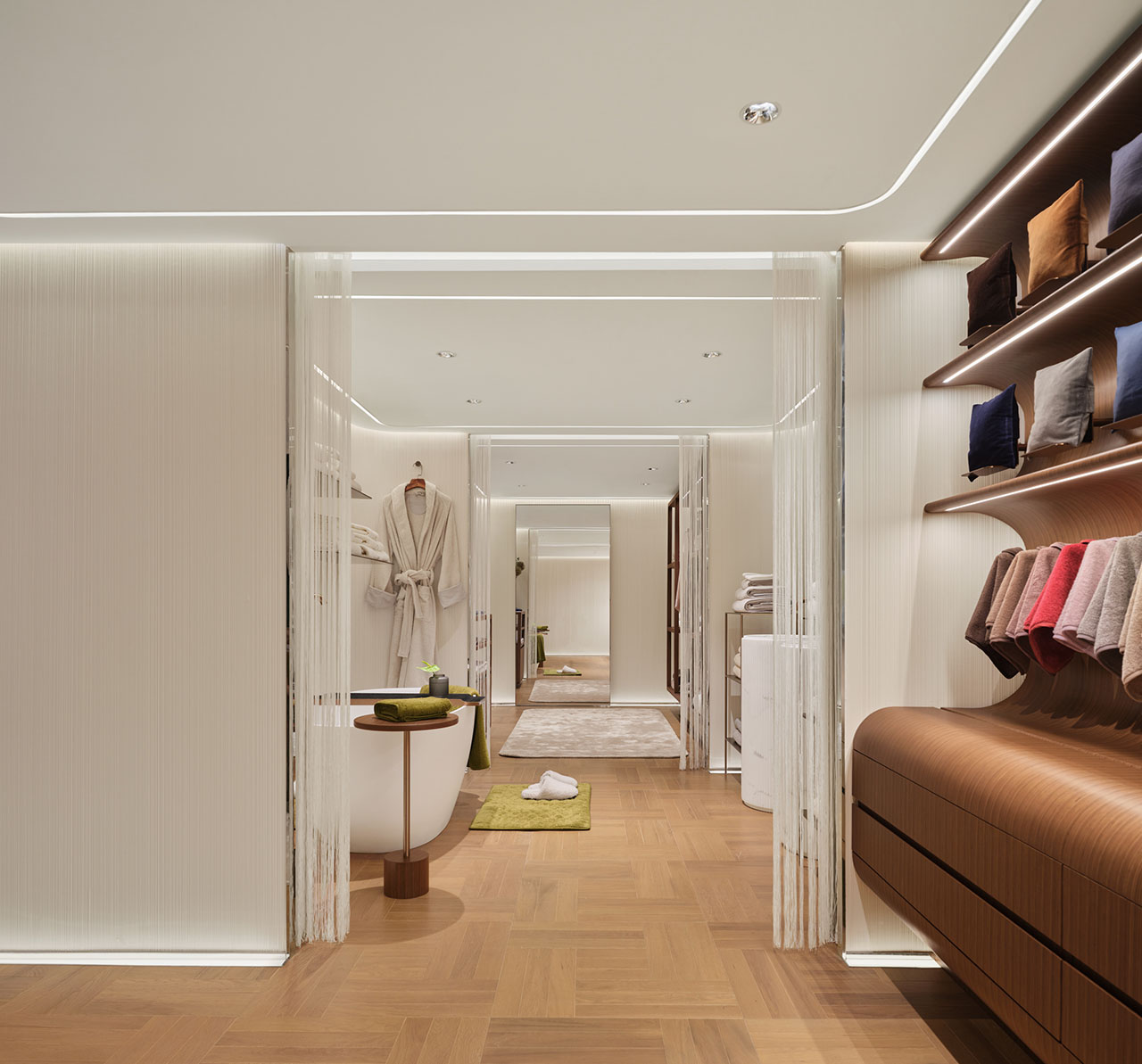 在接待区,Frette延续了传统的托盘仪式。通过触感实验,让访客感受通过独特纺织工艺的不同面料所呈现的丰富肌理和越洗越软的卓越品质。空间为慢体验而设,这呼应了Frette对私人化奢华的定义——真正的奢华来自被理解与被尊重的感受。