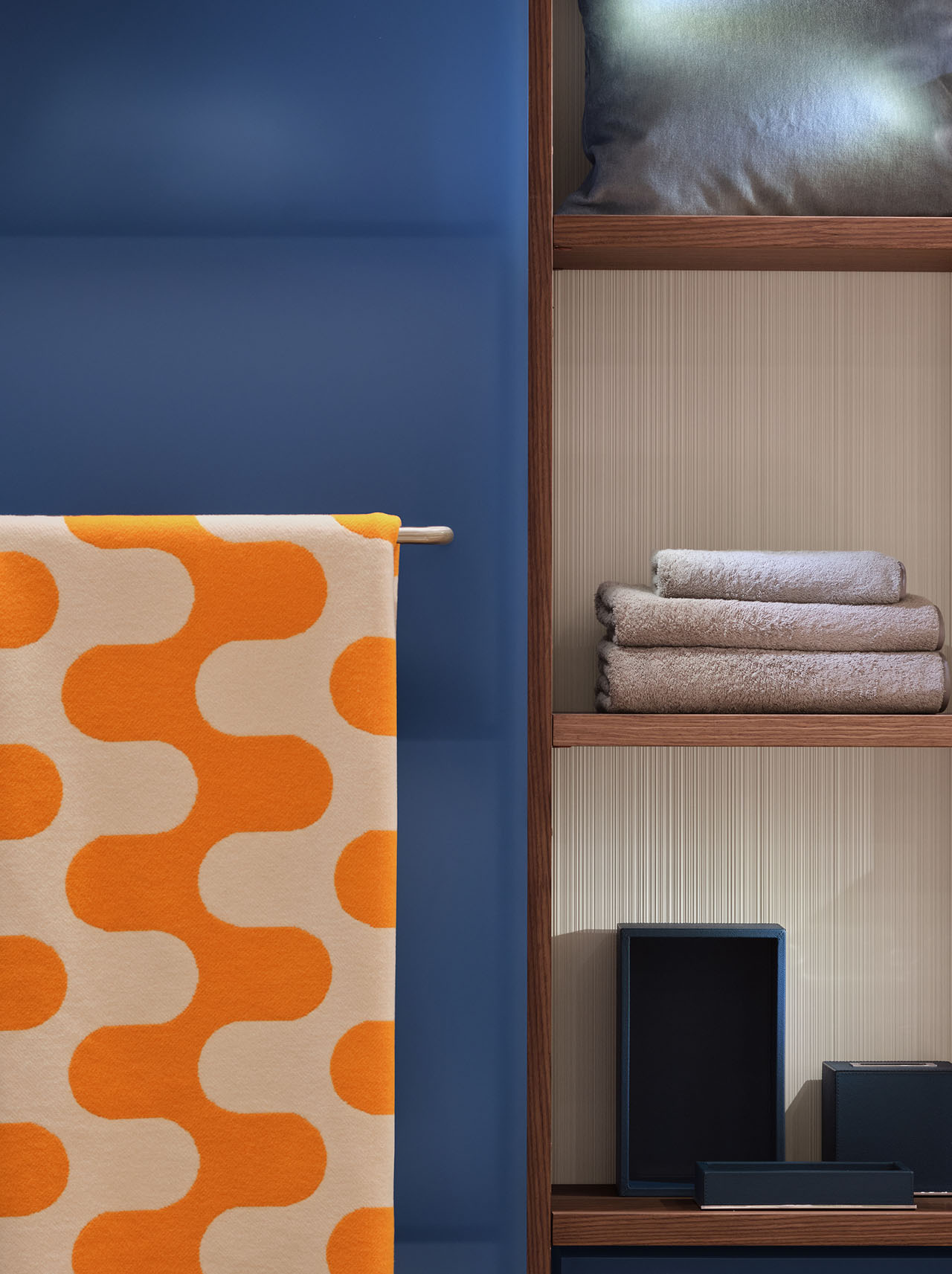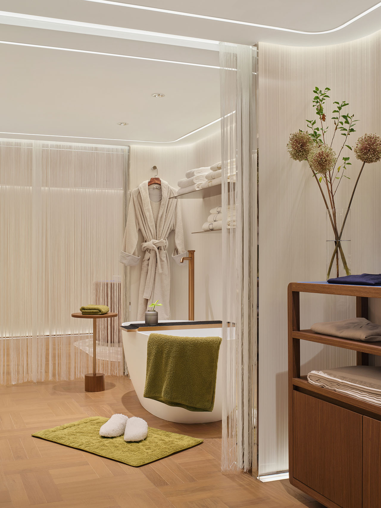 紧邻卧室的卫浴区与更衣室进一步延伸家居场景,营造出私邸卫浴的松弛感。开敞的结构让织物、衣饰与空间融为一体,陈列层板营造出有序与平衡之美。
