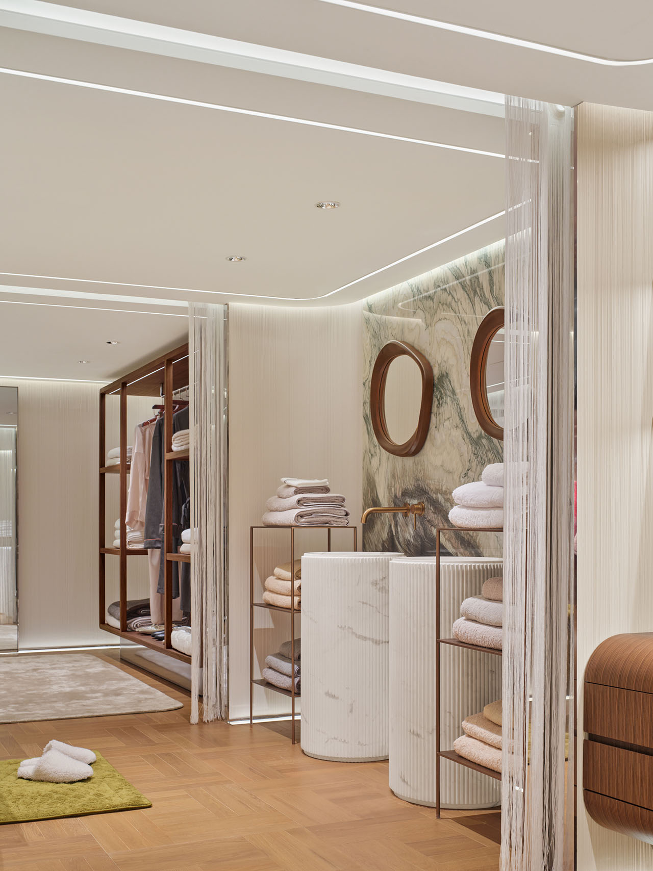 大理石纹路与柔白织品交织出一处静谧角落。浴袍、毛巾、居家服皆以自然陈列呈现,每一处细节都在传递沐浴时刻的织物奢享。这里也展示Frette to Wear系列——真丝睡衣、羊绒披肩、棉质居家服,将奢华延展至日常仪式。