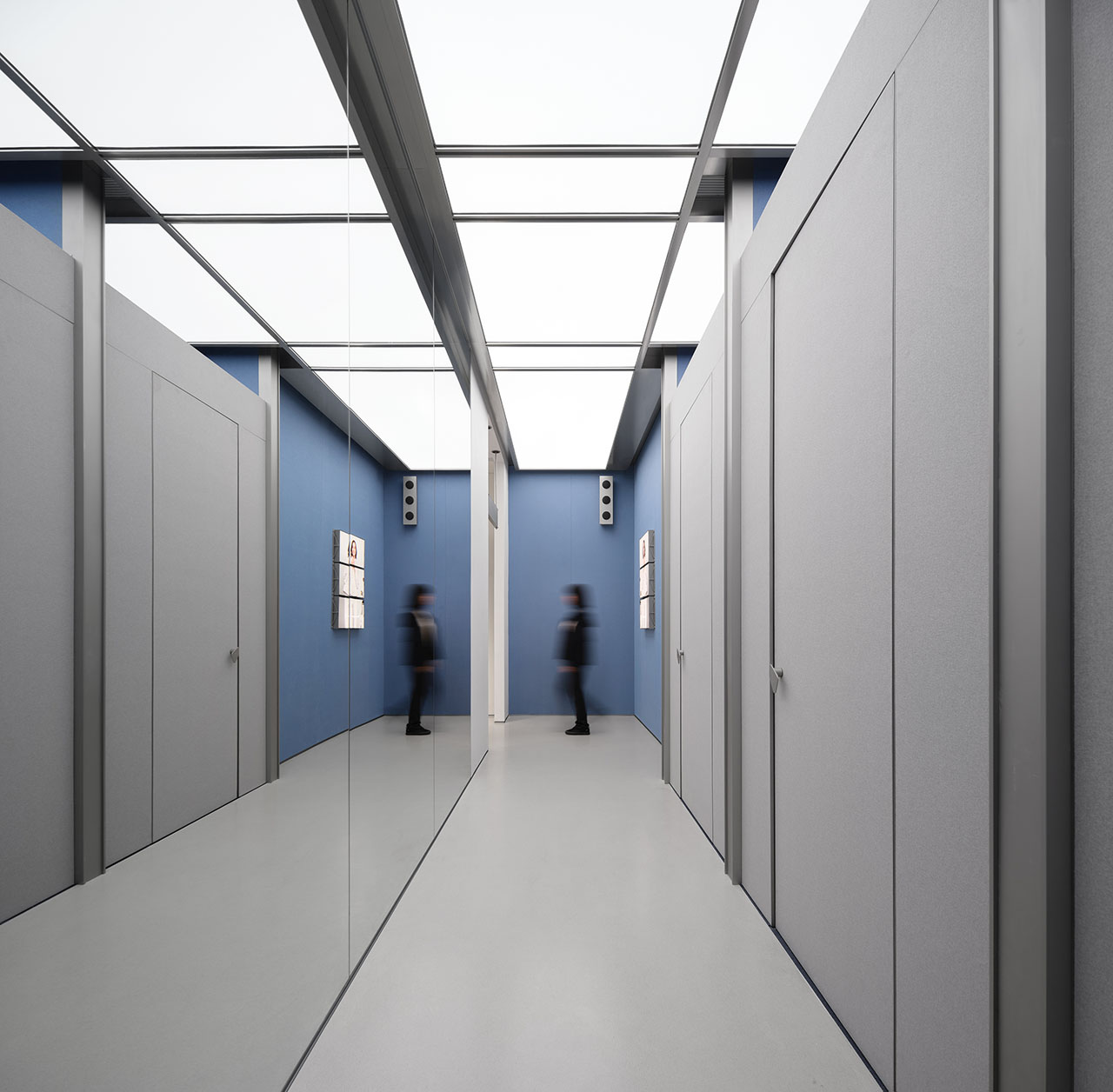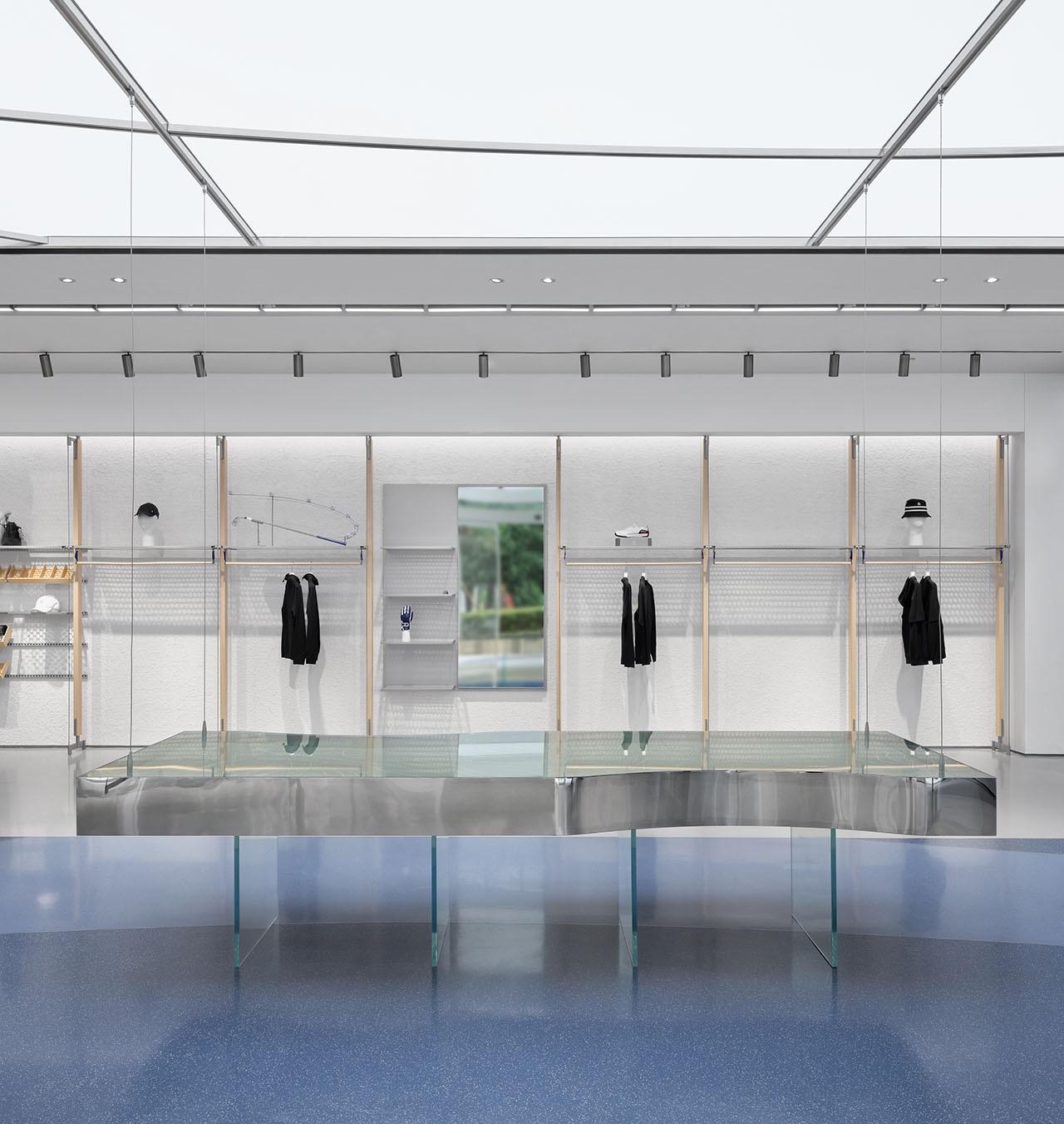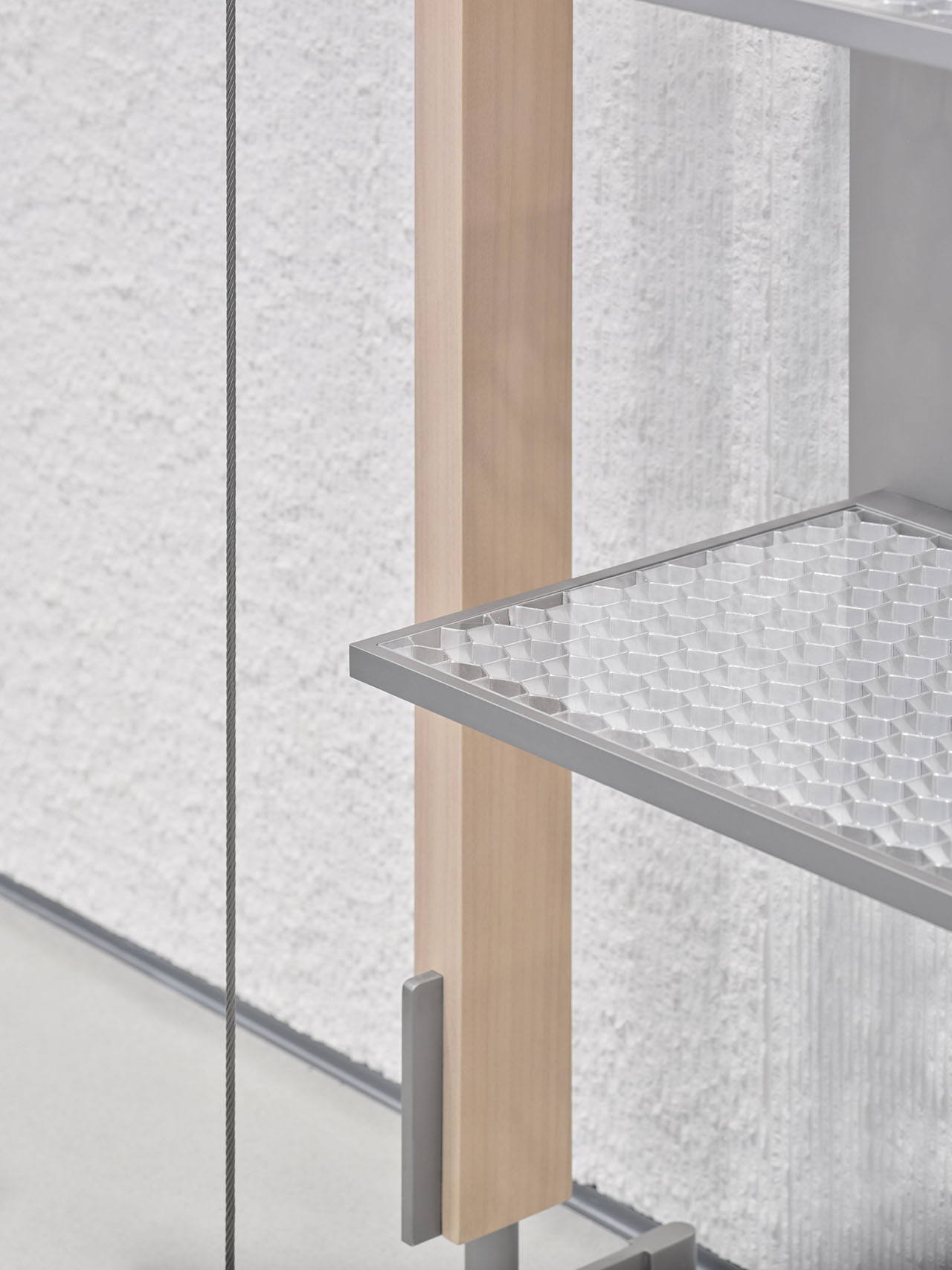 一层保持通透,面向外部的货架隔板则选用蜂窝状的磨砂玻璃,引入自然光的同时,确保产品展示的完整性。