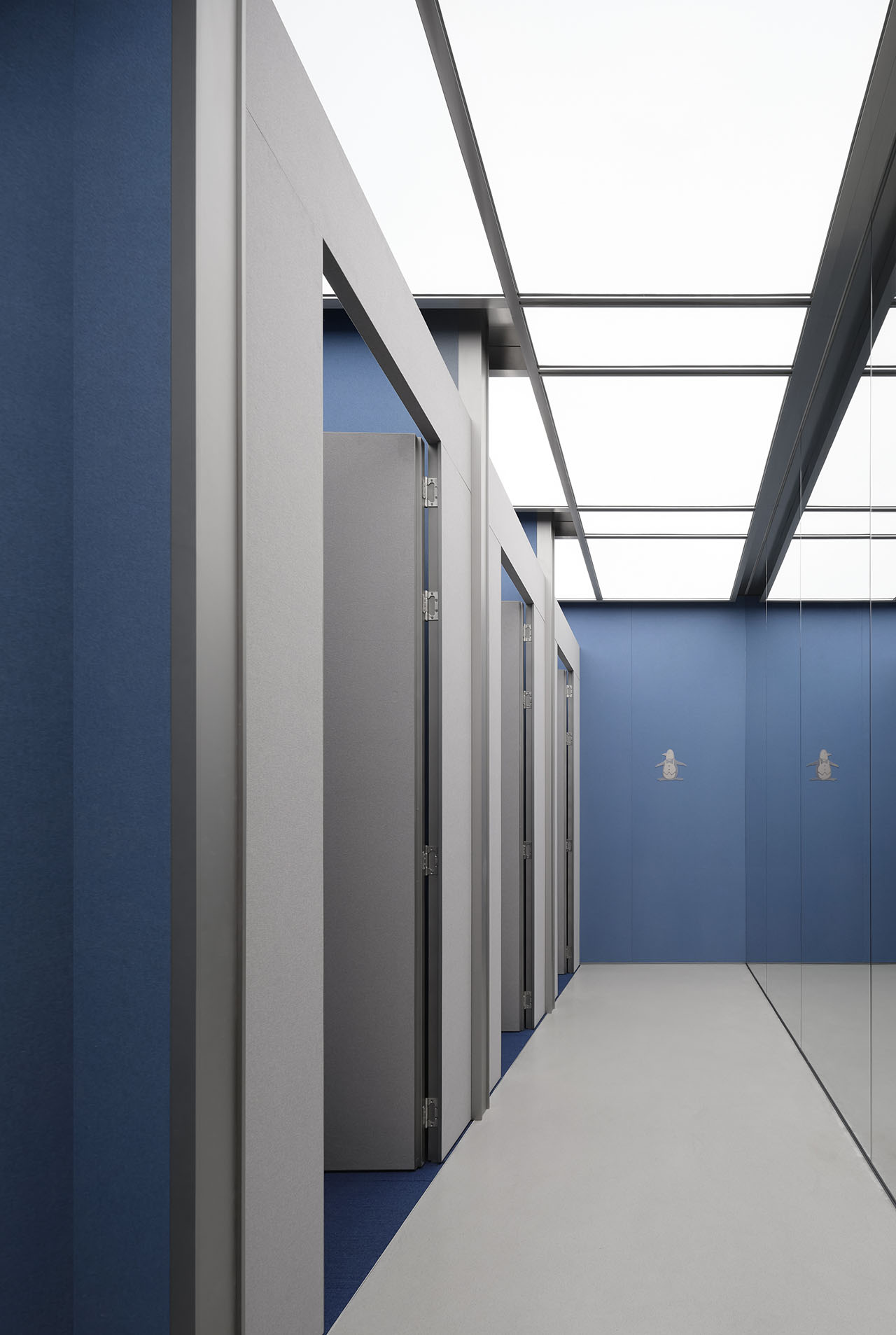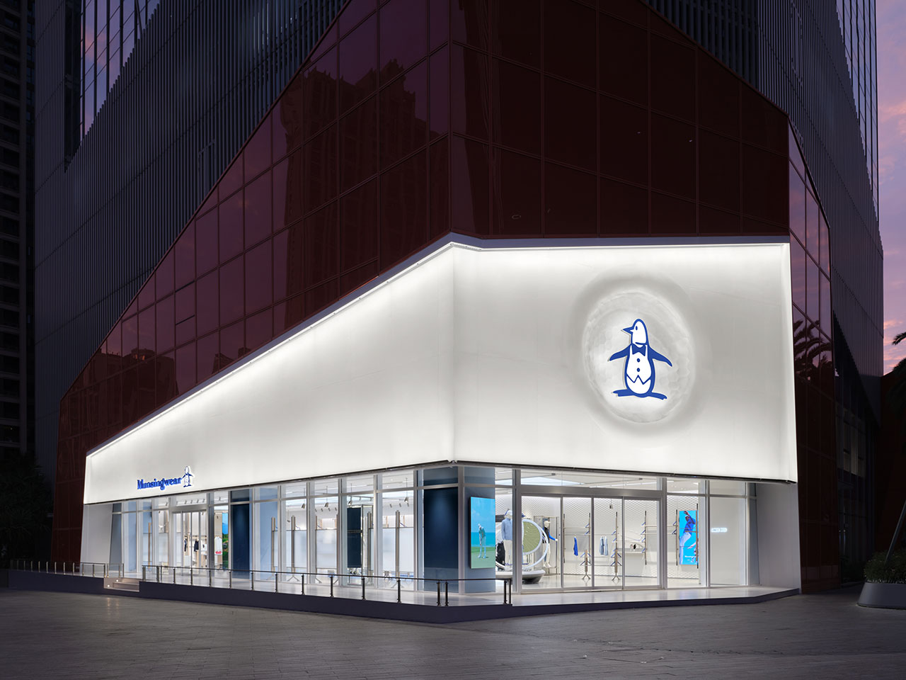 在保留原建筑幕墙框架的基础上,设计团队利用极简留白的大面积立面塑造简约的品牌美感,UHPC高强度混凝土打造高尔夫球的表面立体肌理,配合品牌企鹅标志作为核心视觉符号,在整体纯净的白色基调中通过高球肌理与凹陷造型,凸显品牌符号和运动品类的特征。