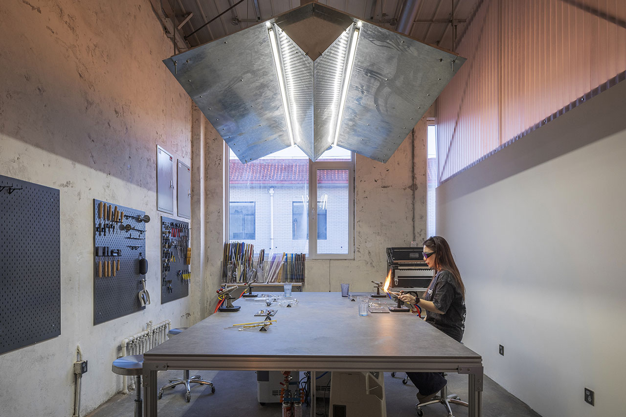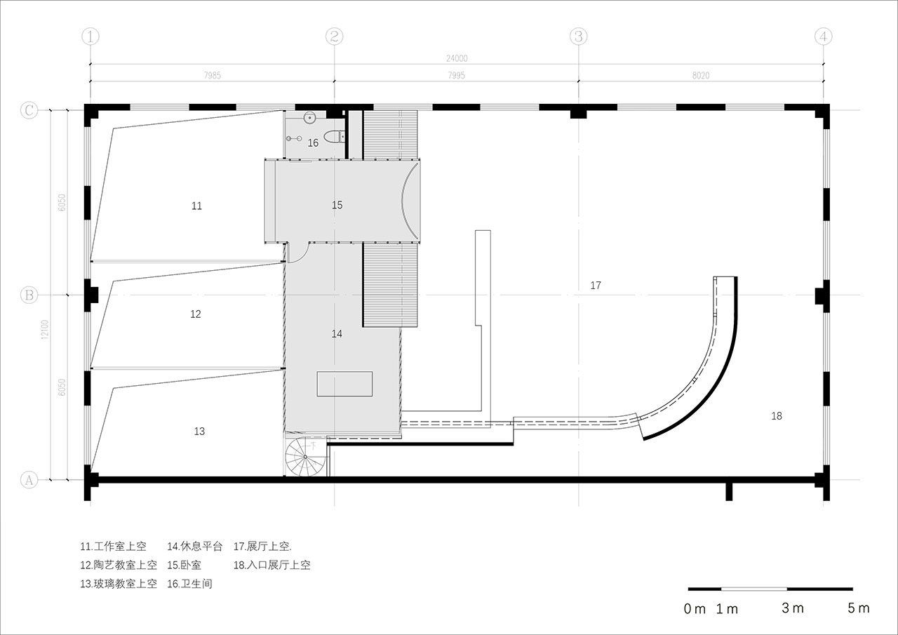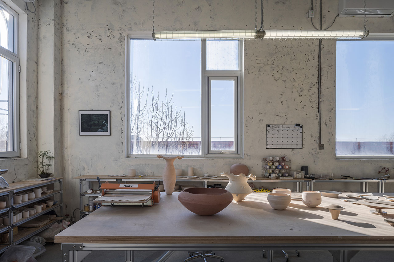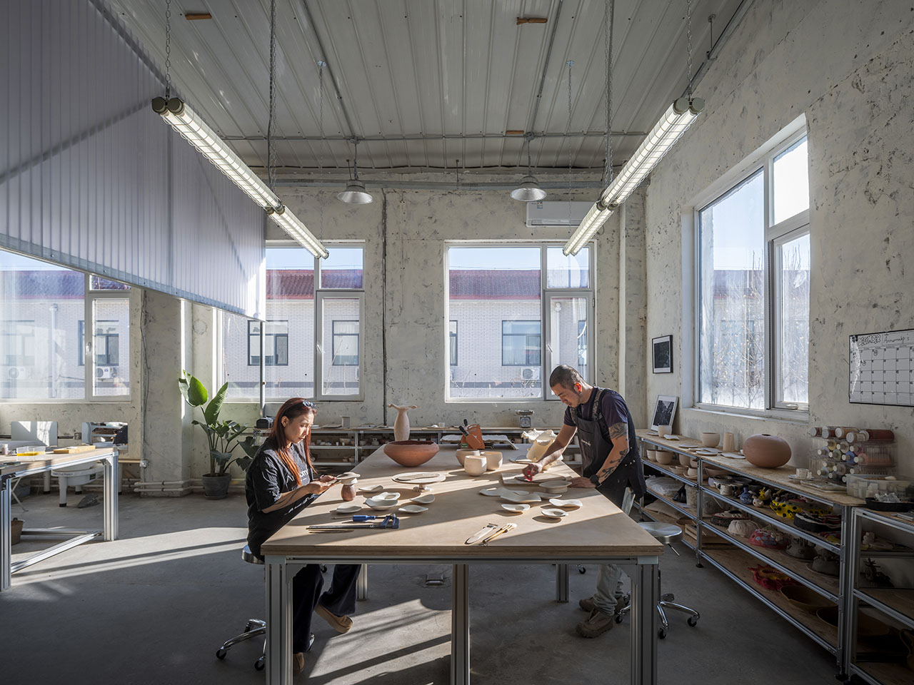 清晨,南向的阳光洒进开放工作坊,泥土在指尖旋转;午后,西侧弧墙如温润的手掌,承接夕阳,让光影在混凝土地面缓缓游移。悬浮的聚酯波浪板将强光滤成漫射,整个空间如温室般弥漫着柔和的光晕。