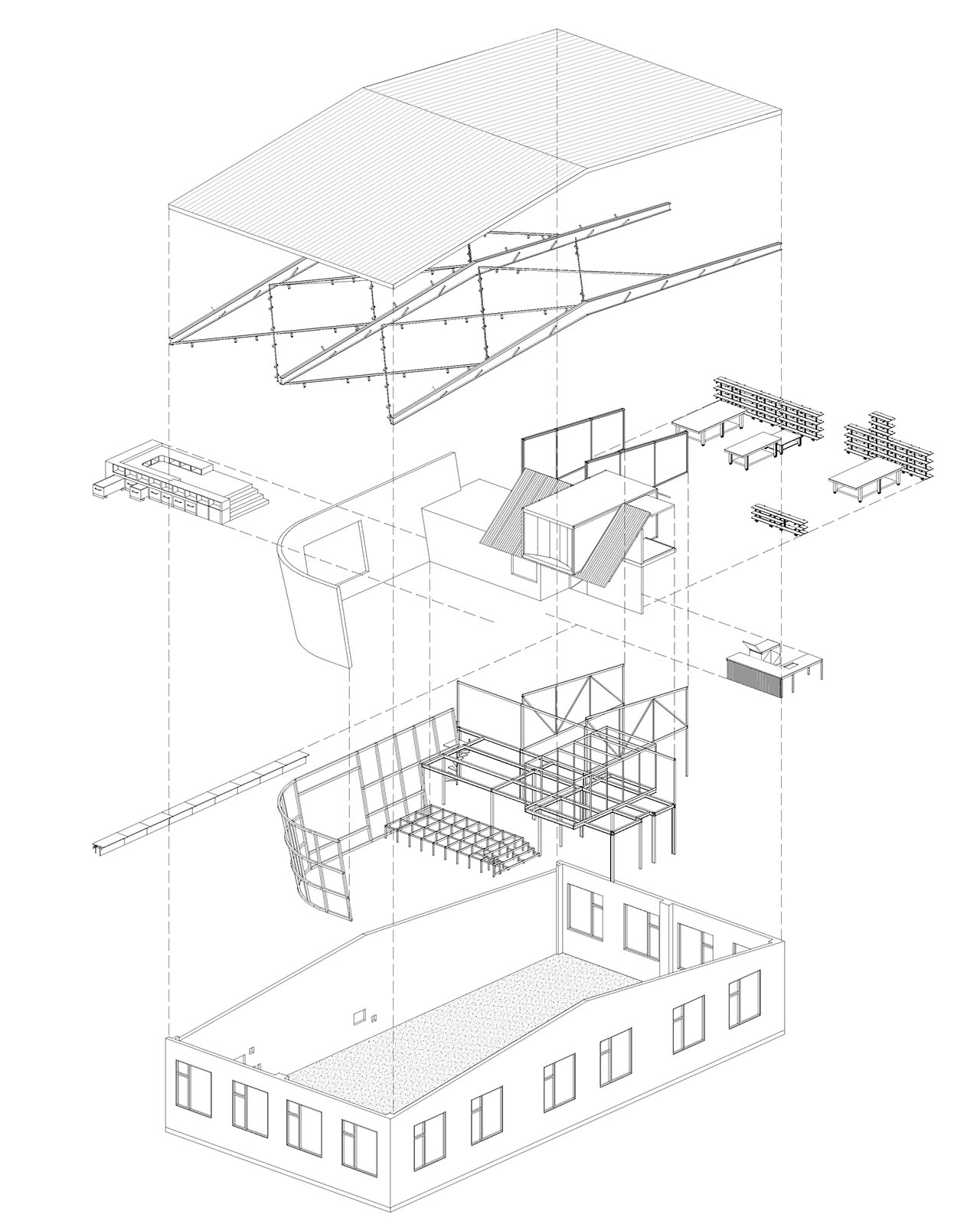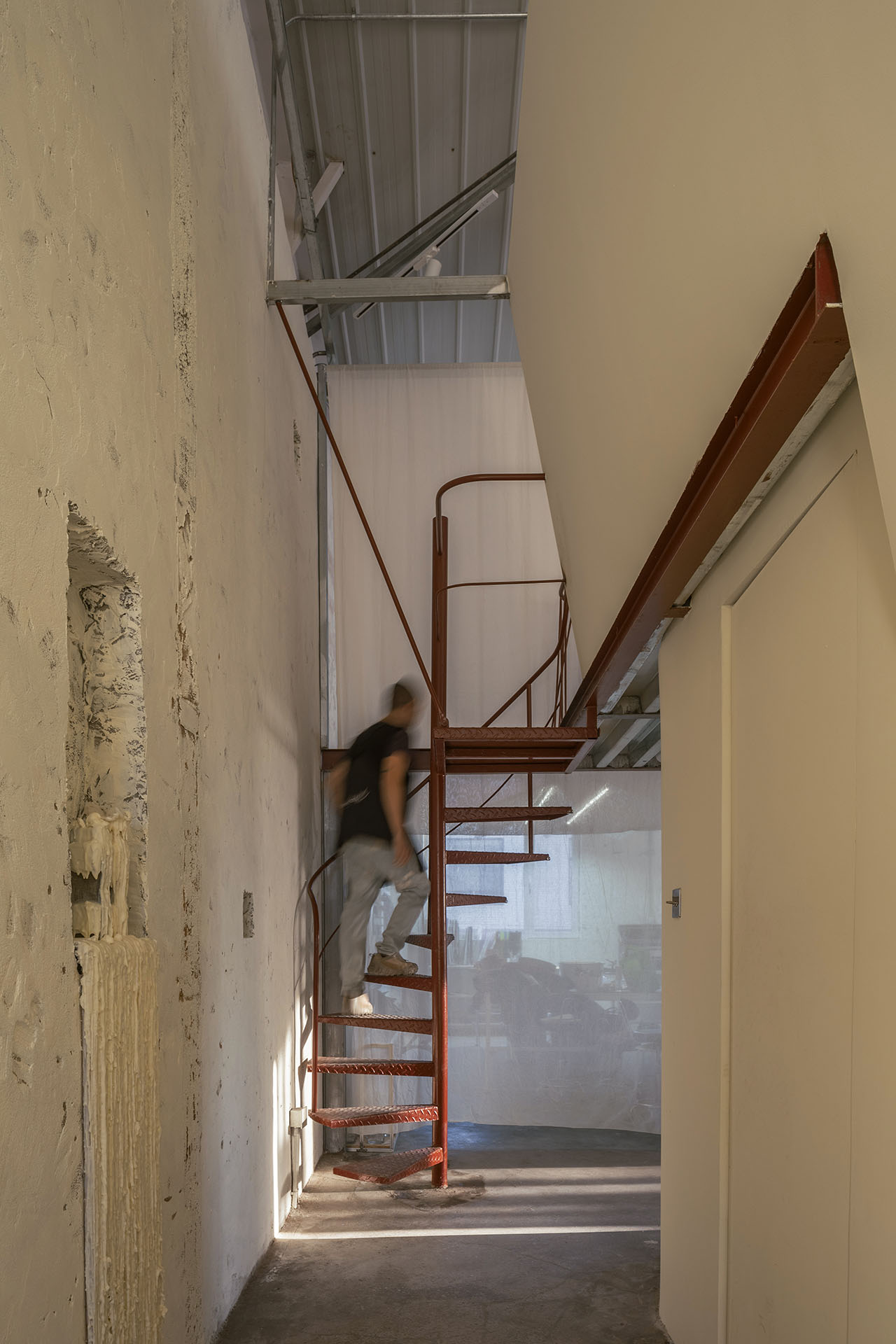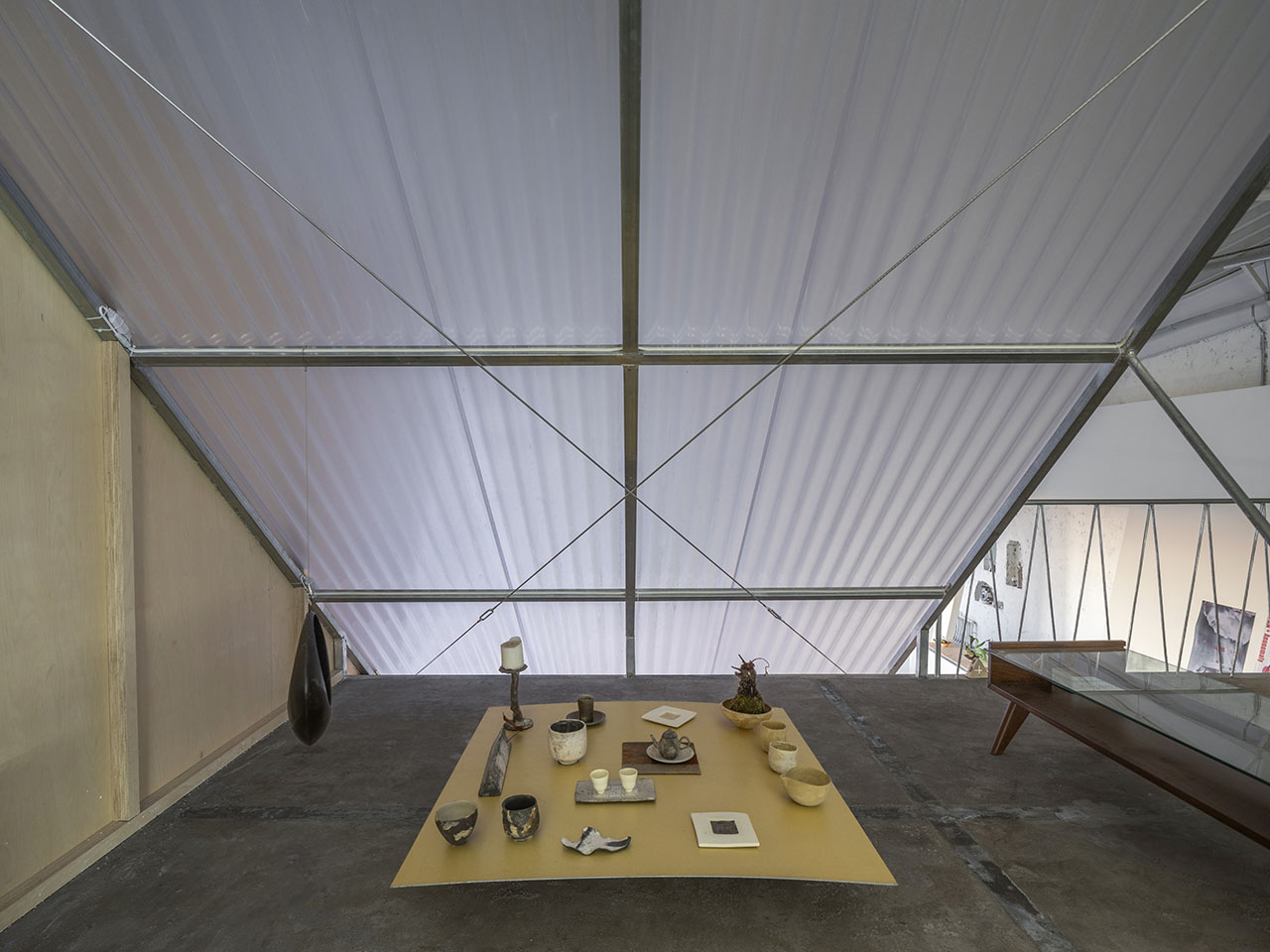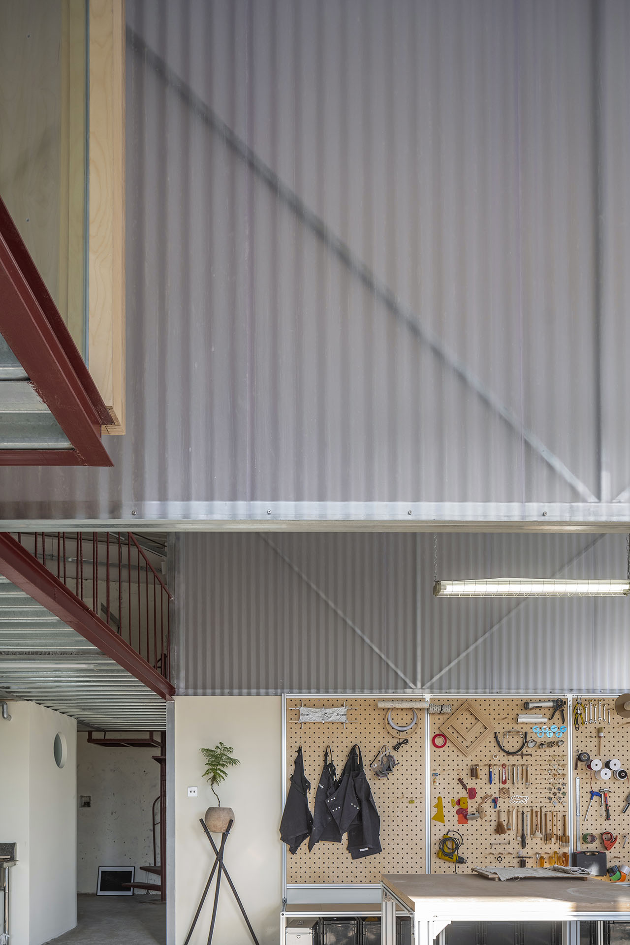 这是用预制镀锌钢、桦木多层板和聚酯板“搭建”而非“装修”出的世界——X型吊架可灵活悬挂展品,地台下的抽屉箱体收纳着泥胚与工具,拉开即成展台。动线在紧凑的功能体块间穿行:无需穿过教室便可抵达夹层起居,吧台的钢格栅让视线穿透无阻。
