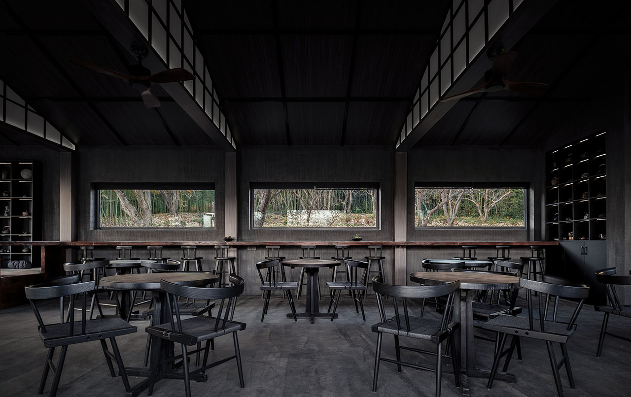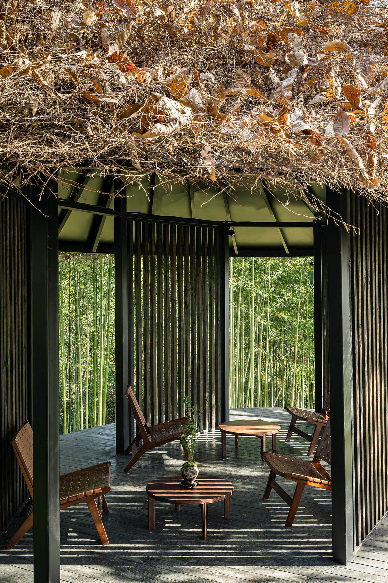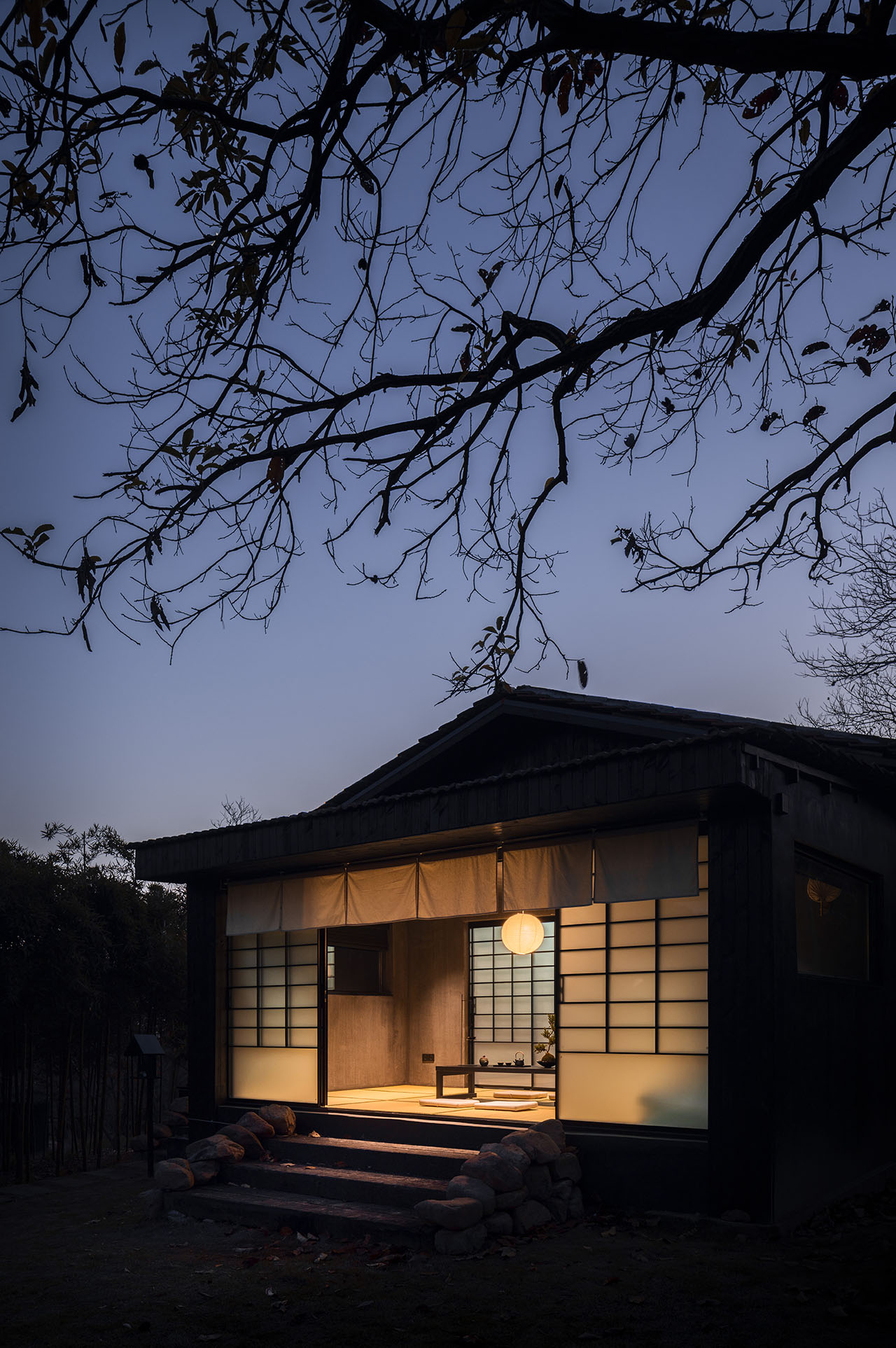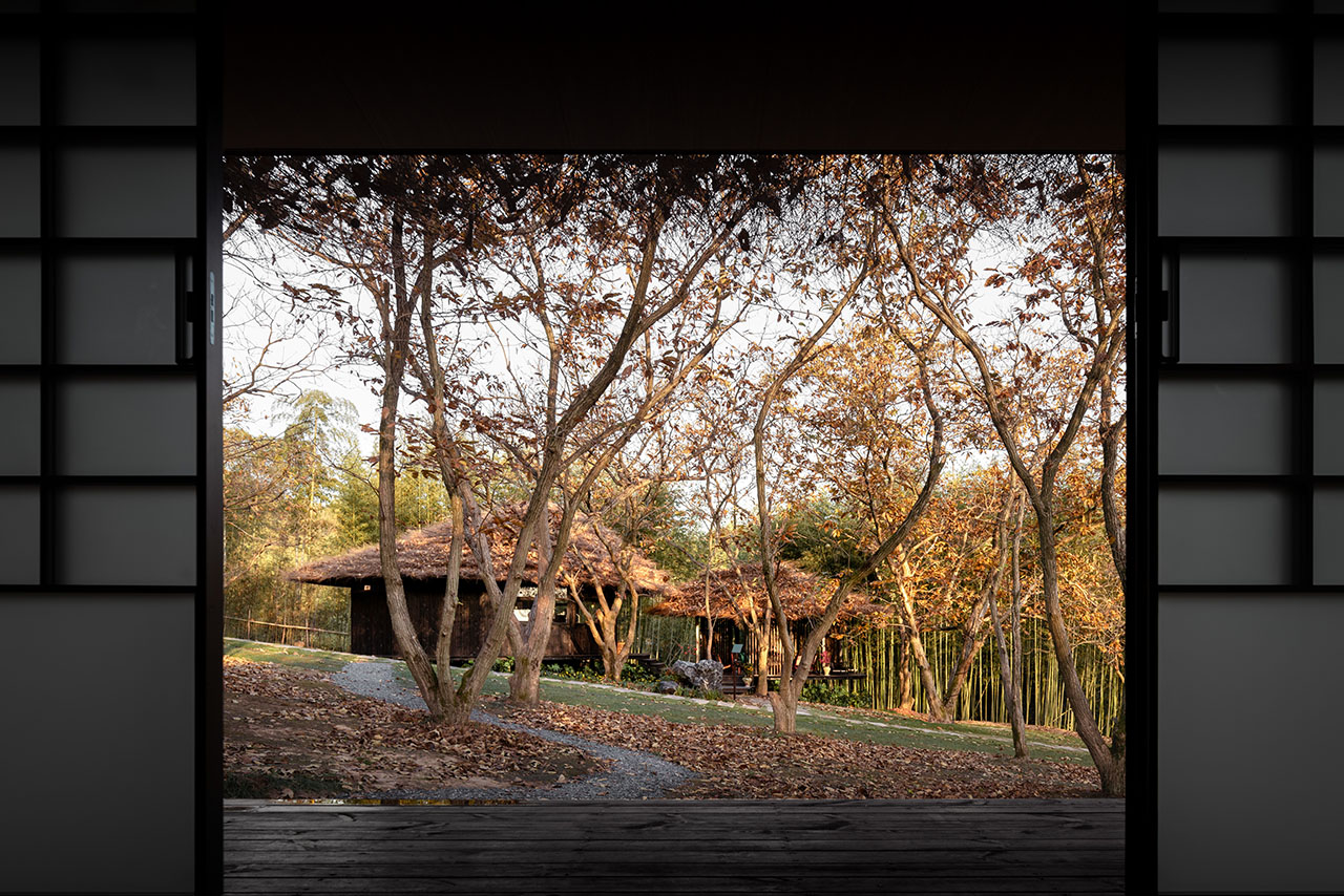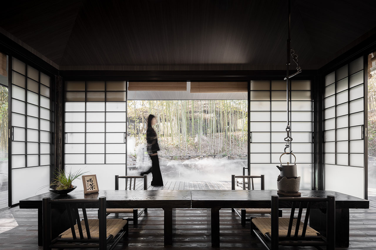 林下茶香浮动,竹篾覆顶的出品区如林间蘑菇般自然生长。捧一杯栗林特调,远望对面茶室隐于树影之间——黑木与障纸勾勒的轮廓里,蒲团矮桌静候品茗人。