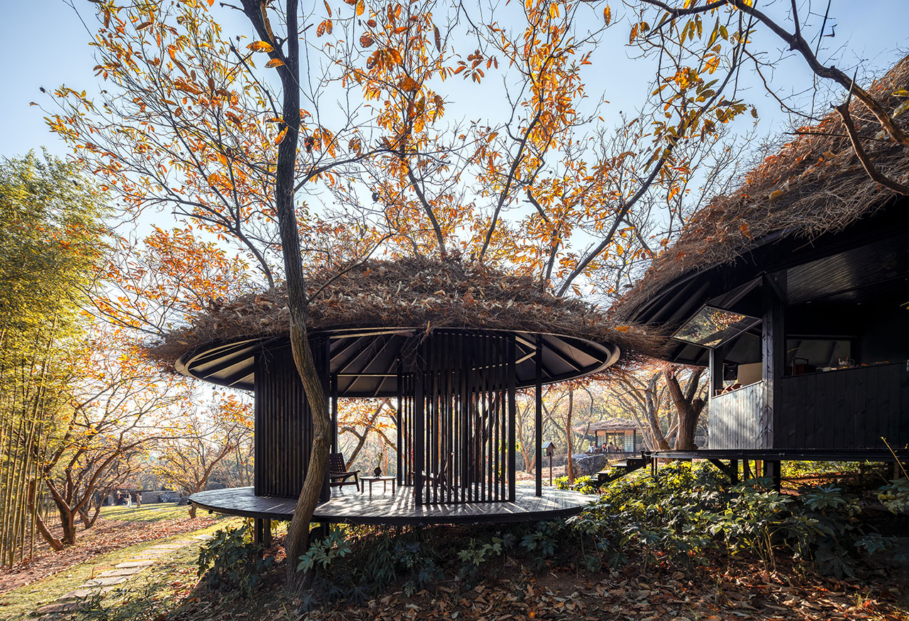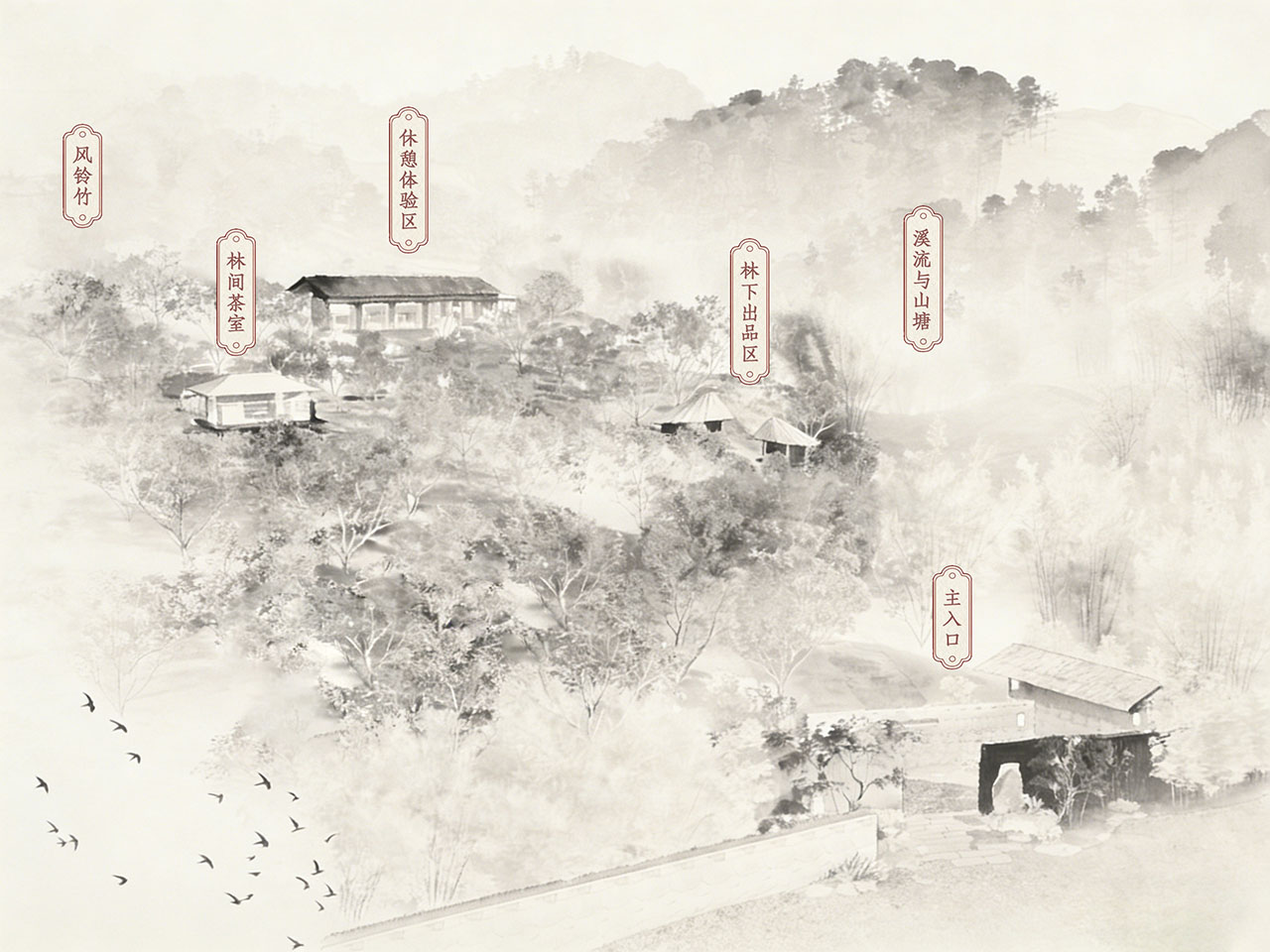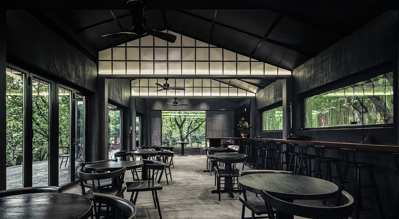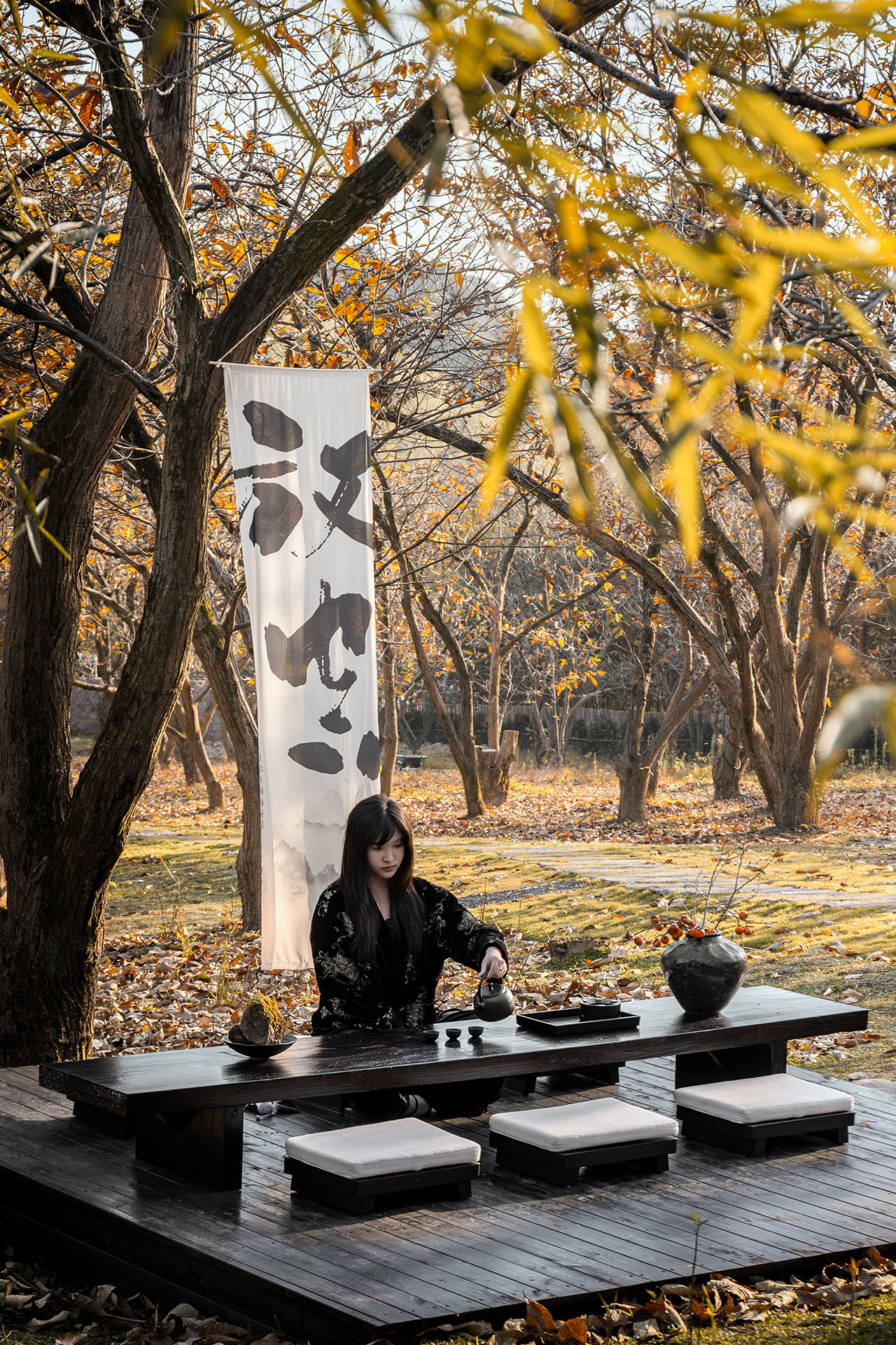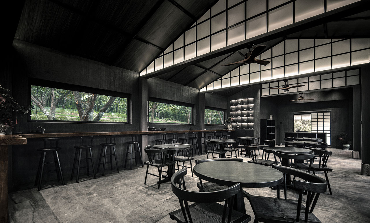 林下茶香浮动,竹篾覆顶的出品区如林间蘑菇般自然生长。捧一杯栗林特调,远望对面茶室隐于树影之间——黑木与障纸勾勒的轮廓里,蒲团矮桌静候品茗人。