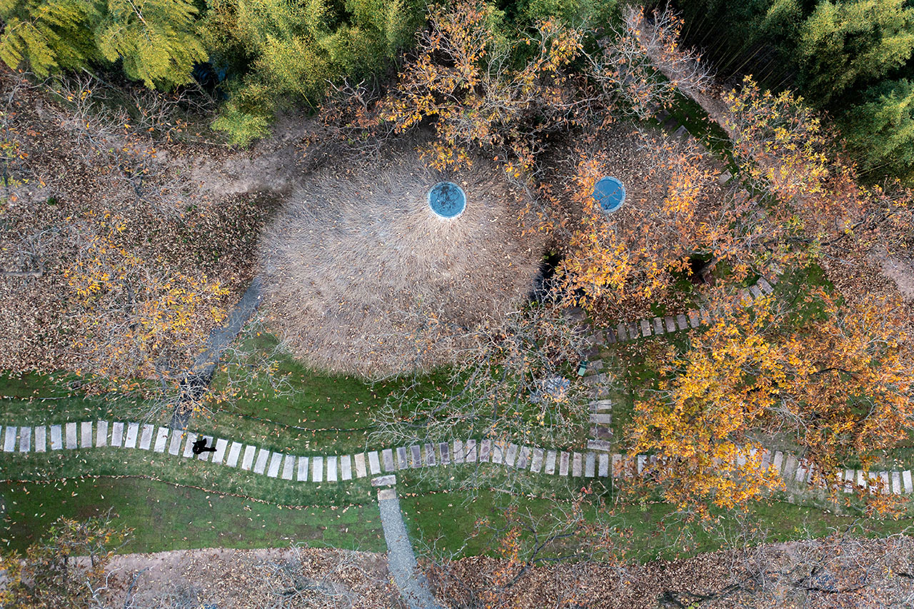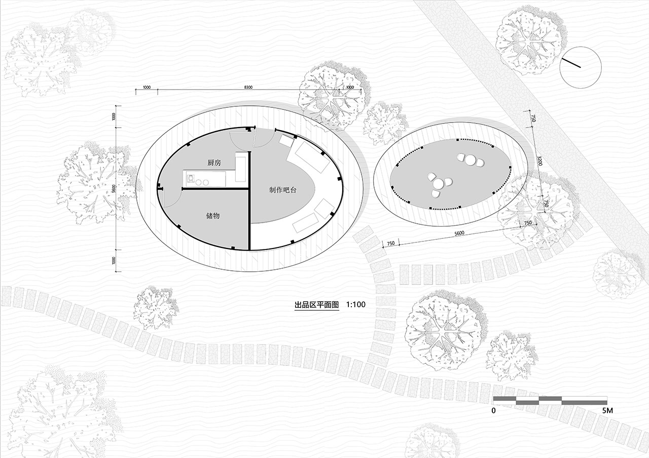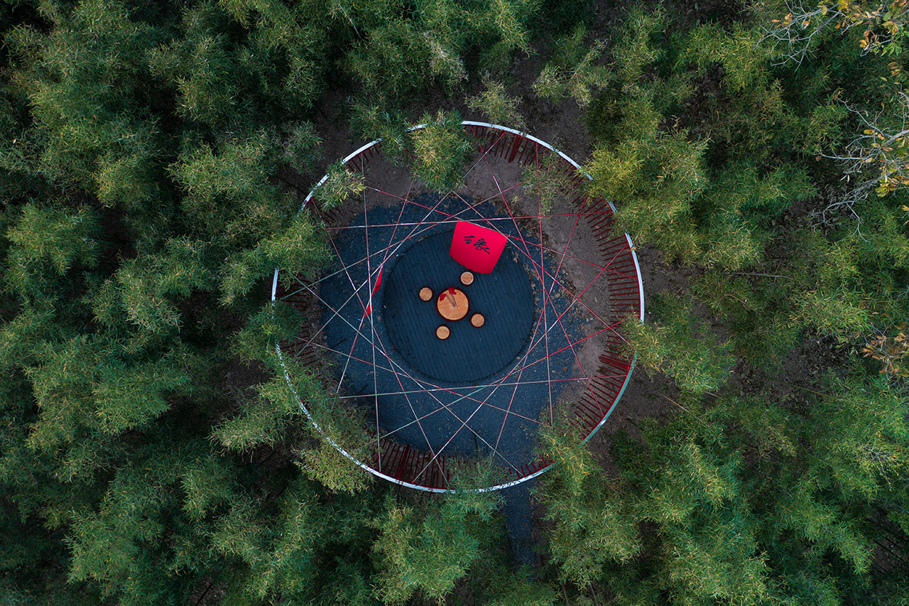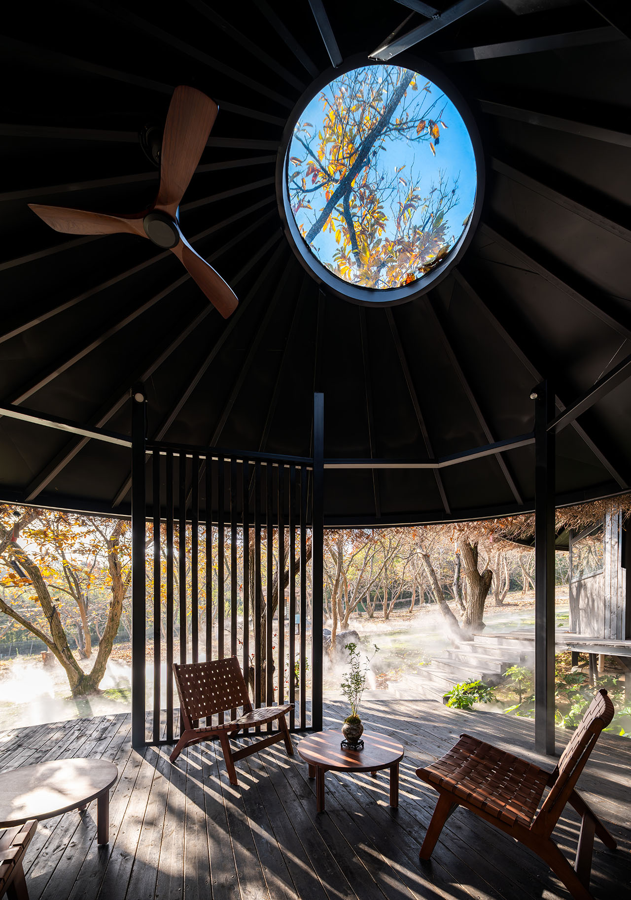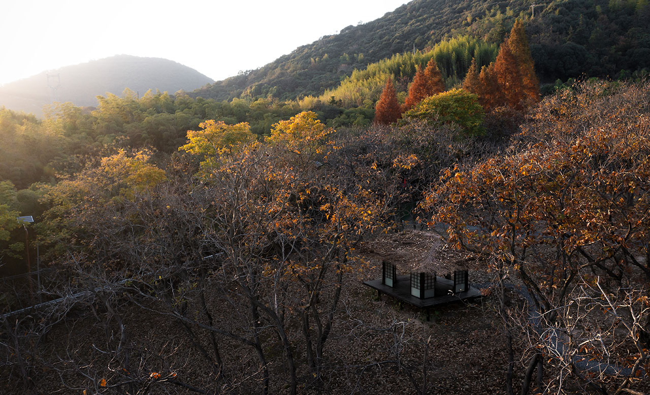 林下茶香浮动,竹篾覆顶的出品区如林间蘑菇般自然生长。捧一杯栗林特调,远望对面茶室隐于树影之间——黑木与障纸勾勒的轮廓里,蒲团矮桌静候品茗人。