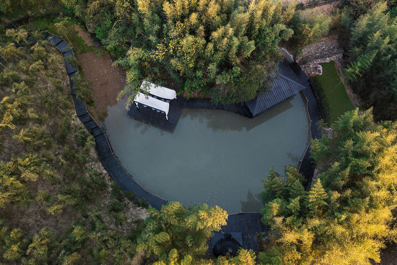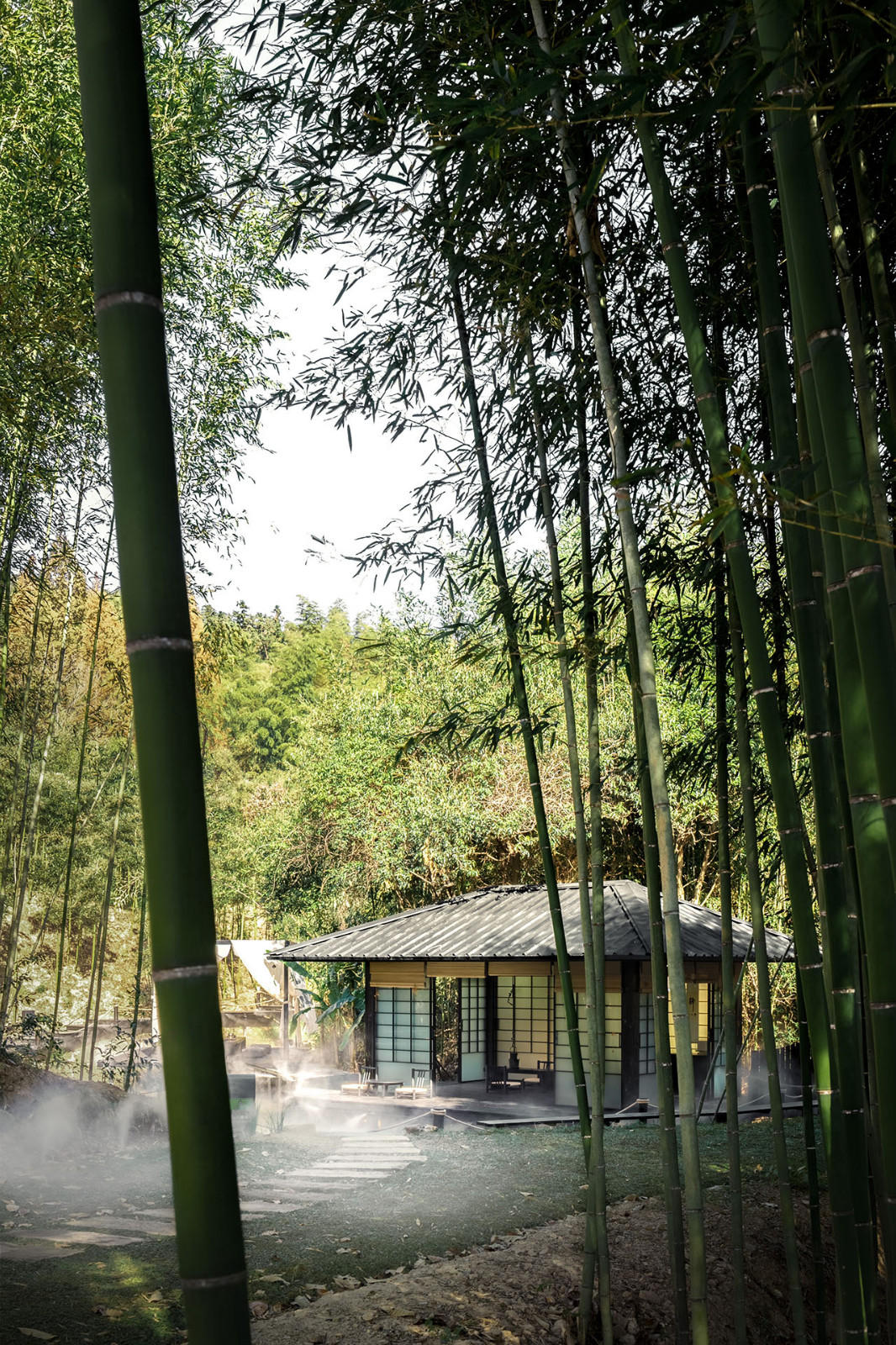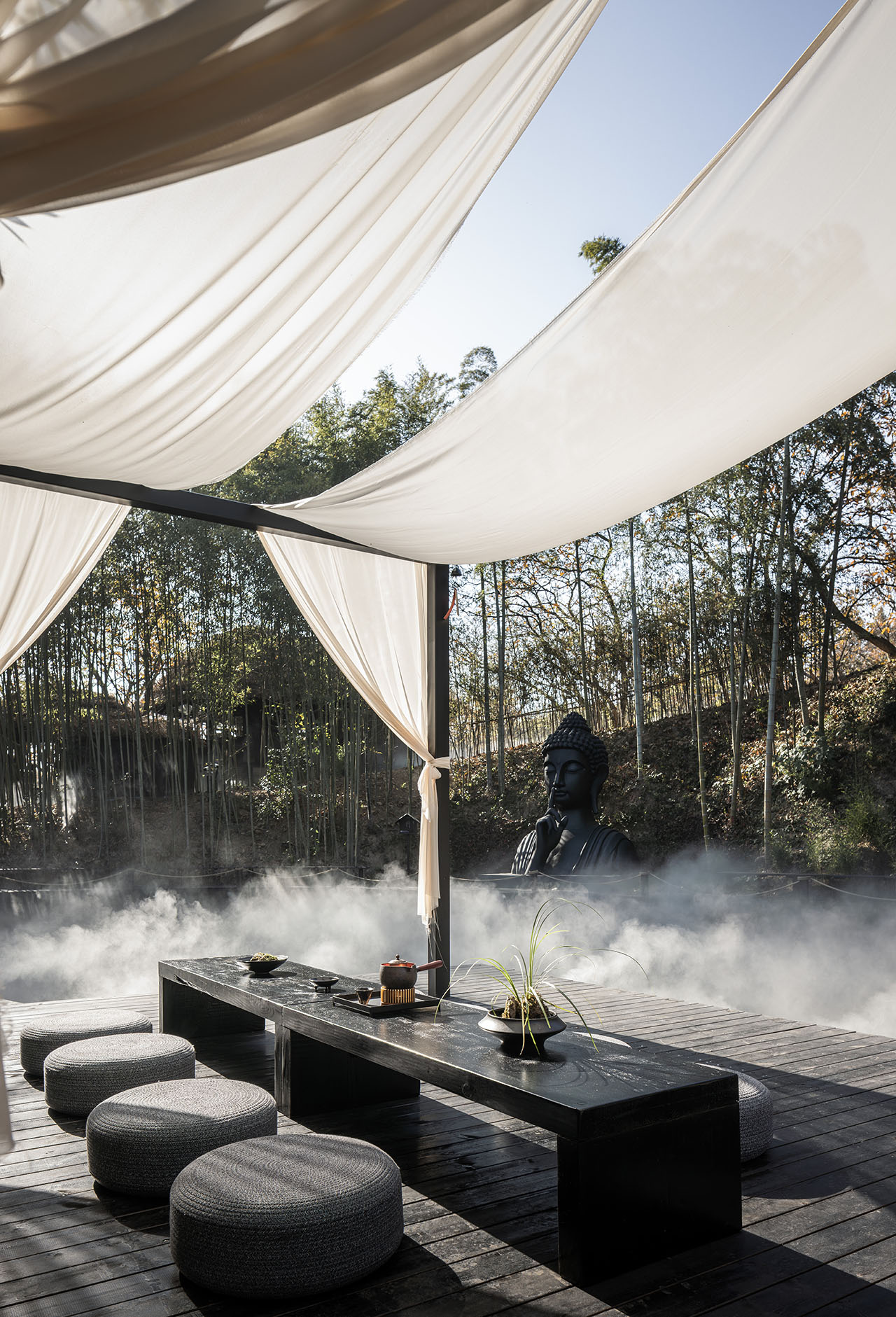 沿溪而行,水声渐近。山泉顺竹林肌理蜿蜒而下,汇入心形山塘。溪畔纱幔轻扬,风铃竹叮咚作响,对岸佛像在薄雾中若隐若现。择一处竹廊凭栏,或推开通透落地窗步入茶舍,煮水、听溪、观竹,让山野气息渗入每个毛孔。