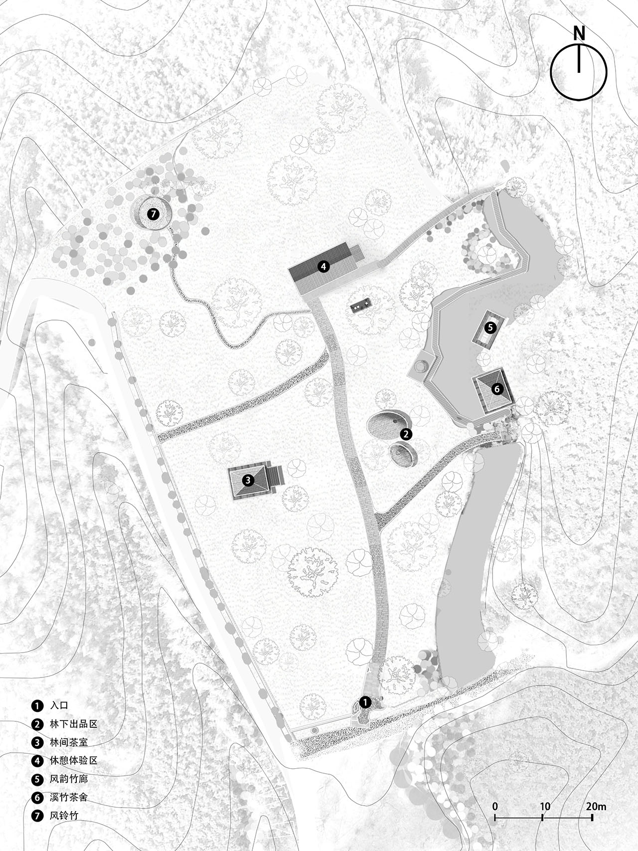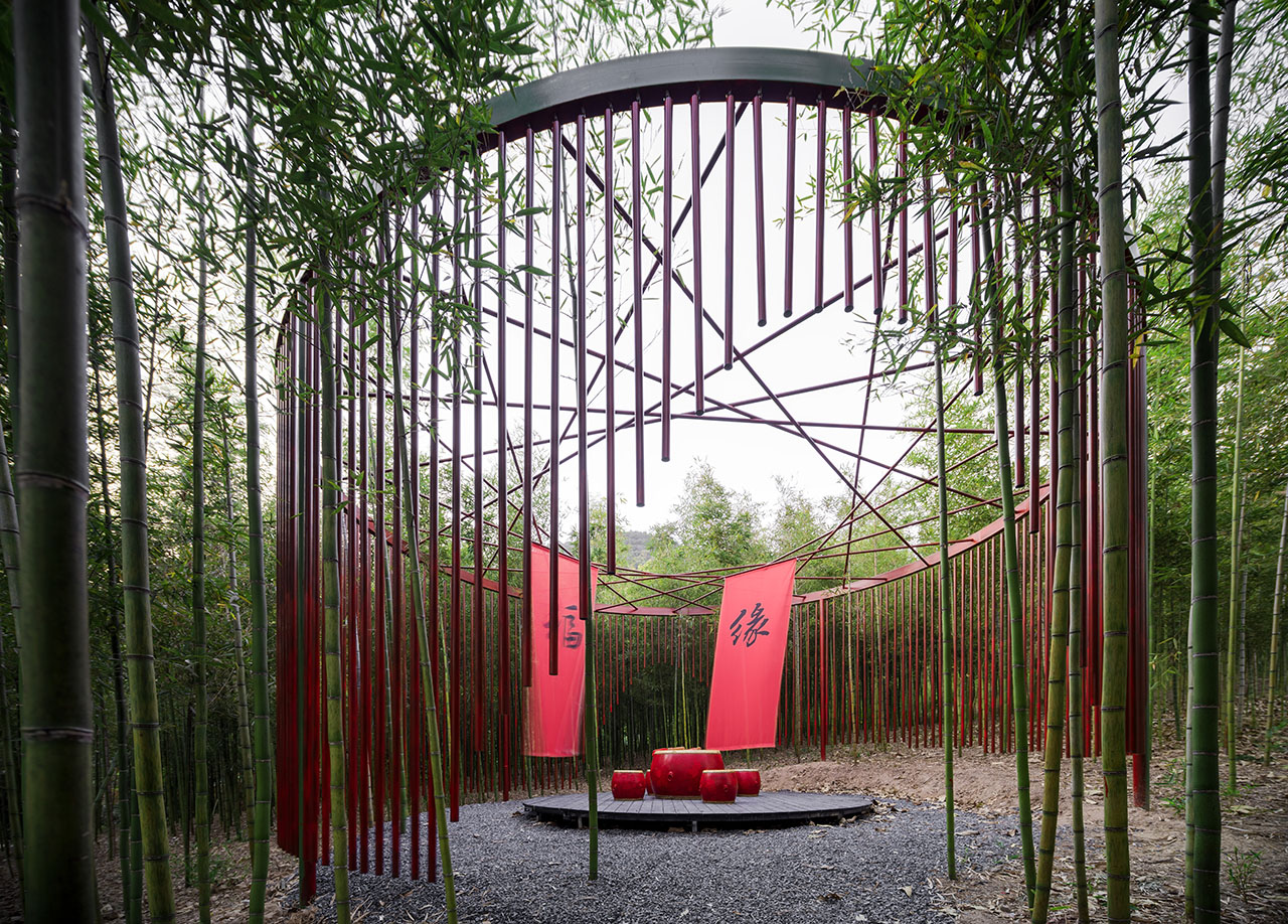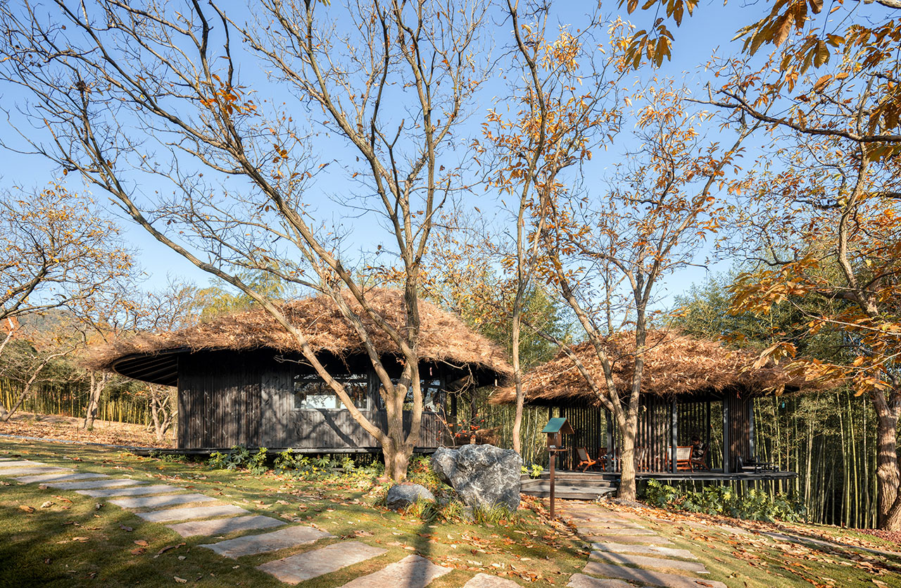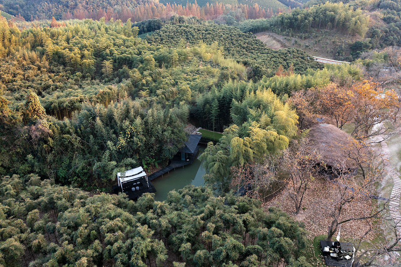 沿溪而行,水声渐近。山泉顺竹林肌理蜿蜒而下,汇入心形山塘。溪畔纱幔轻扬,风铃竹叮咚作响,对岸佛像在薄雾中若隐若现。择一处竹廊凭栏,或推开通透落地窗步入茶舍,煮水、听溪、观竹,让山野气息渗入每个毛孔。