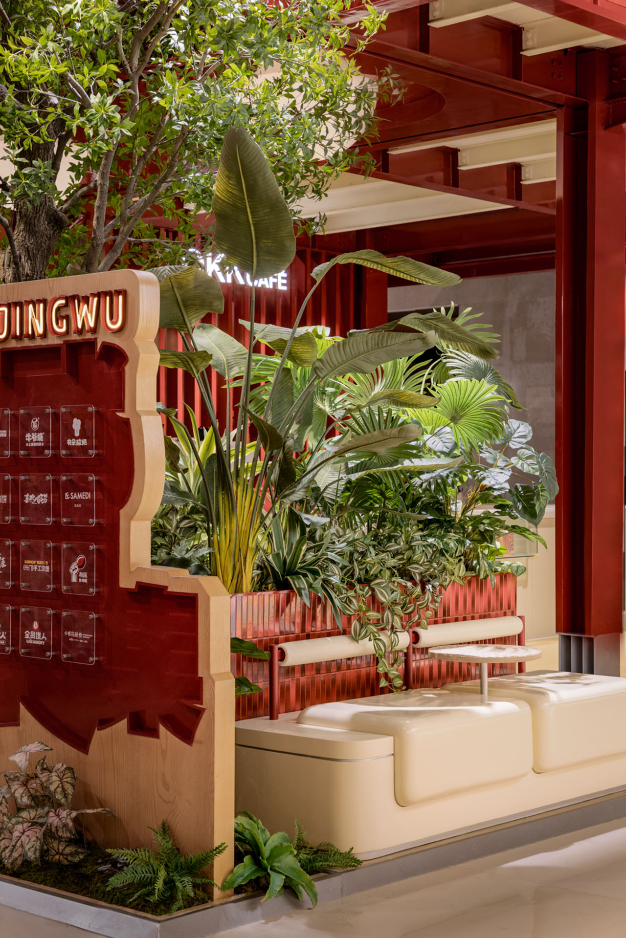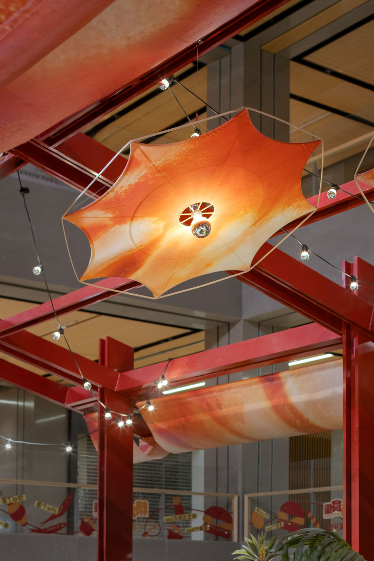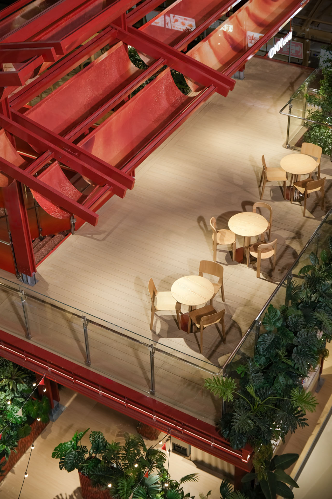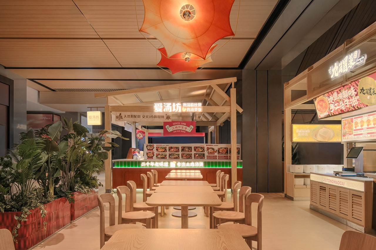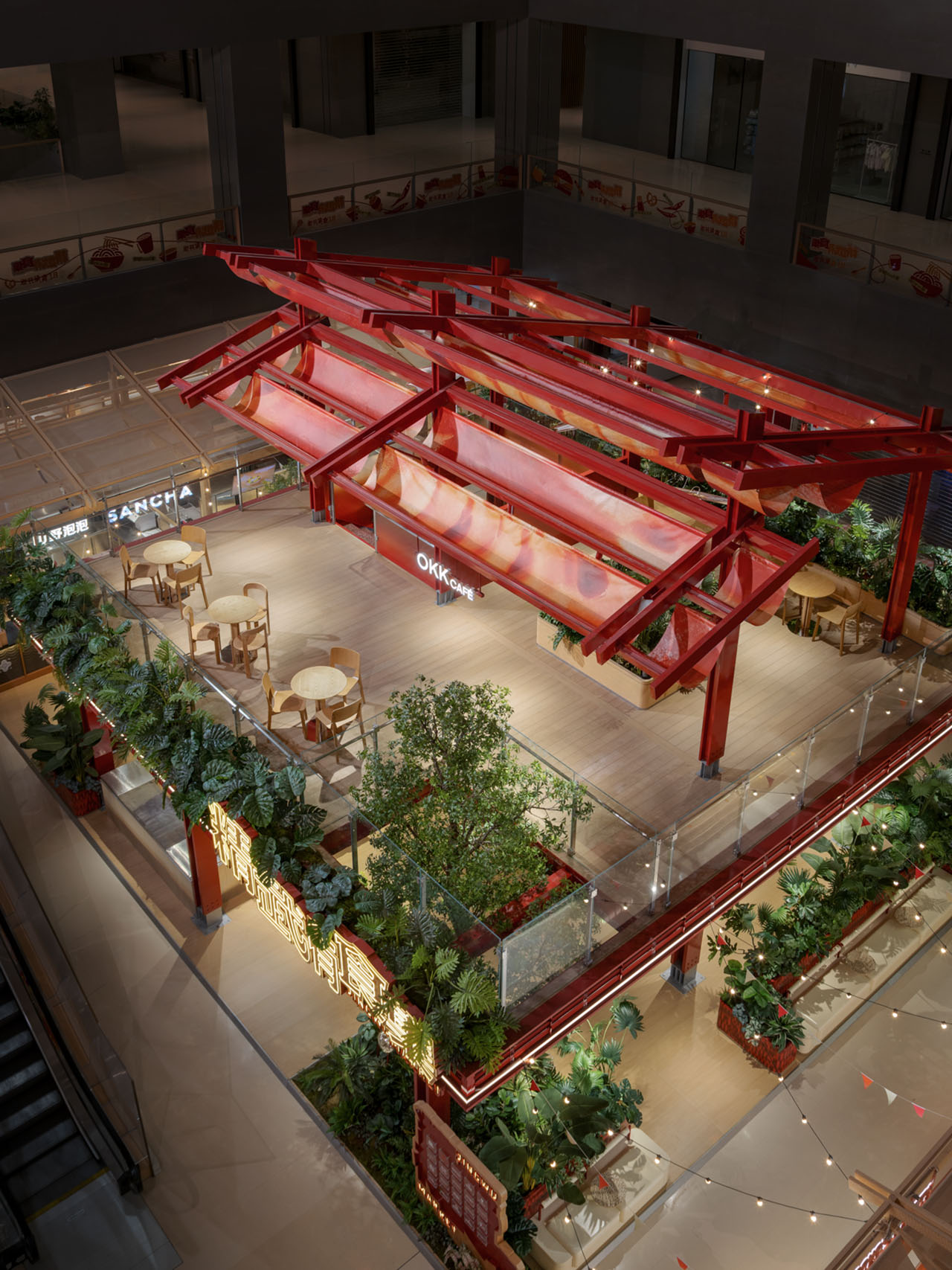 设计以“檐下烟火”为核,用层层叠叠的红色木构屋檐,在都会深处重构起街巷般的围合与归属。穿行其间,温润的红砖与木质肌理包裹着视线。统一的斜顶聚落,让烟火气有了形状。你可以从容地倚坐在廊柱旁,感受食物温热与空间光影交织。