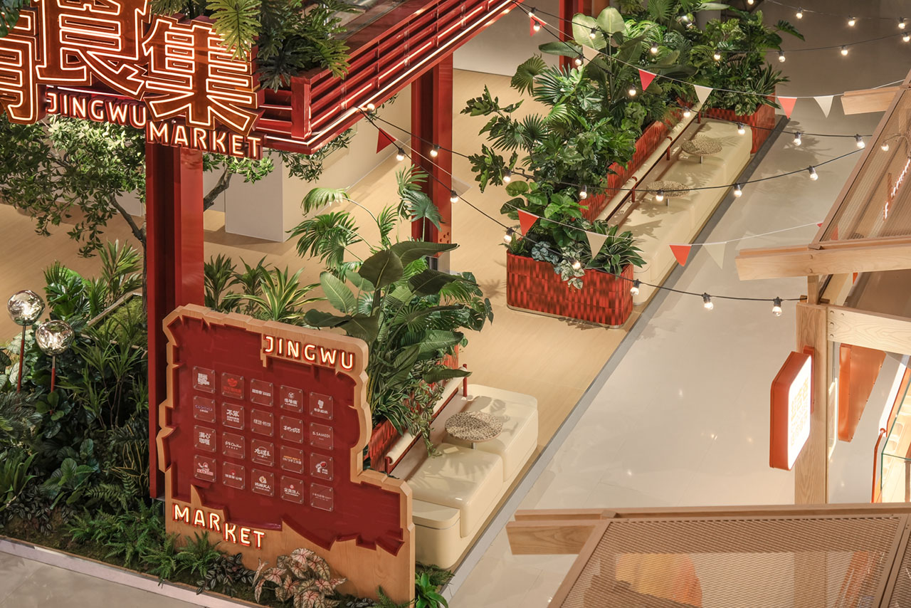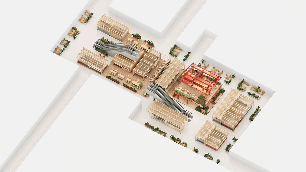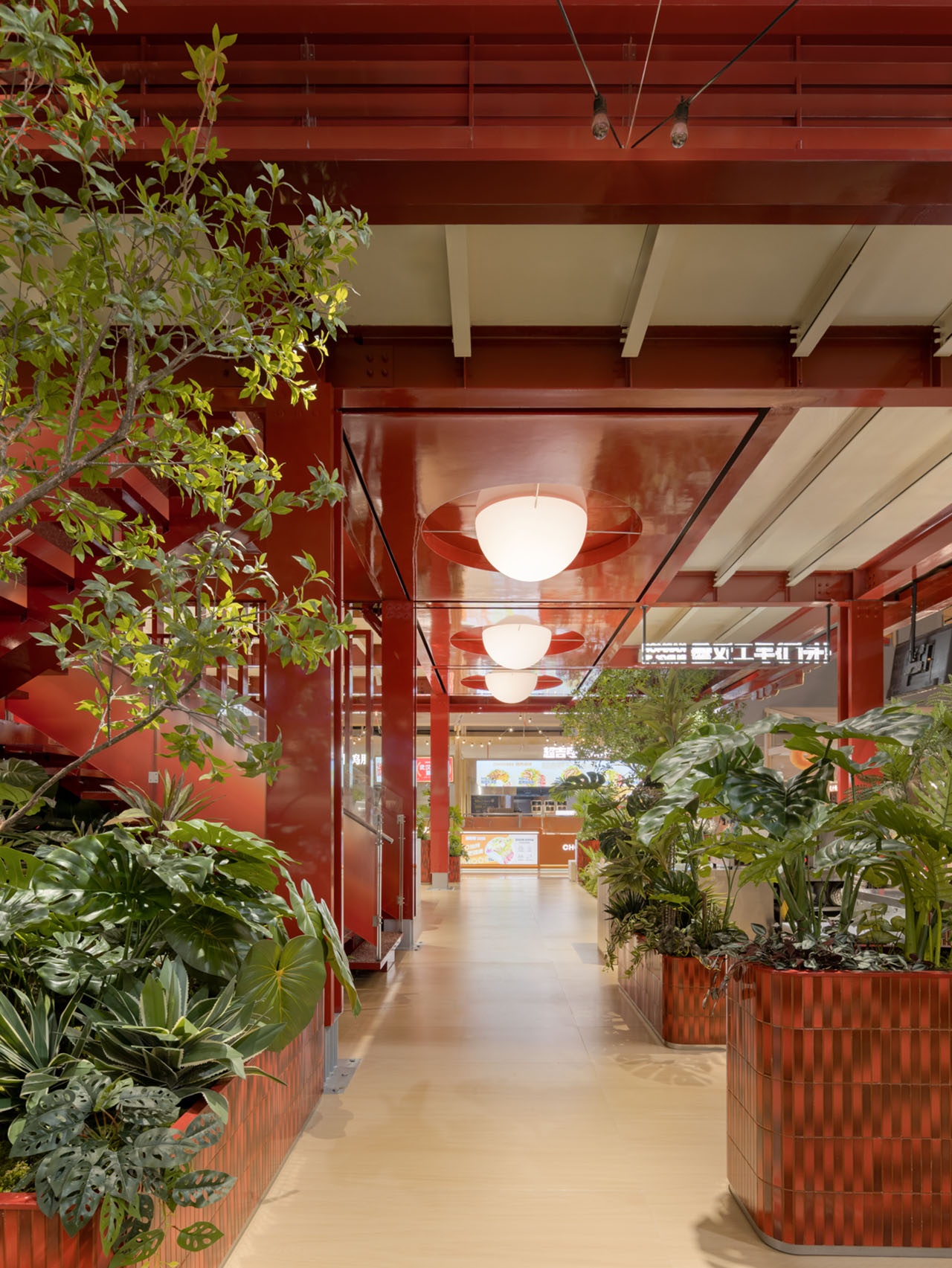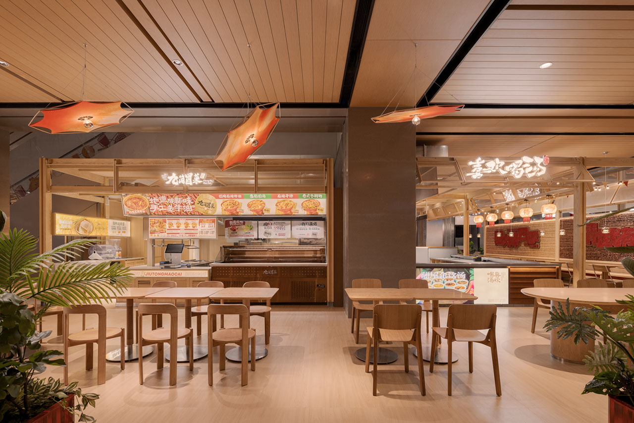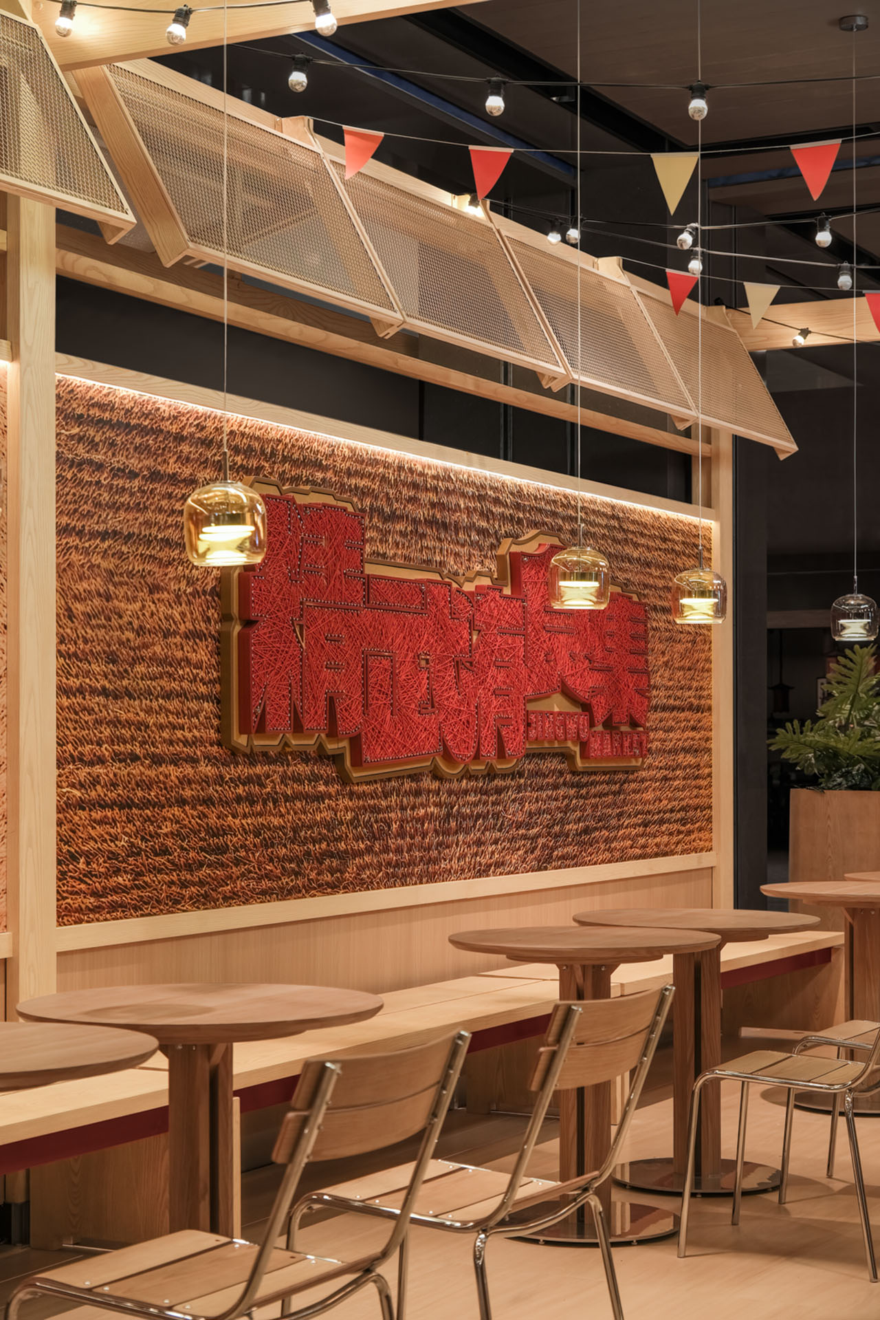 设计以“檐下烟火”为核,用层层叠叠的红色木构屋檐,在都会深处重构起街巷般的围合与归属。穿行其间,温润的红砖与木质肌理包裹着视线。统一的斜顶聚落,让烟火气有了形状。你可以从容地倚坐在廊柱旁,感受食物温热与空间光影交织。