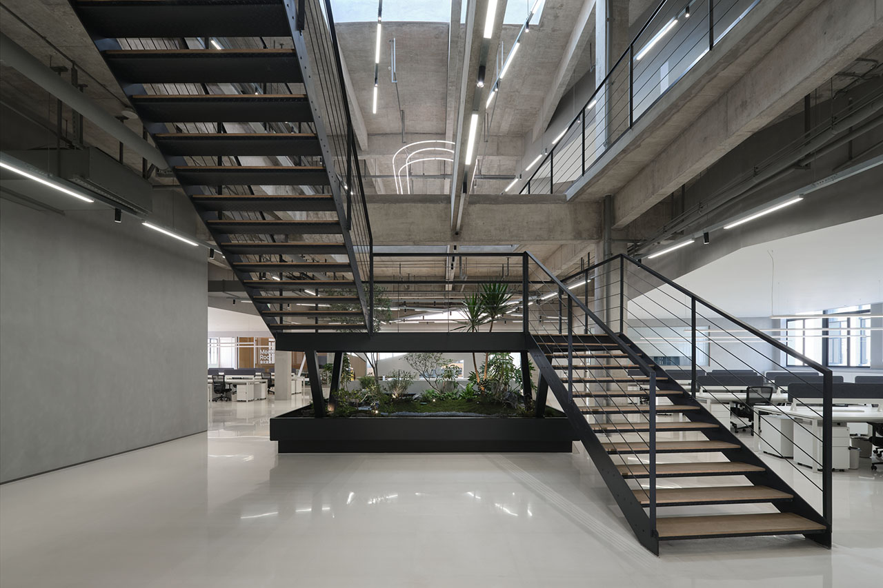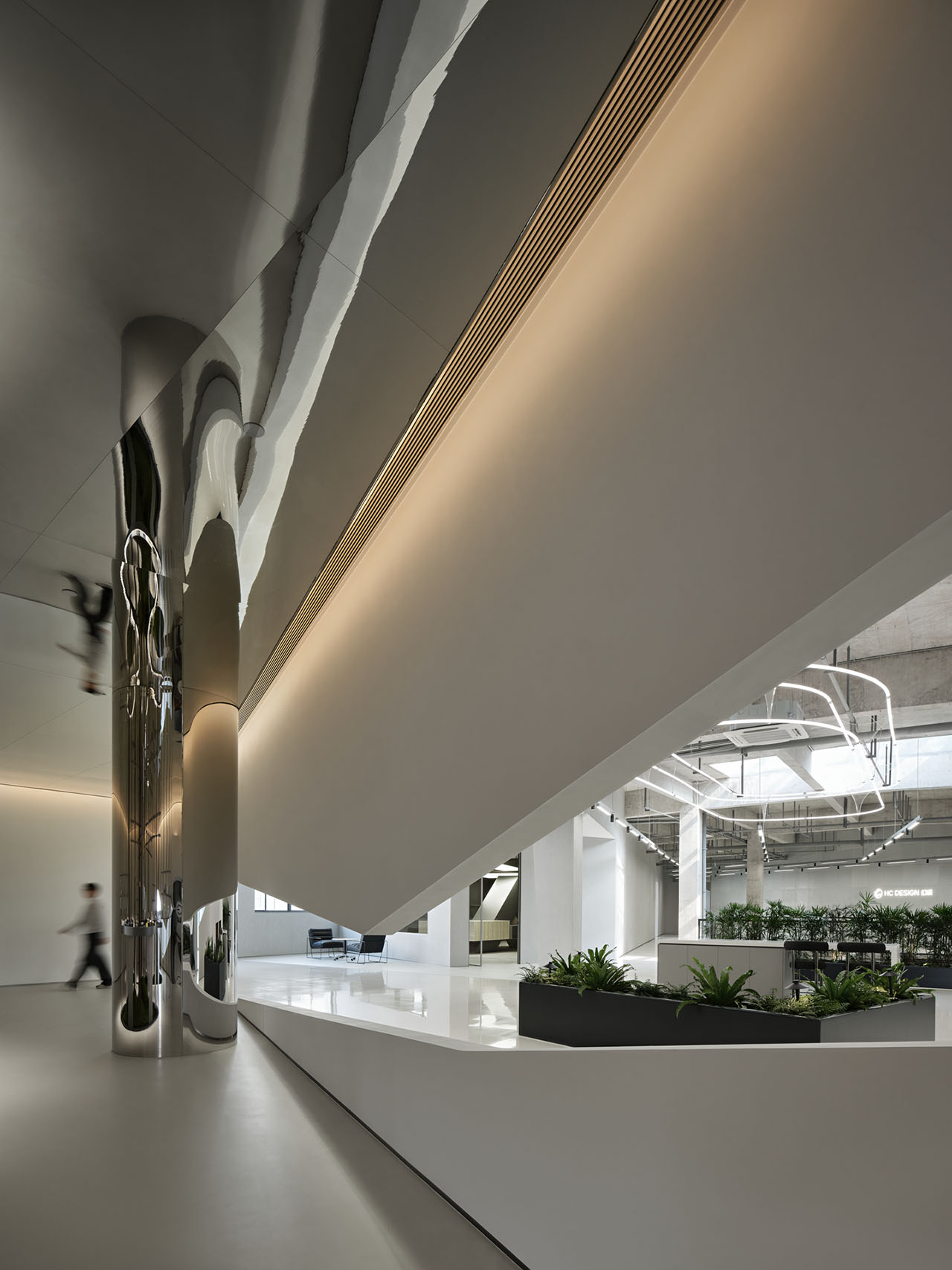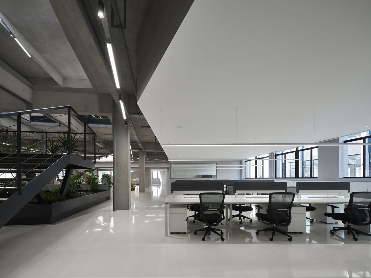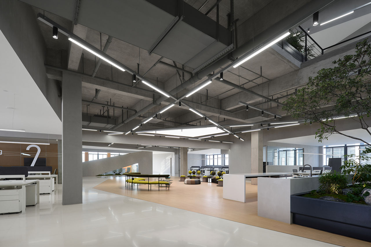 由老旧厂房改造而来的幻成设计中心,是一次关于“破局”的空间实践。项目原为进深65米的三层厂房,采光受限、空间单调。设计以断裂与解构为手法,打破固有形态,呼应产业升级的核心目标。