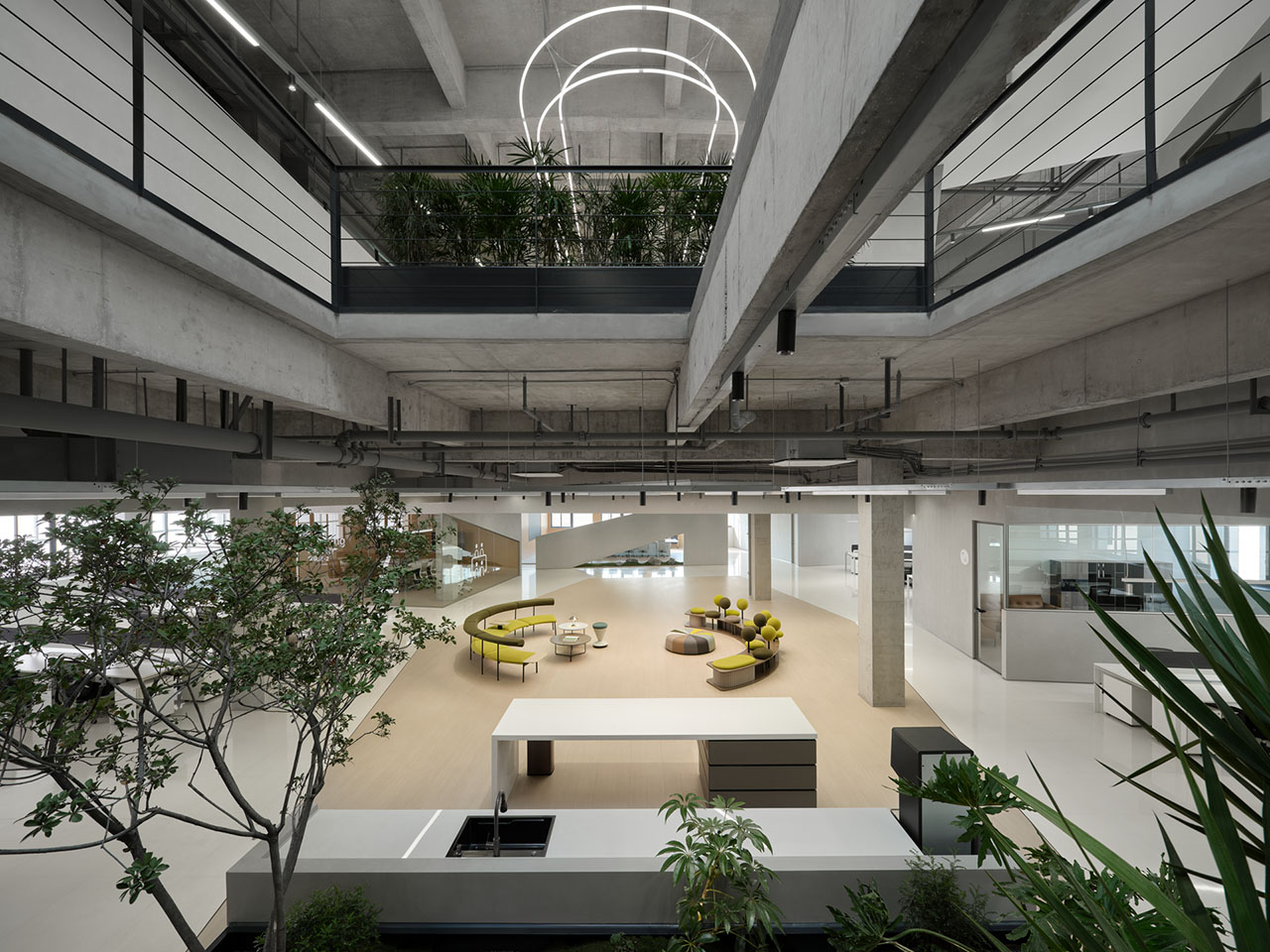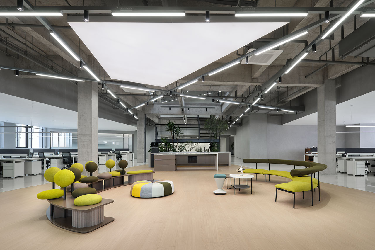 外立面以铝板与聚碳酸酯板重塑,老旧厂房蜕变为兼具时尚感的设计基地。室内以大型斜线切割过长平面,划分灵动功能区域。最打动人心的是光线的重构——屋顶嵌入玻璃天窗,阳光倾泻而下,让空间温暖而通透。