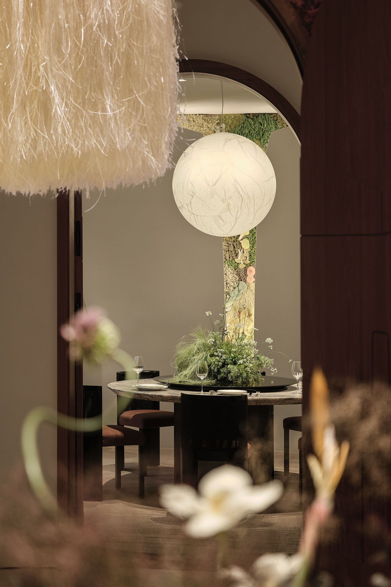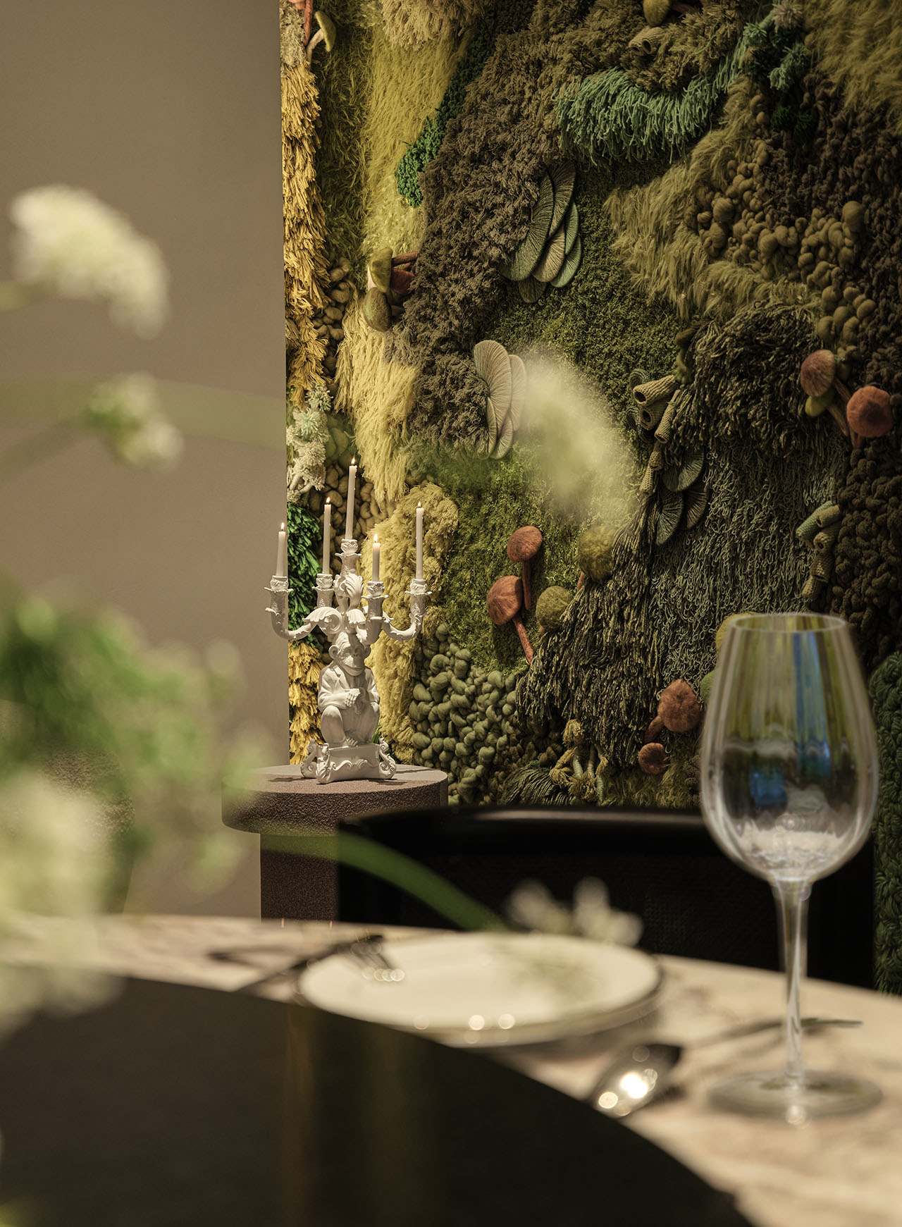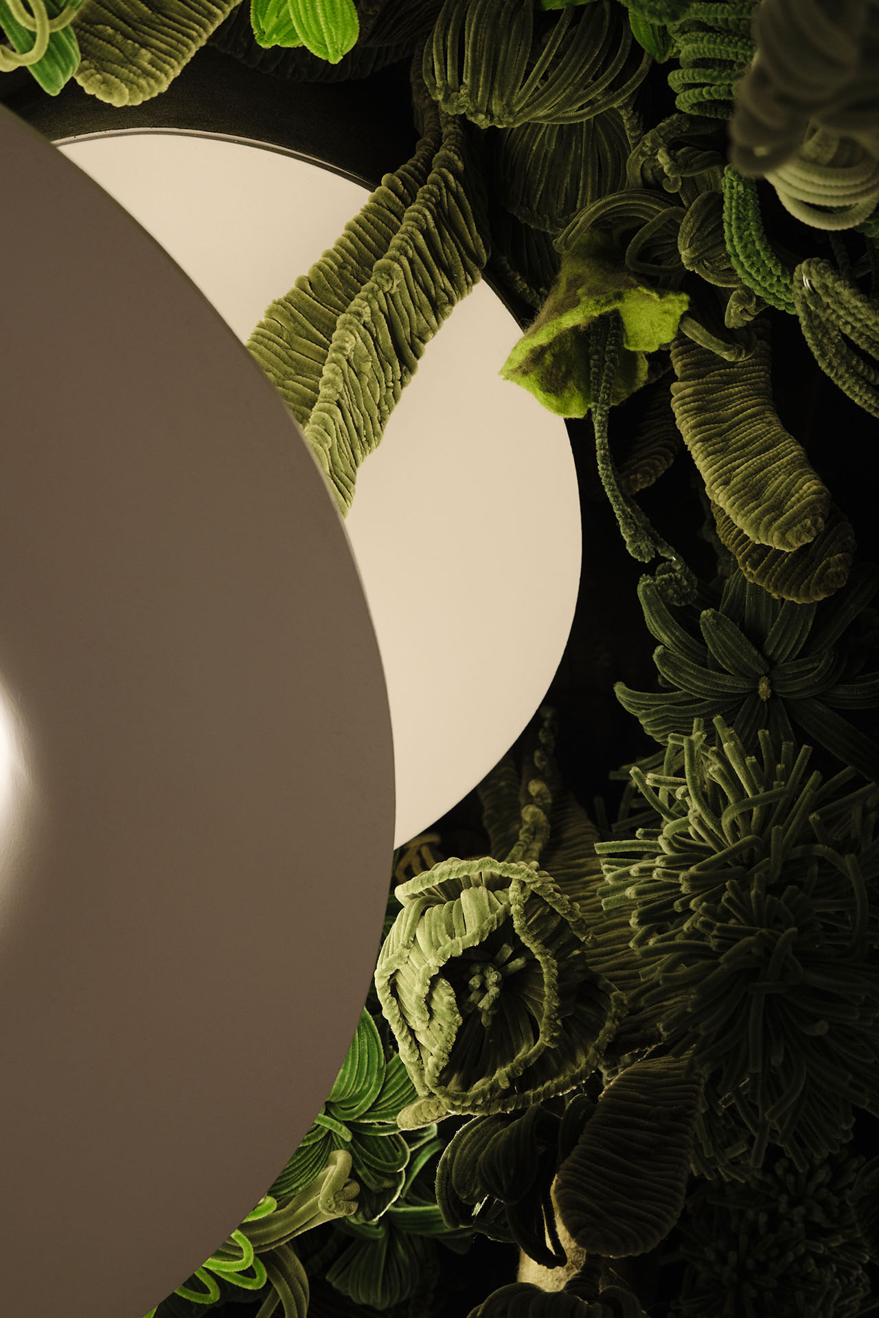 纤维仿生植被从天花垂落,与顶灯光晕交叠。包房内,植被“破墙而出”,菌群从肌理中层层蔓延。挑空边缘,仿生花型沿弧度垂落,像从顶层生长而下。深靛蓝水吧台旁,鲜绿花艺承接光感,更添松弛。