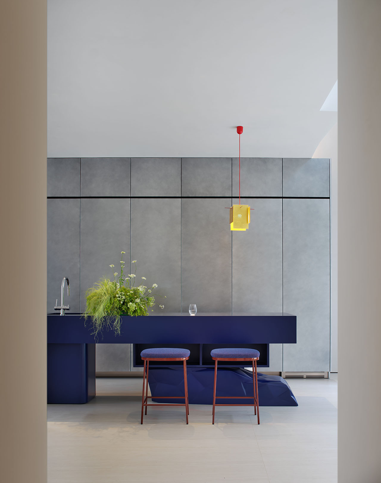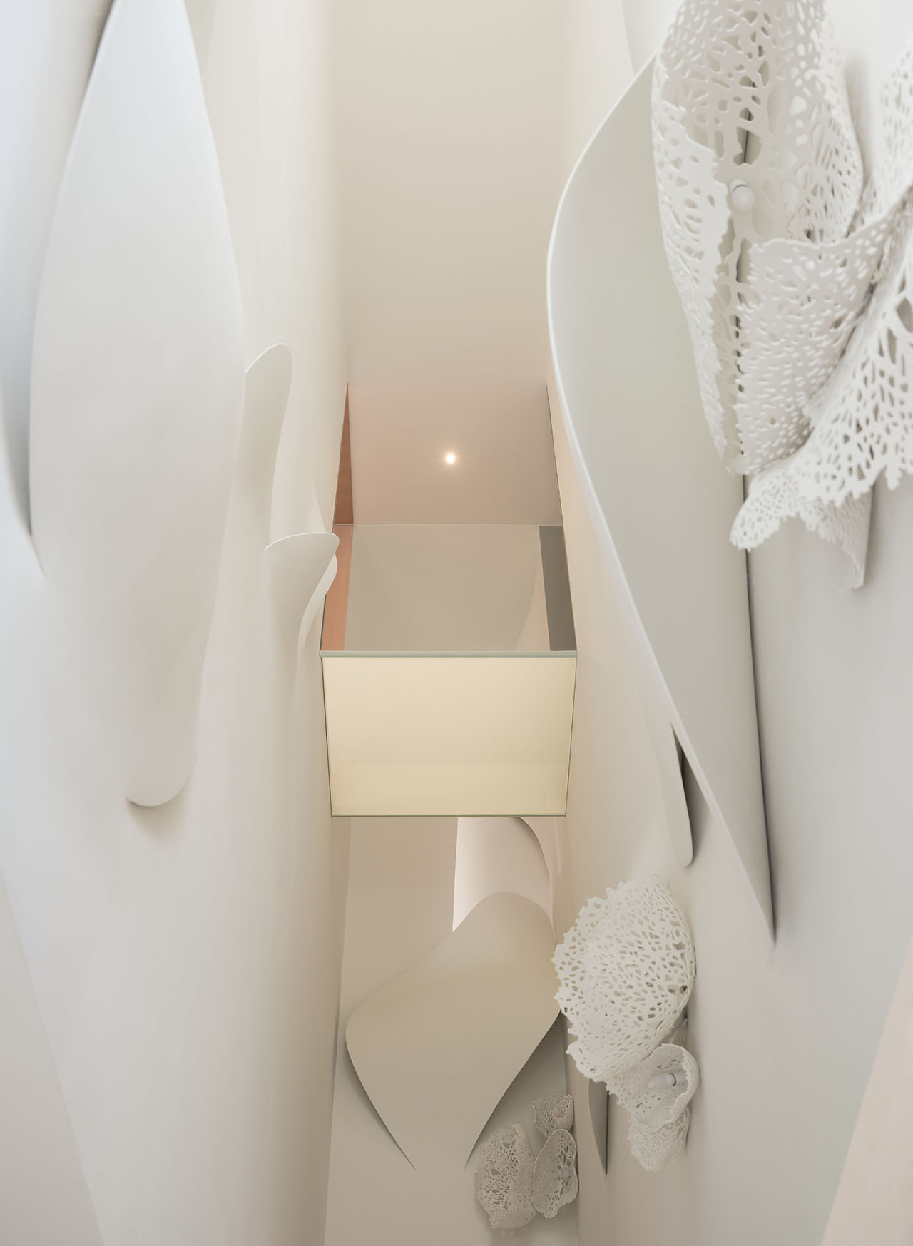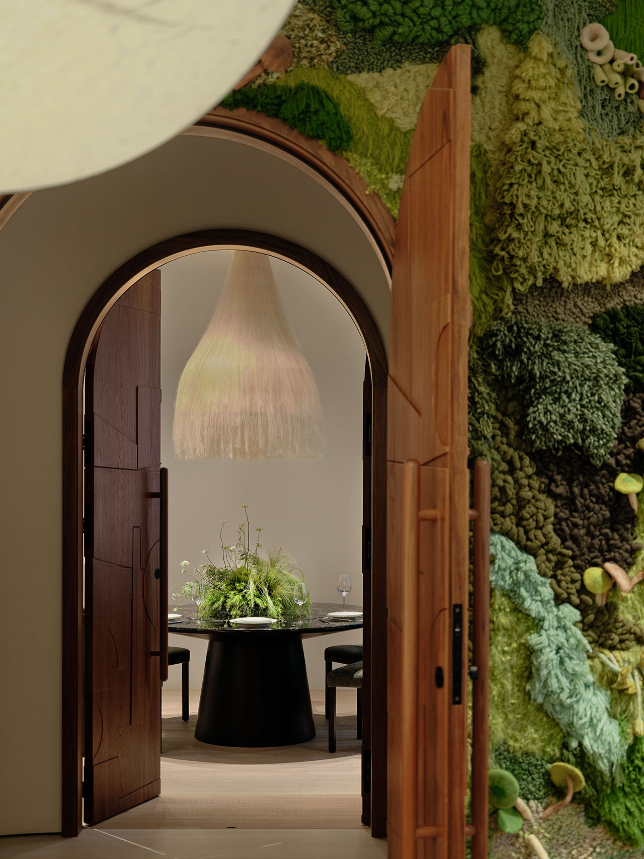 纤维仿生植被从天花垂落,与顶灯光晕交叠。包房内,植被“破墙而出”,菌群从肌理中层层蔓延。挑空边缘,仿生花型沿弧度垂落,像从顶层生长而下。深靛蓝水吧台旁,鲜绿花艺承接光感,更添松弛。