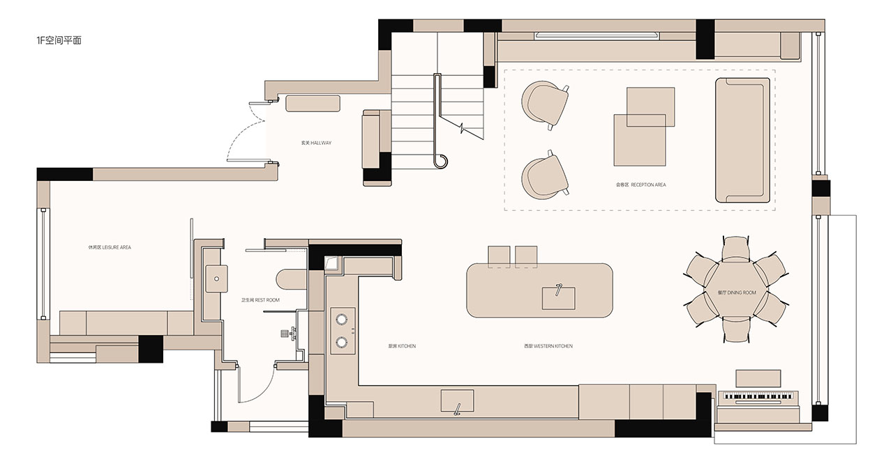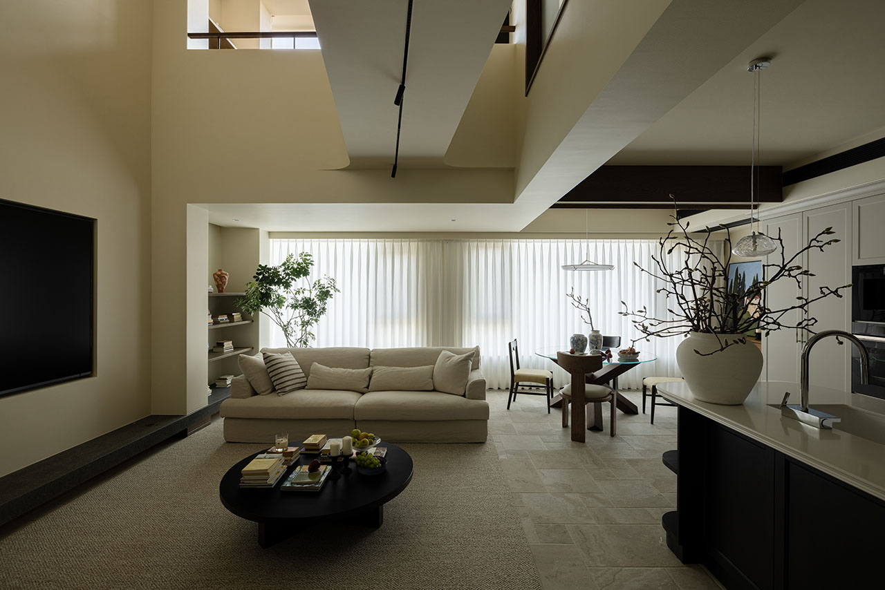 建筑原生的三层格局暗含挑战:单层面积局促导致空间功能割裂,空间个性趋于模糊,设计团队以“功能重叠”为设计思路,重构不同场域的空间秩序——将传统界限分明的客餐厅、中西厨转化为具有渗透性的复合空间系统,通过精细化的流线重组,实现功能模块既独立又交融的共生状态。这种去中心化的布局策略,不仅释放出超越物理面积的视觉张力,更赋予居住者自由定义场景的主动权。