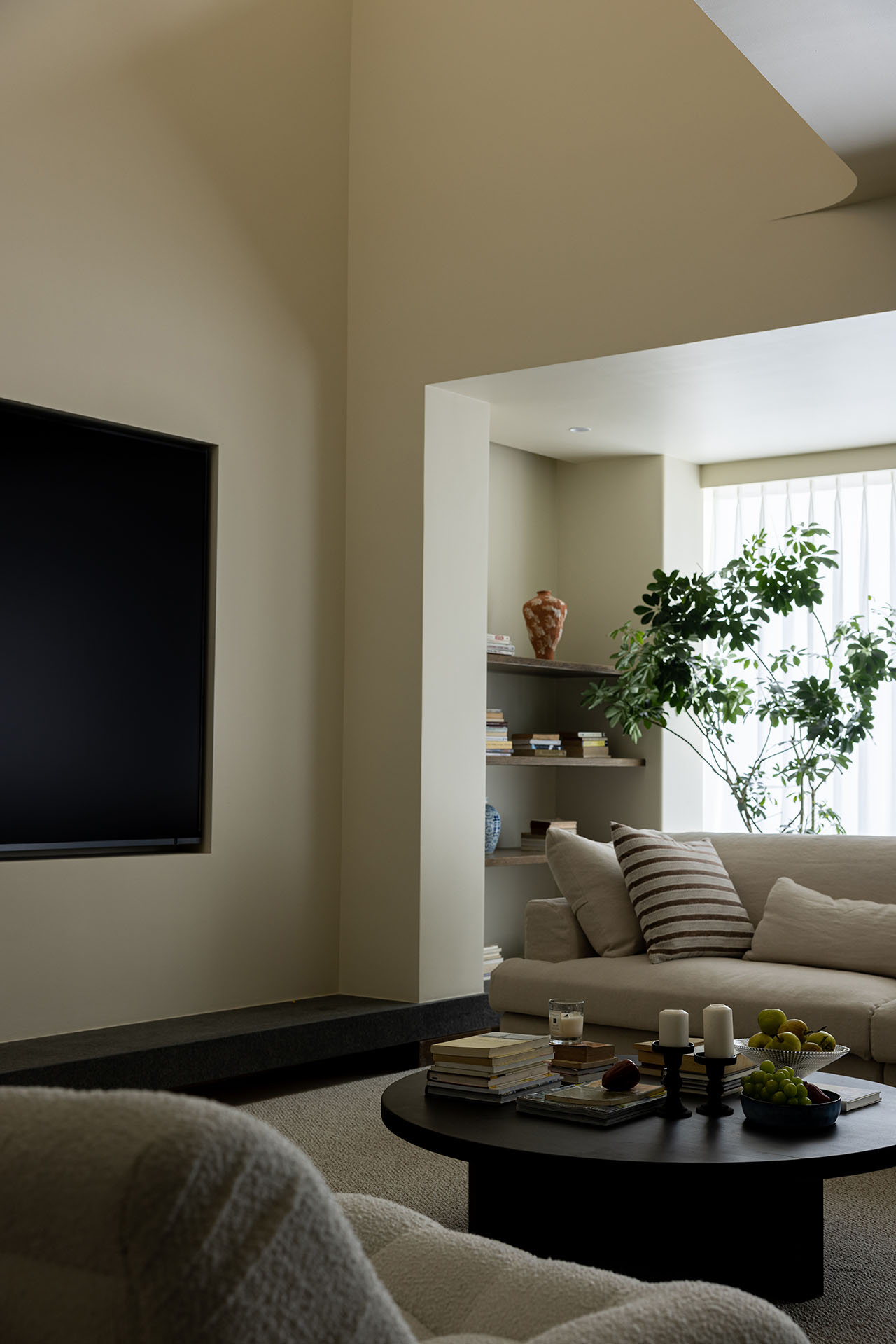 在客厅空间,设计团队通过围合式布局构建起具有呼吸感的社交场域,在亲生物设计理念的指引下,天然材质成为空间的叙事主线,木质元素自带着温润气质与粗砺的莱姆石地砖形成空间对话。留白让每个褶皱都暗藏生活的脚本——棉麻温柔的触感让沙发随时都有陷入的“危险”,手作陶花器静待新鲜的花枝,深色面的茶几像幕布一样上演着此刻的生活状态,所有物件都在等待故事的自然生长。