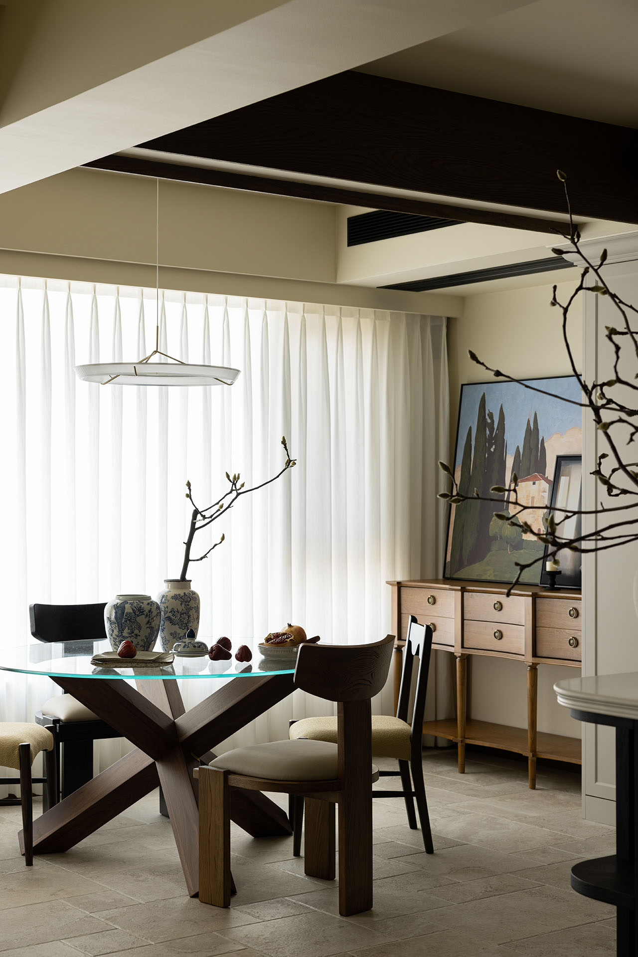 在餐厅空间的设计中,餐桌利用圆形玻璃台面悬浮于胡桃木基座之上,木质纹理与玻璃的通透感形成巧妙的平衡,当阳光穿过纱帘,在瑞士画家汉斯·埃蒙内格尔(Hans Emmenegger)的画作上跃动,与空间产生了奇妙共振。