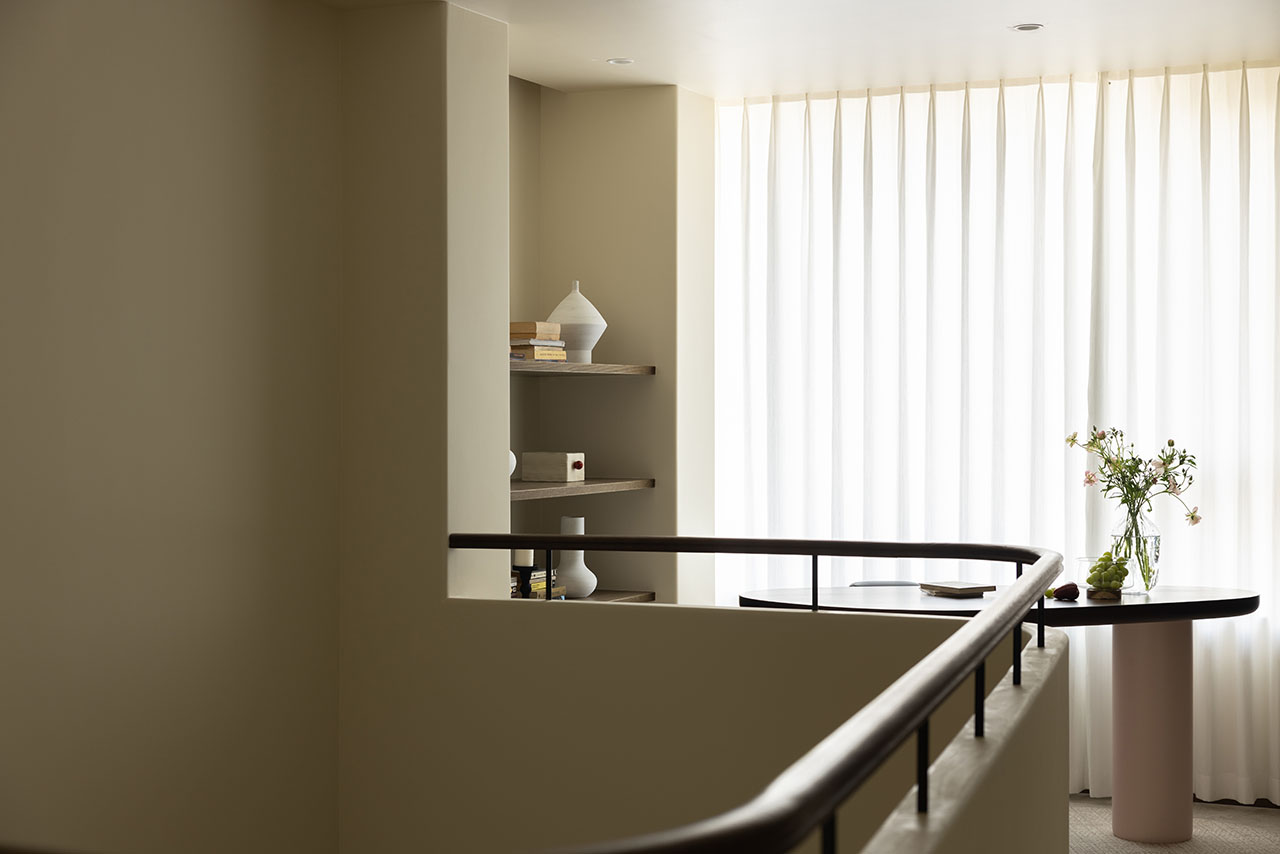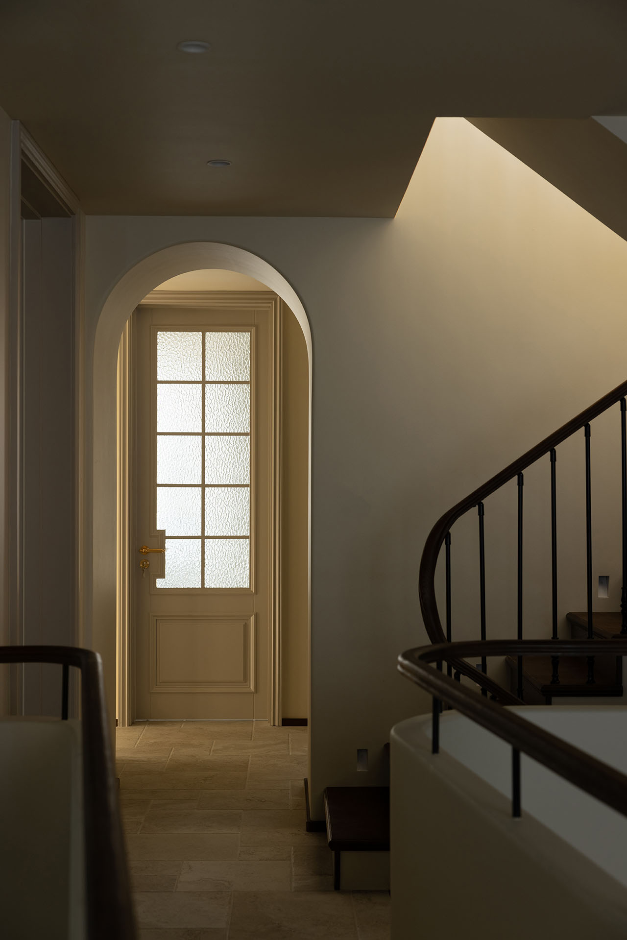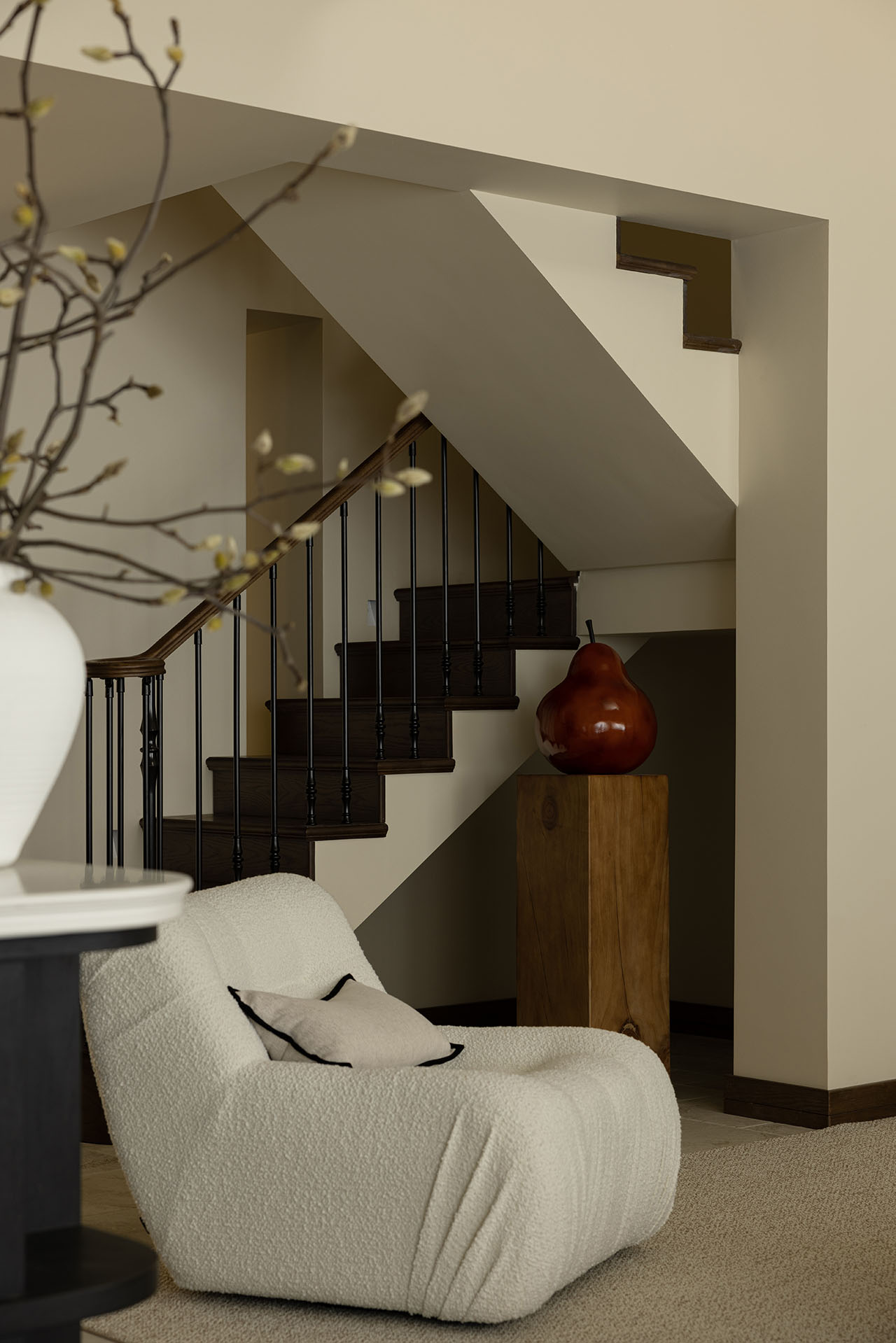 楼梯的首阶踏面进行弧形延展,形成具有邀请意味的过渡空间。胡桃木踏板与铁艺扶手构成力学与美学的二重奏,风格统一且精致,同时,去踢脚线工艺使楼梯从视觉上更为轻盈。楼梯角落的梨形摆件作为视觉标点,其抛光面与踏面木纹形成材质共鸣。无论是材料收口的微妙处理,还是光影层次的渐进铺陈,含蓄之美在此转化为可感知的空间韵律。