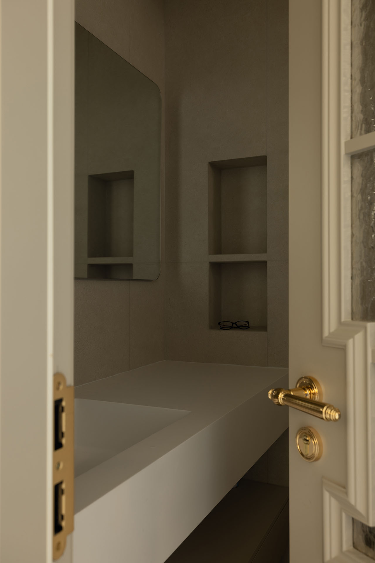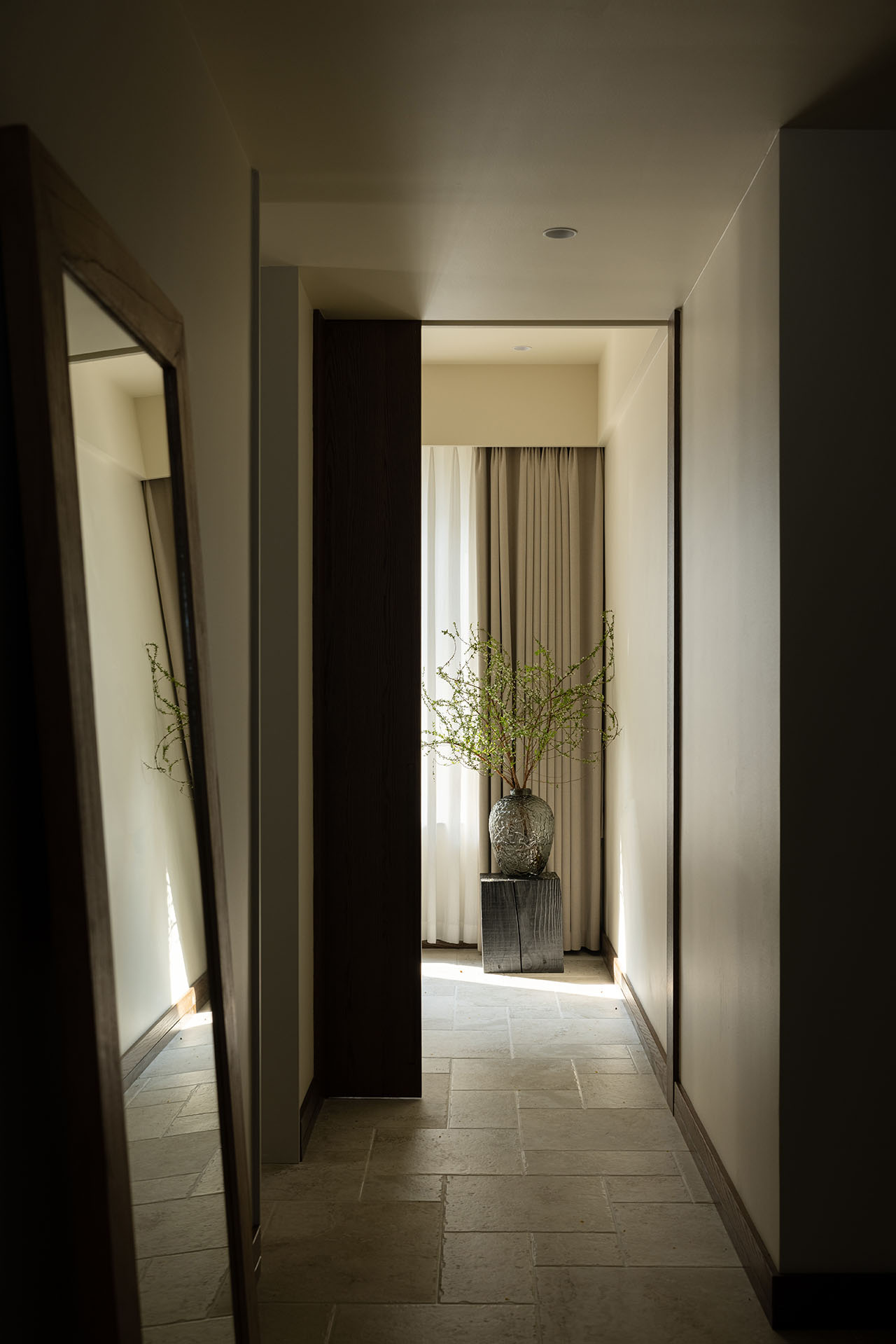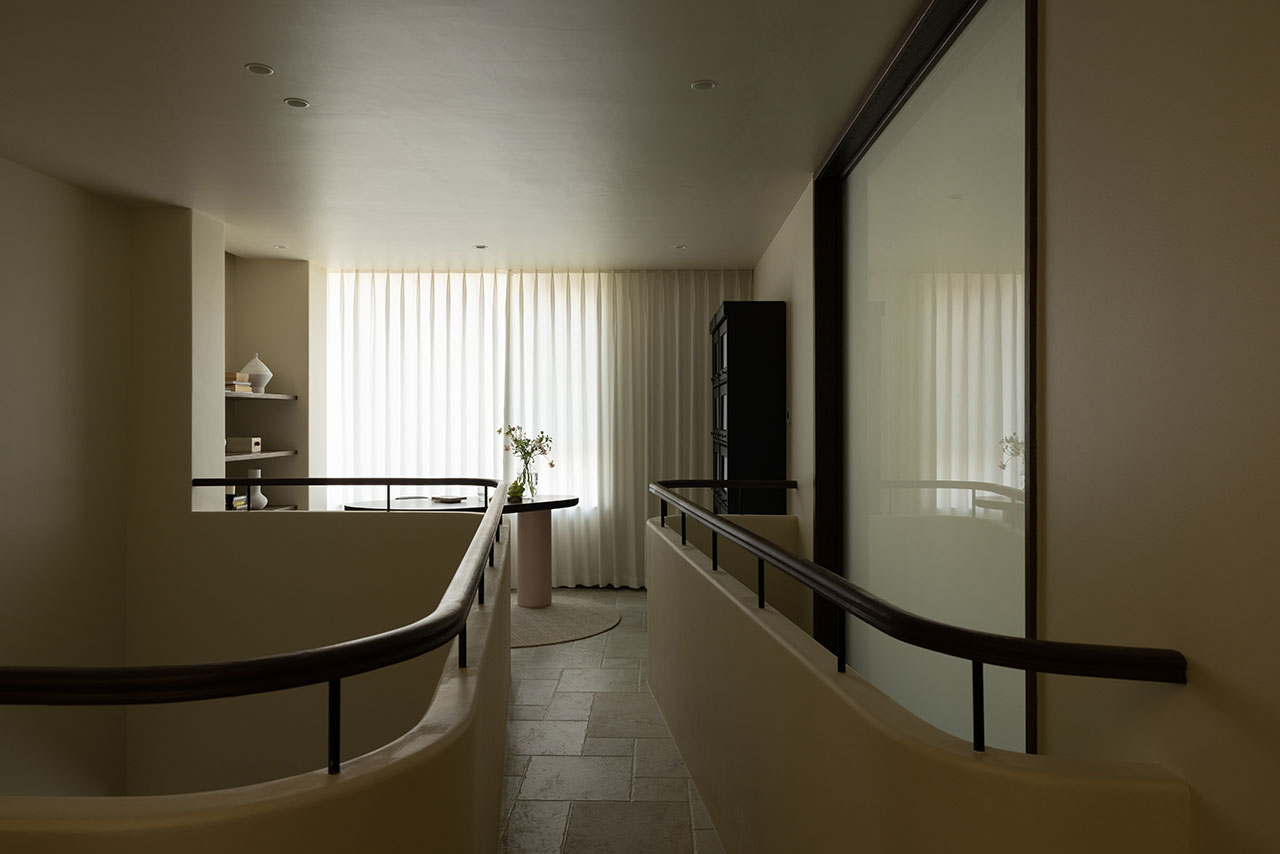 楼梯的首阶踏面进行弧形延展,形成具有邀请意味的过渡空间。胡桃木踏板与铁艺扶手构成力学与美学的二重奏,风格统一且精致,同时,去踢脚线工艺使楼梯从视觉上更为轻盈。楼梯角落的梨形摆件作为视觉标点,其抛光面与踏面木纹形成材质共鸣。无论是材料收口的微妙处理,还是光影层次的渐进铺陈,含蓄之美在此转化为可感知的空间韵律。