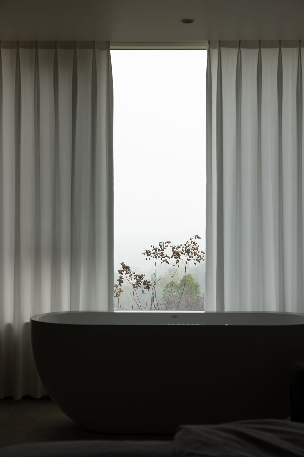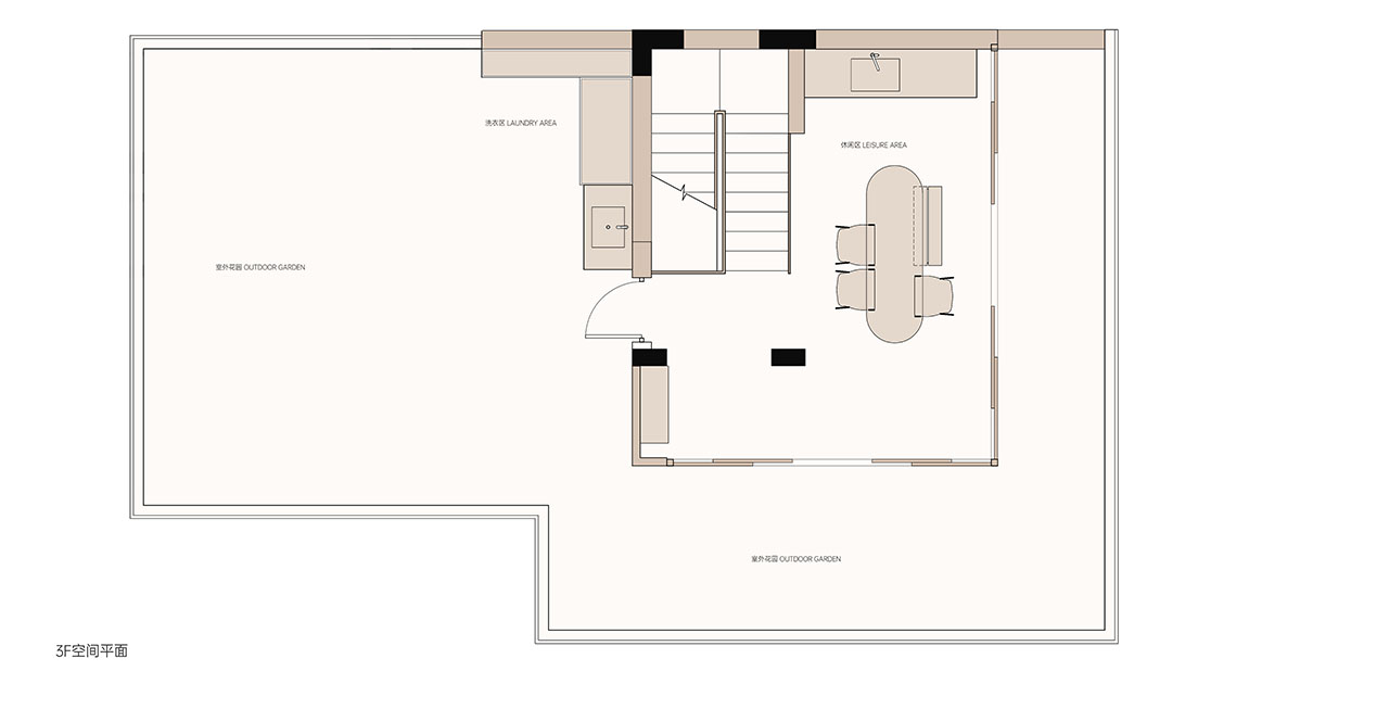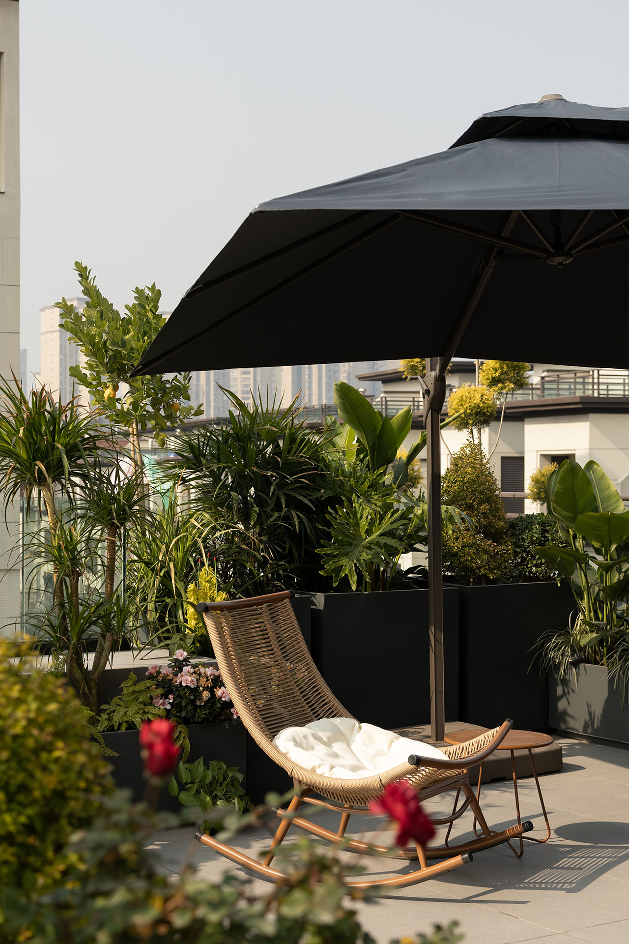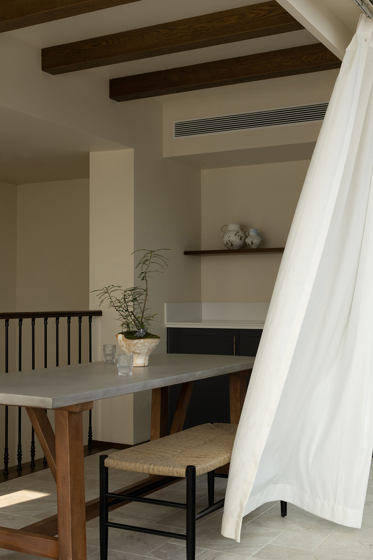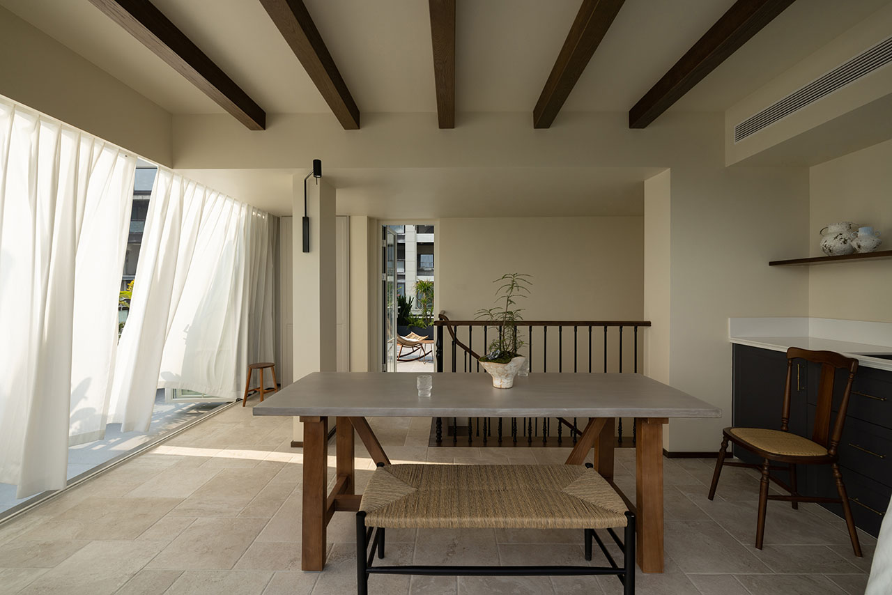 对于整体风格的把控,也是设计师对当代理想栖居的深度思考后的呈现。墙面阳角弧化处理塑造温润触感,原木梁架与铁艺楼梯的材质对话,隐藏式收纳系统的洁净界面,定制黄铜门把手的温度传递,让空间在粗犷与精致间找到平衡支点,恰如其分地烘托出松弛氛围,共同编织出“去设计感”的居住真意。顶层空间则完成室内外的终极对话,茶室借由阳光房的独到优势,与户外花园以折叠门形成连接,不同天气模式下切换使用场景。