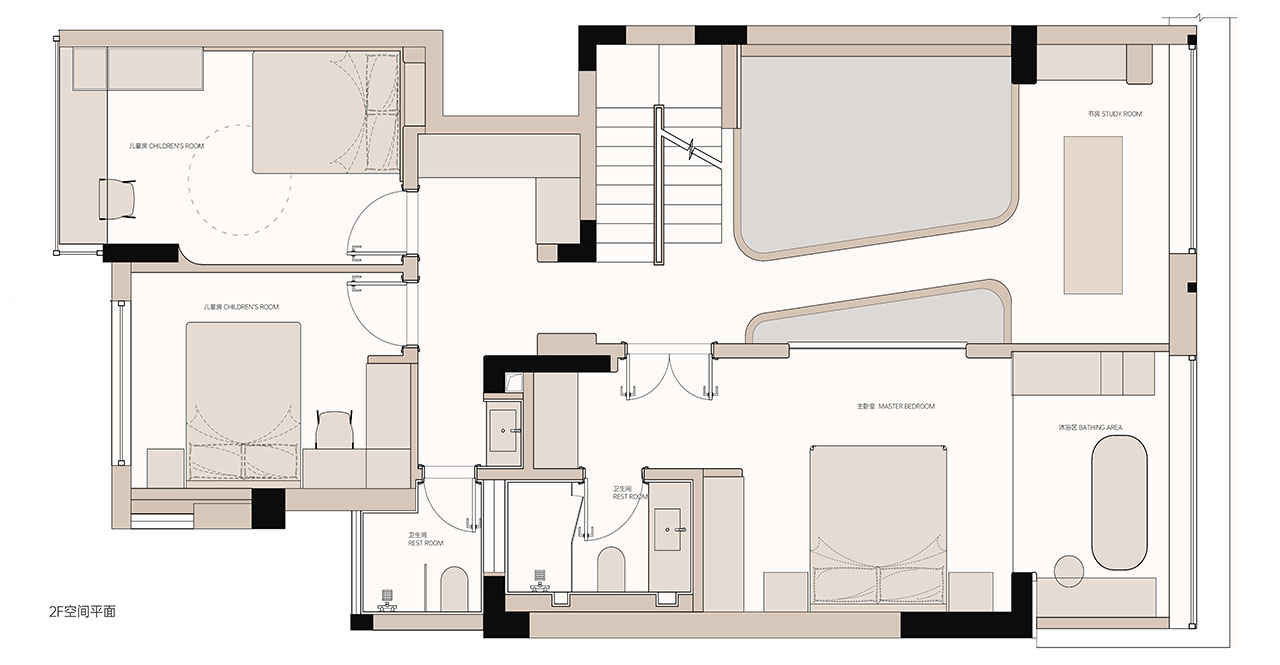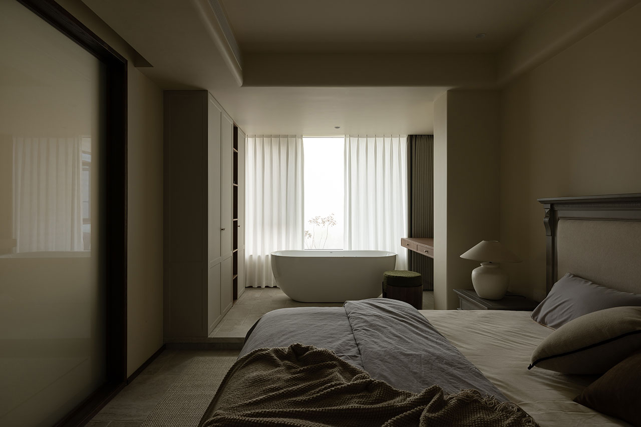 主卧以沉浸式休憩美学重新定义空间节奏,临窗区域通过抬升地台打造阶梯式空间层次,独立浴缸成为了景观容器,当夜幕降临时,氤氲水汽与城市灯火交相辉映。除此之外,隔断墙体我们采用智能雾化玻璃系统,通透模式下形成垂直维度的视觉延伸,可与一层的生活场域保持温暖互动;雾化模式开启时则化身光影幕布,在虚实变换中构筑起静谧的私人结界。