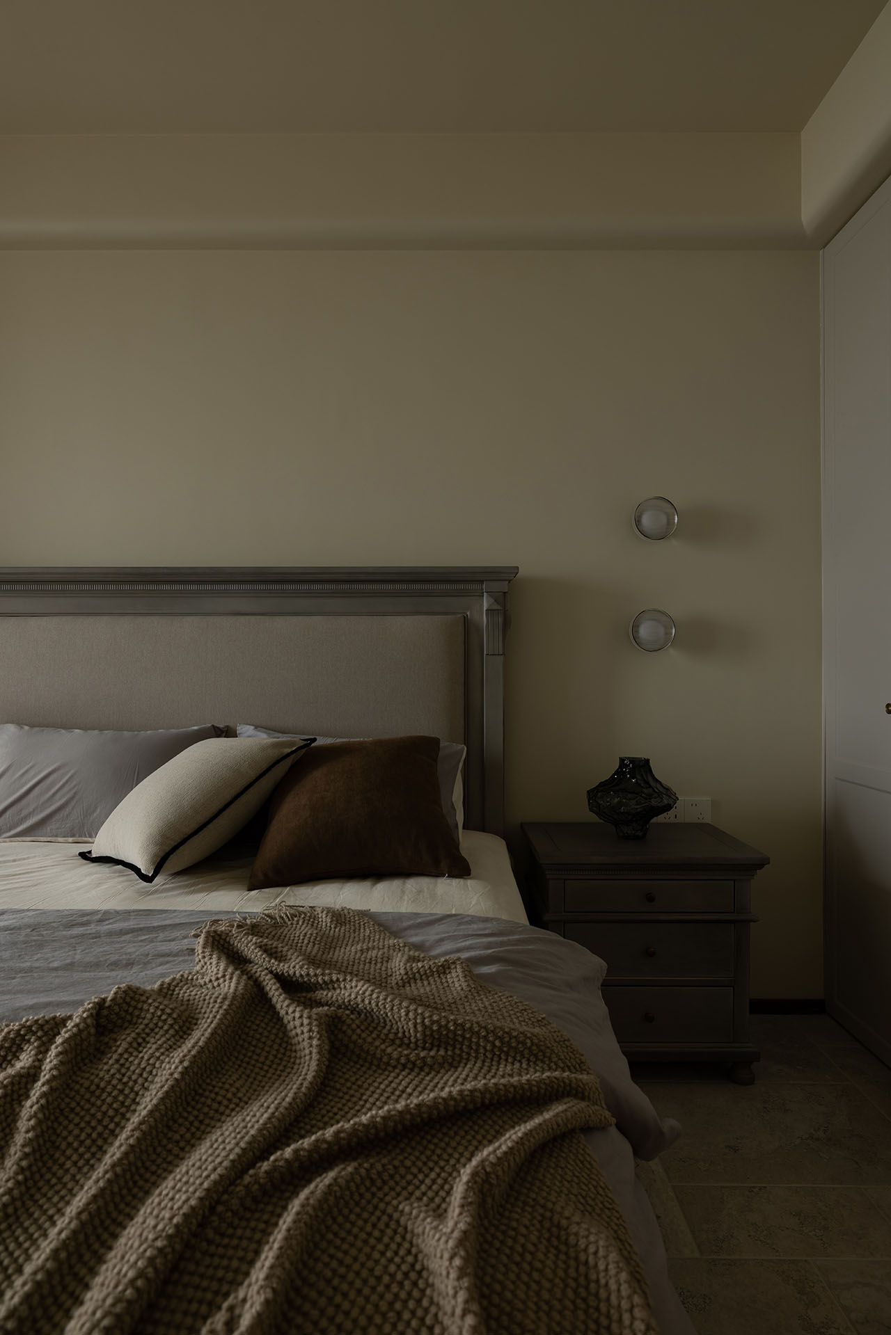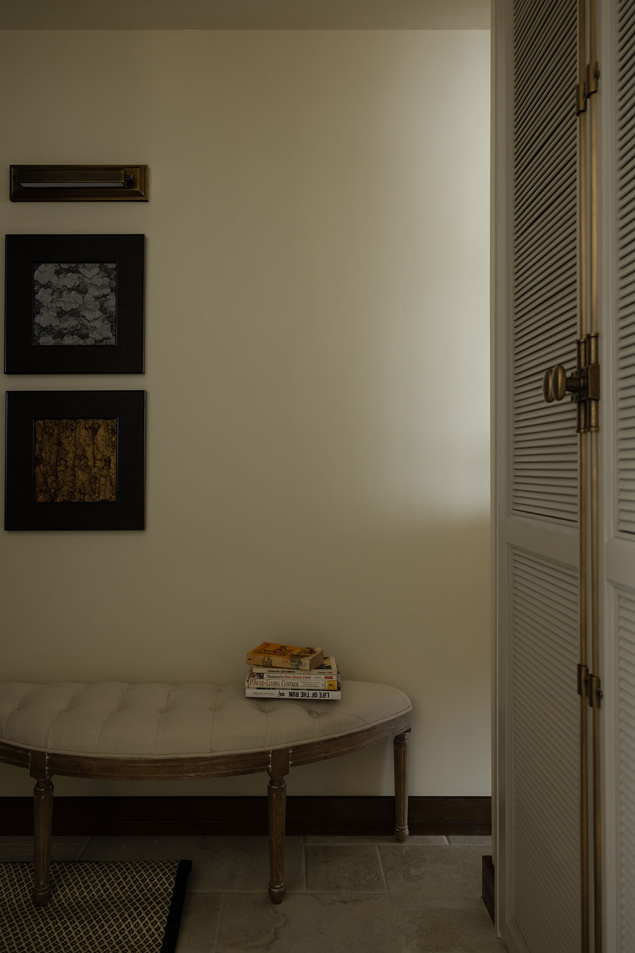 入户空间以东方美学为精神内核,巧妙植入美式乡村的质朴元素,构筑起关于家的初始感知。在衔接门厅与楼梯的过渡界面上,以黄金比例凿造透景窗洞,“隔而不绝”的设计哲学建立起空间对话的视觉通道,又借光影游移形成空间蒙太奇。百叶门鞋柜搭配古铜色拉手,与复古坐凳形成材质对话,墙面壁画灯与装饰画的装置,呼应整体空间的调性,在功能与意境的平衡中,完成“归栖”命题的完整表达。