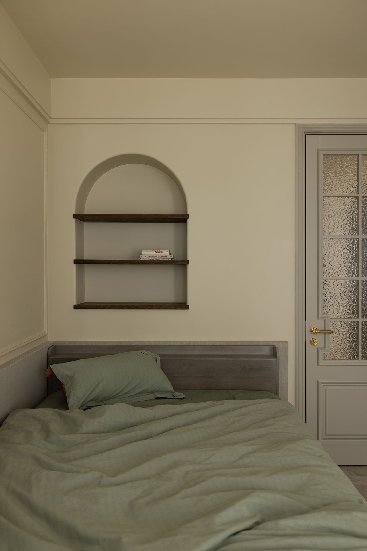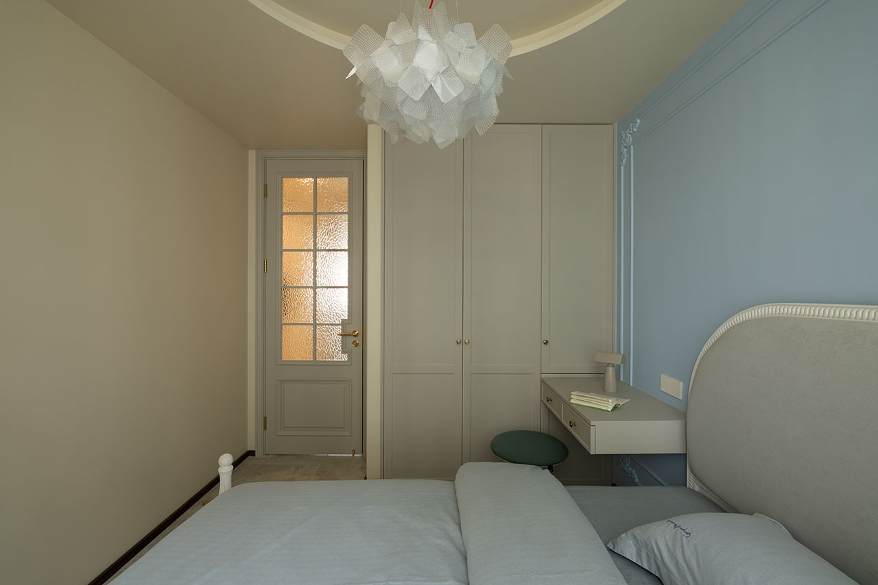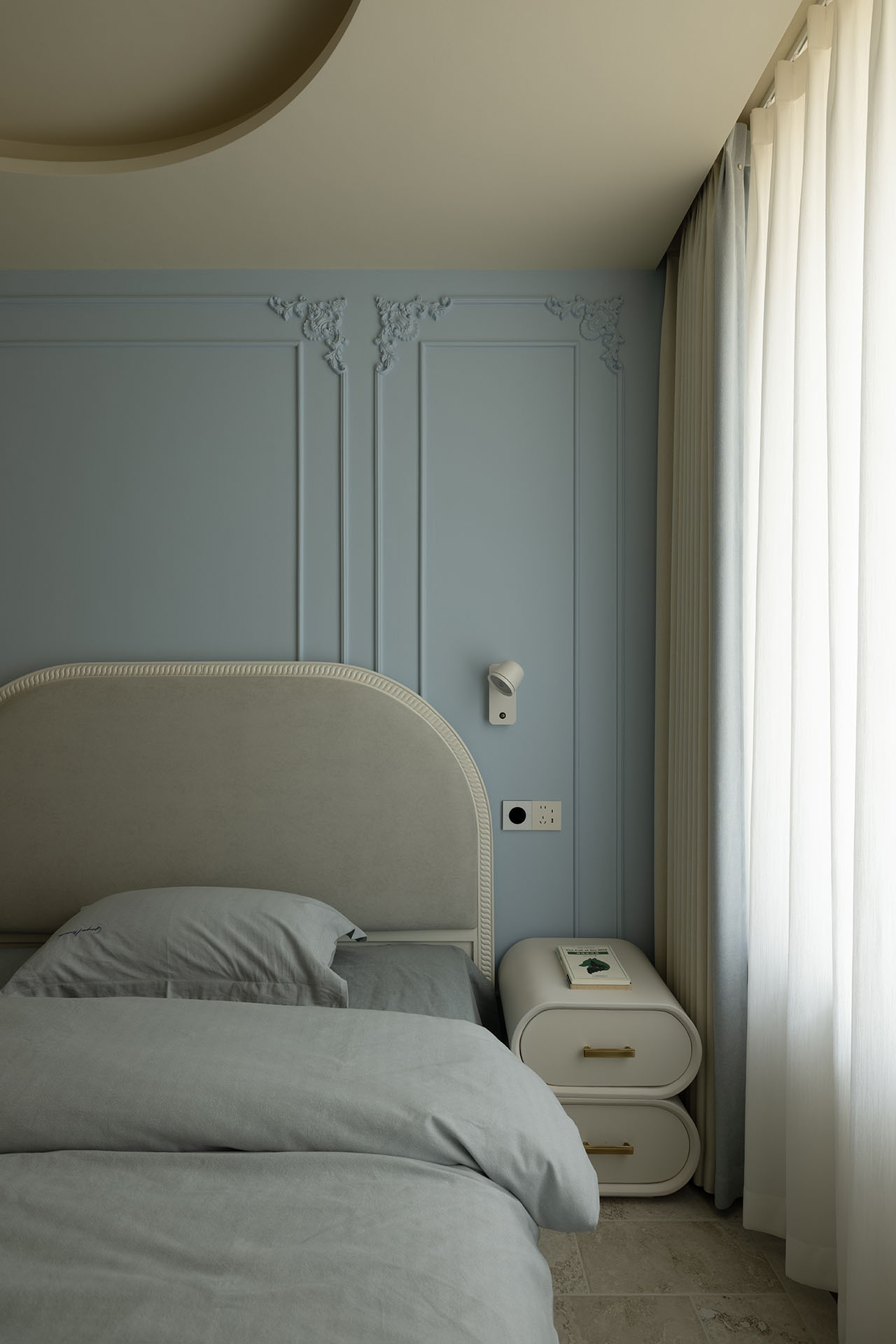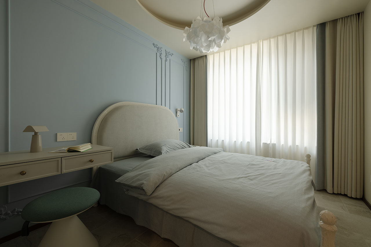 儿童房设计遵循成长型空间理念,以成长轨迹为创作蓝本,深度洞察小主人的性格和生活习惯,分别为兄妹两人打造不同风格的成长空间。针对女儿房采用浅蓝色艺术涂料铺陈基底,辅以立体石膏线装饰墙面,圆弧形天花吊顶弱化空间棱角,既满足儿童期的童话幻想,亦预留青春期功能迭代的接口;男孩房通过模块化设计实现功能整合,墙面通过打造壁龛造型破除单调感,定制悬浮书桌与柜体形成L型学习矩阵。