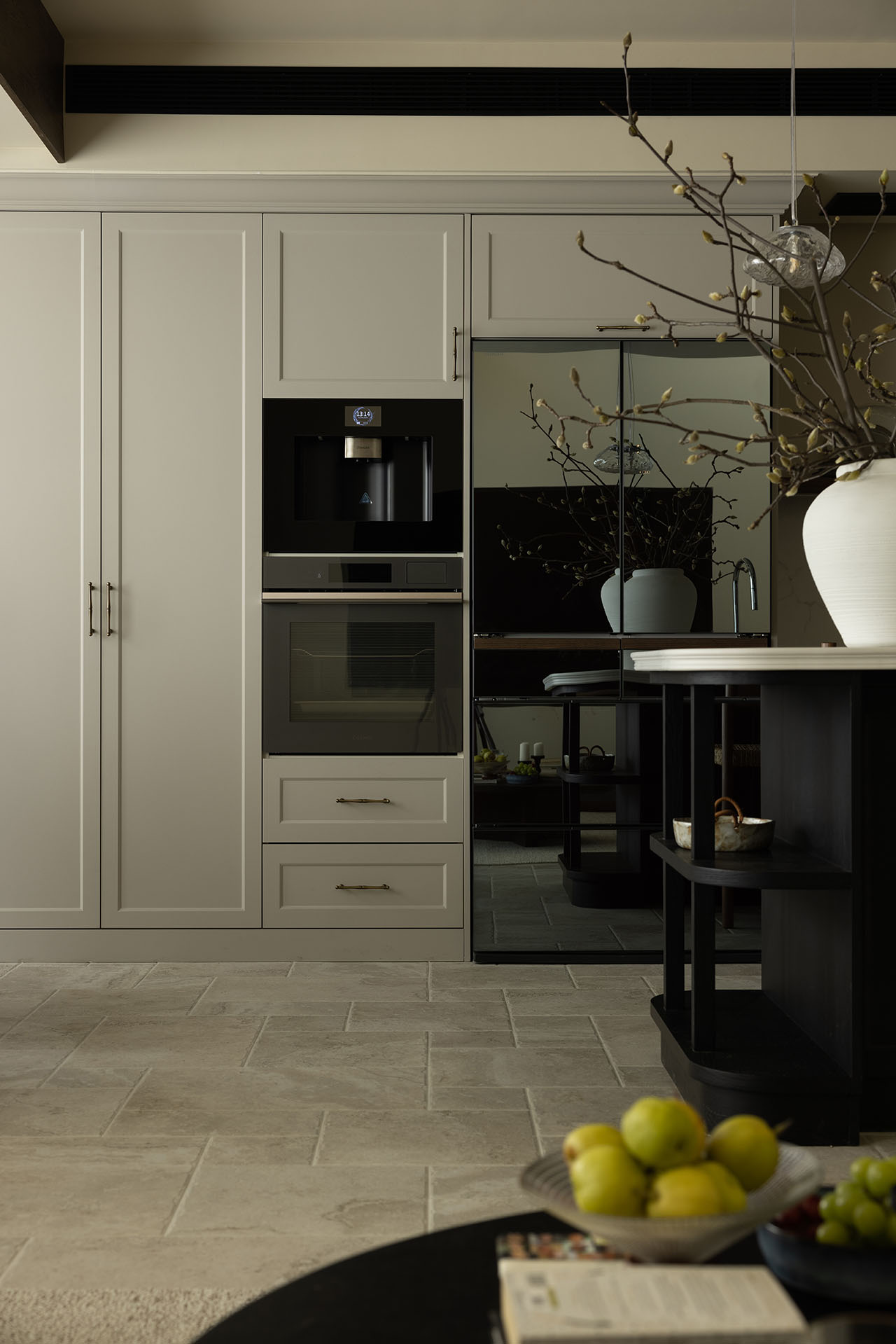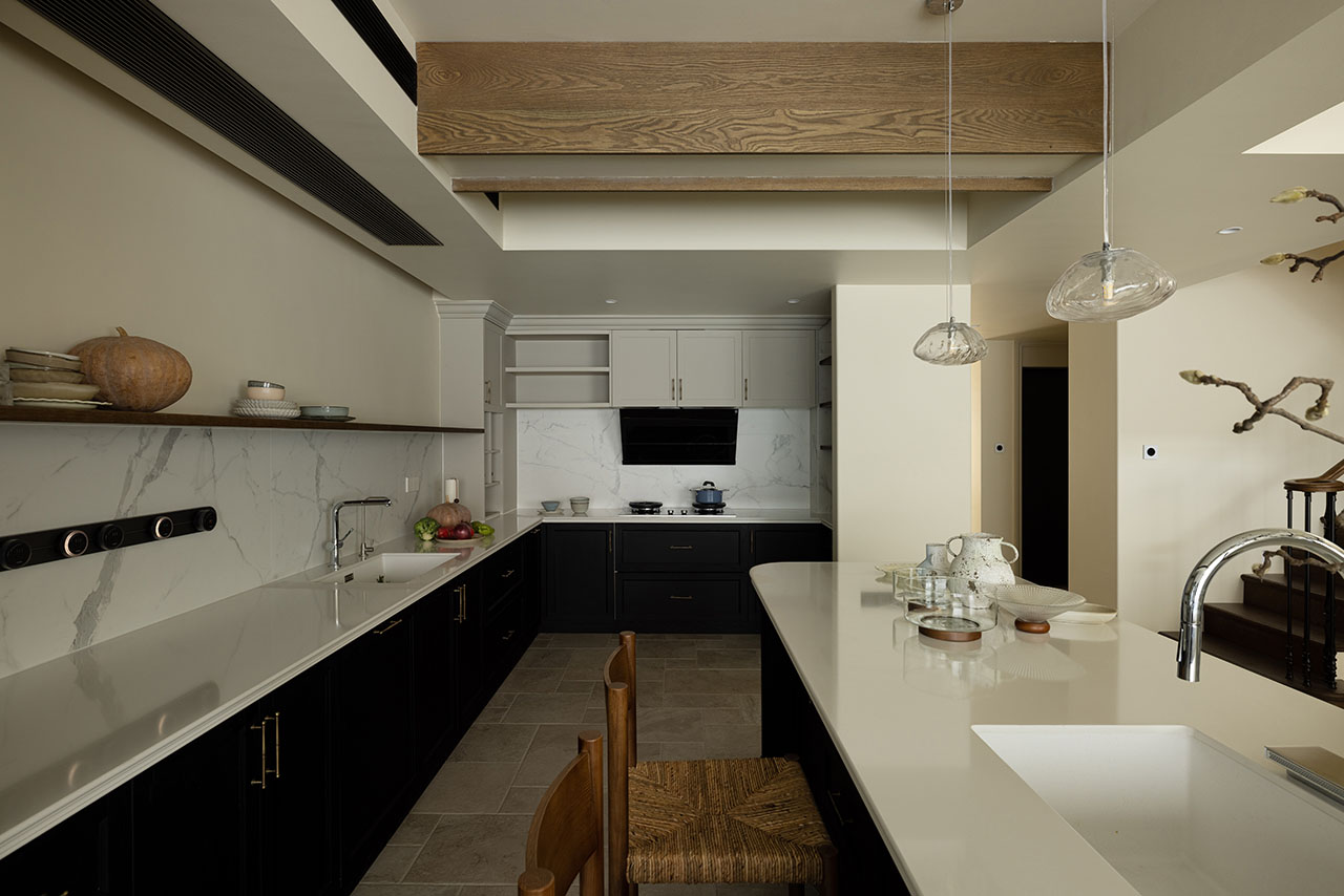 以中岛台作为空间重心重构的餐厨空间,对应了现代居家空间流动性的需求,在浅调空间里,深色橱柜的设计反而让空间有了视觉锚点。精准的柜体处理让收纳系统隐于无形,当视线穿过中岛台上方的线性吊灯,在台面上洒下的几何光晕,皆成为空间叙事的动态注脚,实用主义与诗意美学在烟火气中达成默契共生。