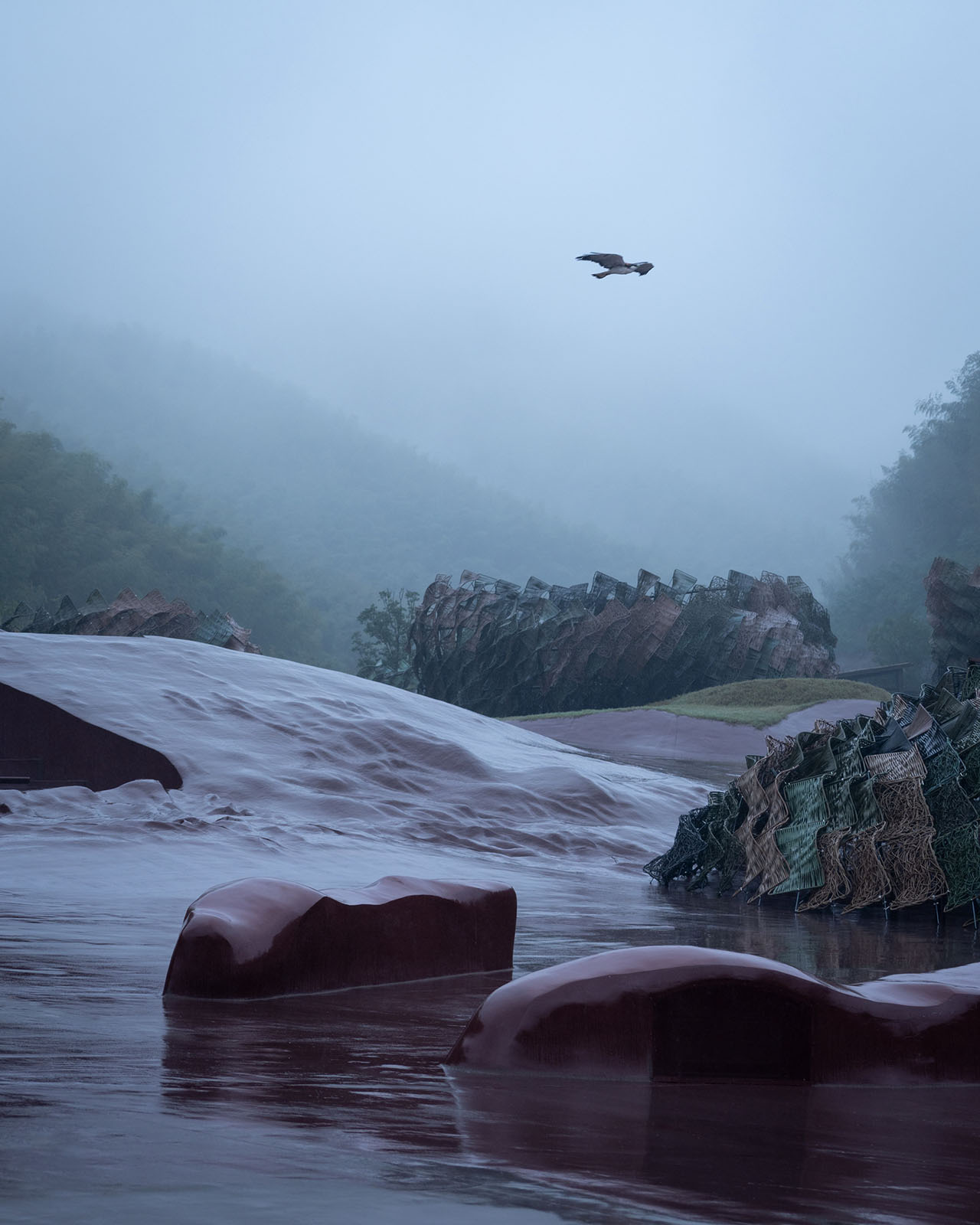 另一条谷地与剧场所在的山谷垂直,向竹林深处延伸,随即融入山体,鸟舍沿着宁静的谷地展开,与外部世界温和地隔离。多变的地形拓展了舞台——群集的白鹳将从狭长的山谷中现身,伴随声光效果,象征戏剧的高潮阶段。