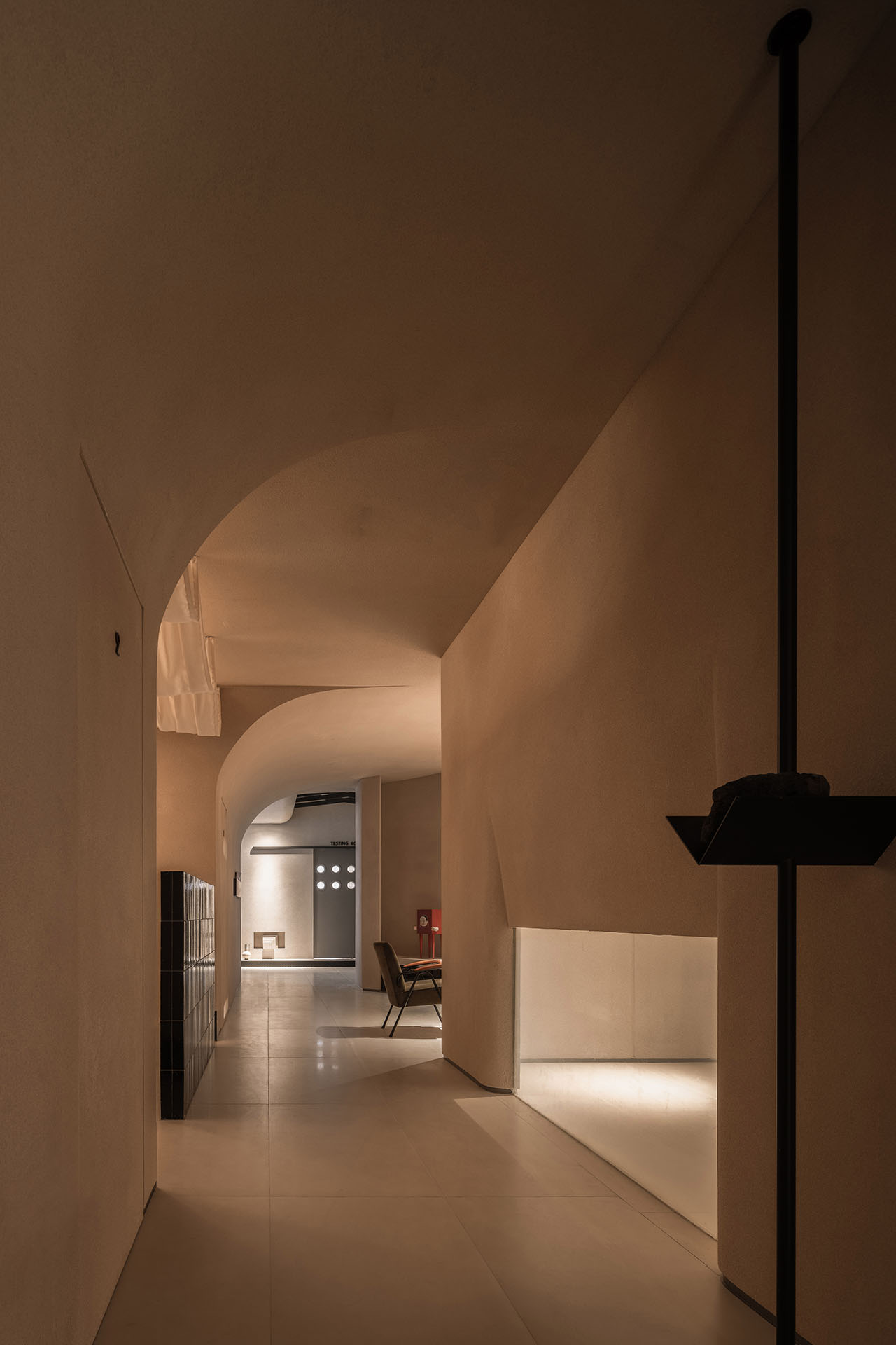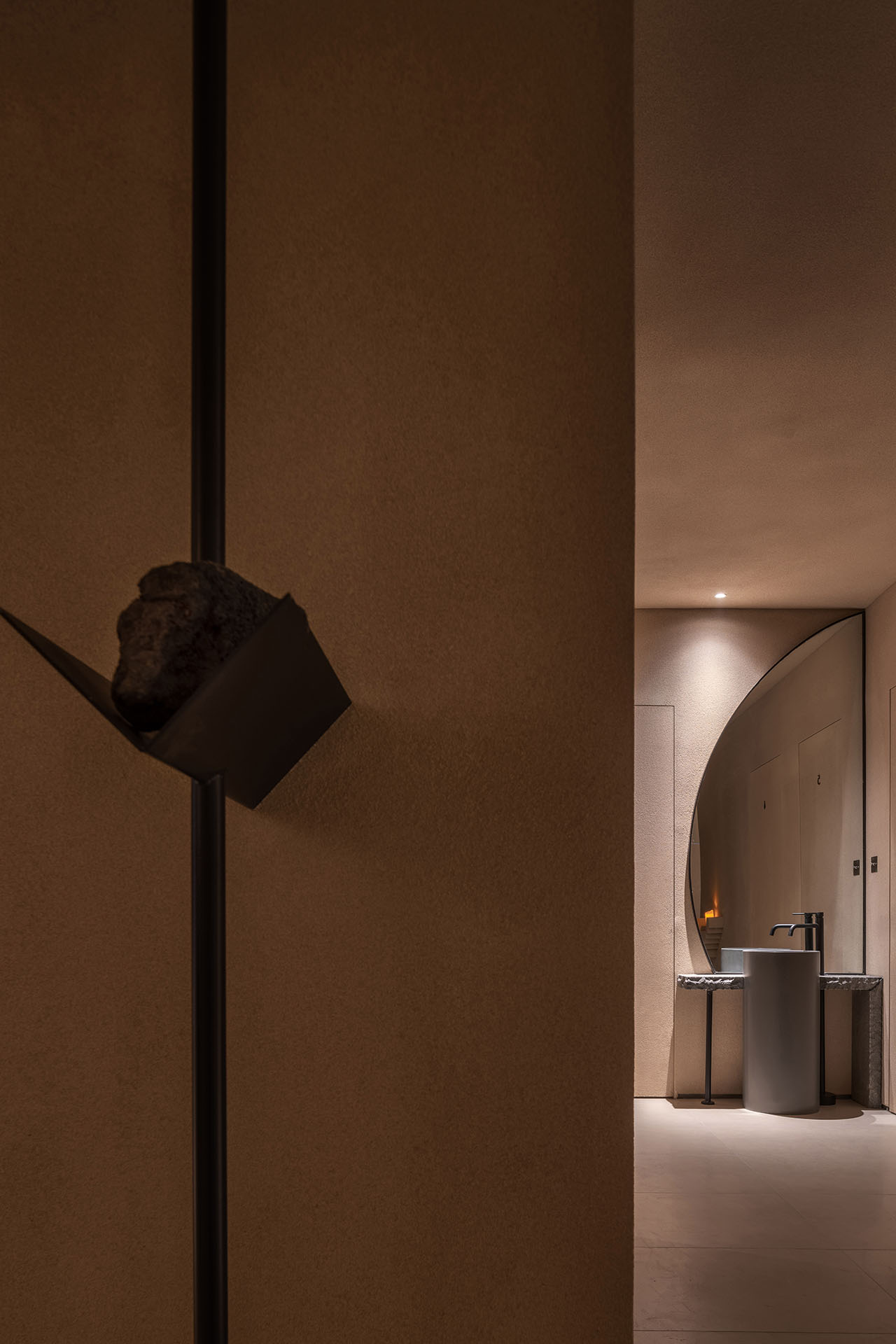 在公共空间与私密皮肤管理护理室之间,有着公共休憩区的过渡,满足停留、等待、冥想。空间大小的切换,形体结构的变化,体现出的节奏律动混合开闭之间的频率,回应生命的自然状态——皮肤毛孔的呼吸。