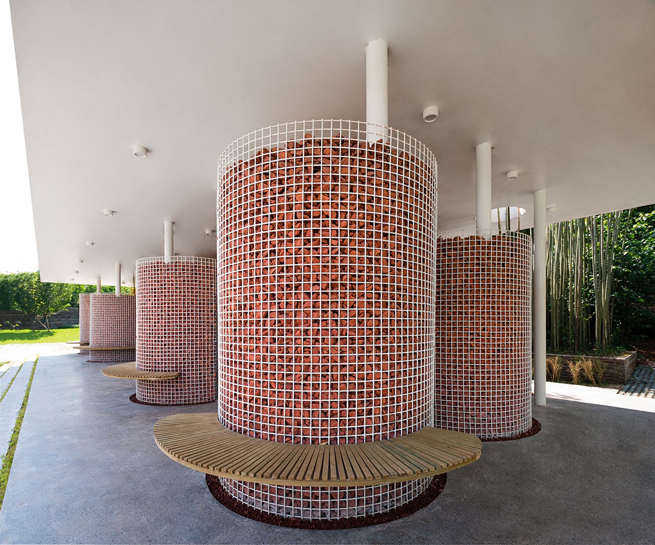 在钢构圆柱撑起的矩形大屋顶下,一个个石笼围卷的圆筒错落排布,形成了十个独立卫生间,正中间稍大的圆筒是残疾人卫生间,后方还单独对称设置了两个男士专用小解隔间。