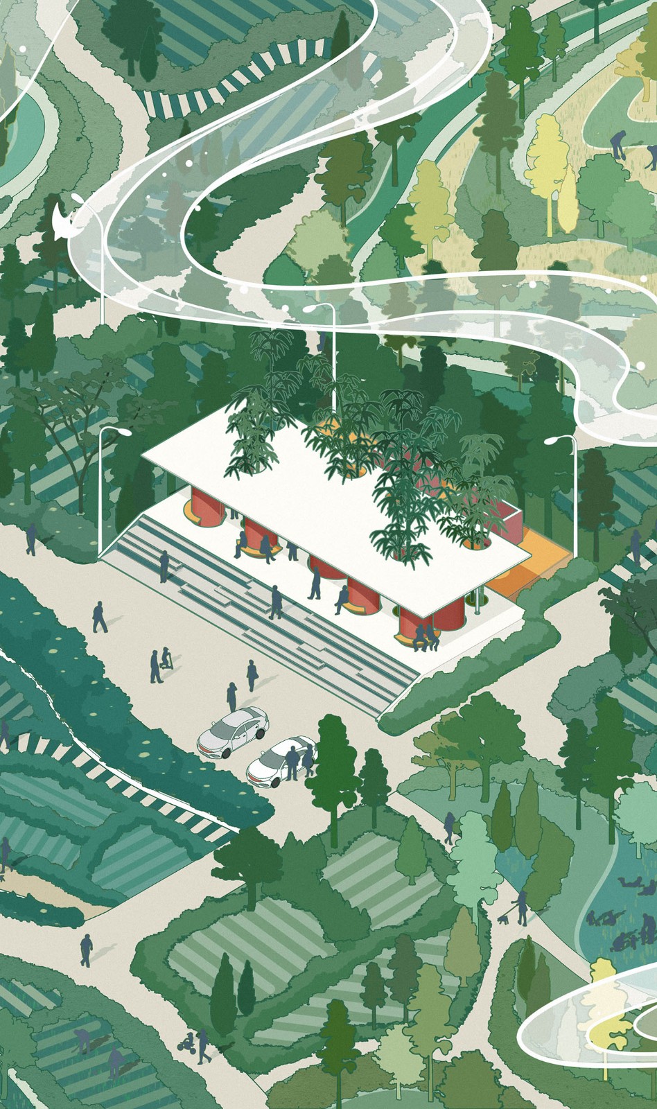 卷厕可以进一步实现其作为公共空间的属性,而非刻板印象中被人嫌弃的场所。建筑与停车场有2.2米高差,设计师通过景观草植与踏步结合的大台阶将人流引导至厕所。