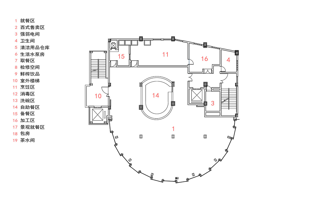 省医餐厅楼2004年的改造已经在6层主体结构的西侧,加建了一个半圆形的两层钢结构作为就餐空间的补充。但由于其原有的交通、消防、功能以及结构的缺陷等问题一直没有得到根本性的改善,因此本次改造需拆除后架的半圆形结构,将半圆形的体量改建成五层,同时增加一个疏散楼梯和观光电梯,以满足当前及未来的个性化需求。改建的五层仍采用半圆形体量,以圆润的姿态,迎接来自内庭院所有方位的视线,形成视觉焦点,同时强化整体空间连续、延绵、渐变的特征。